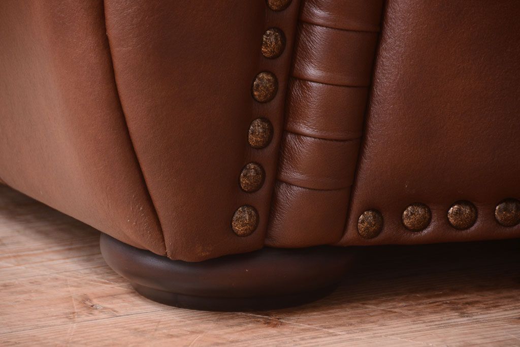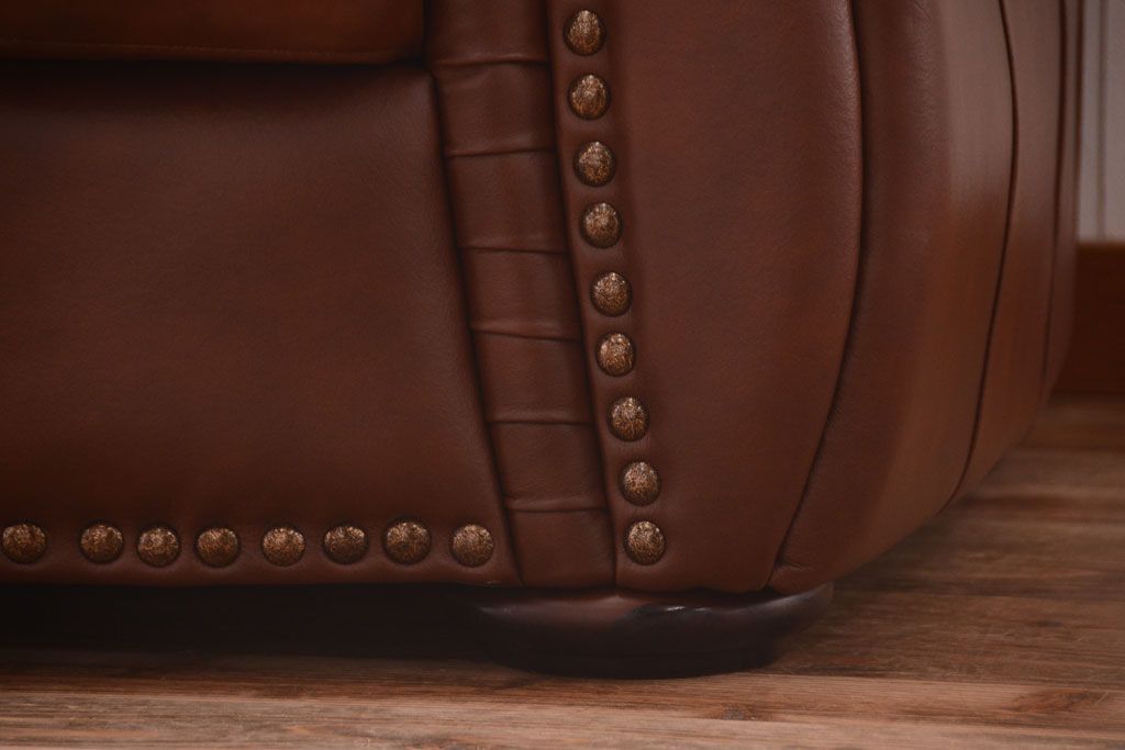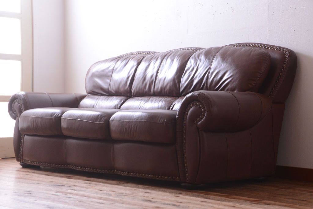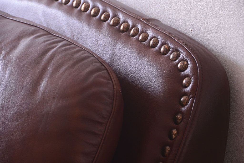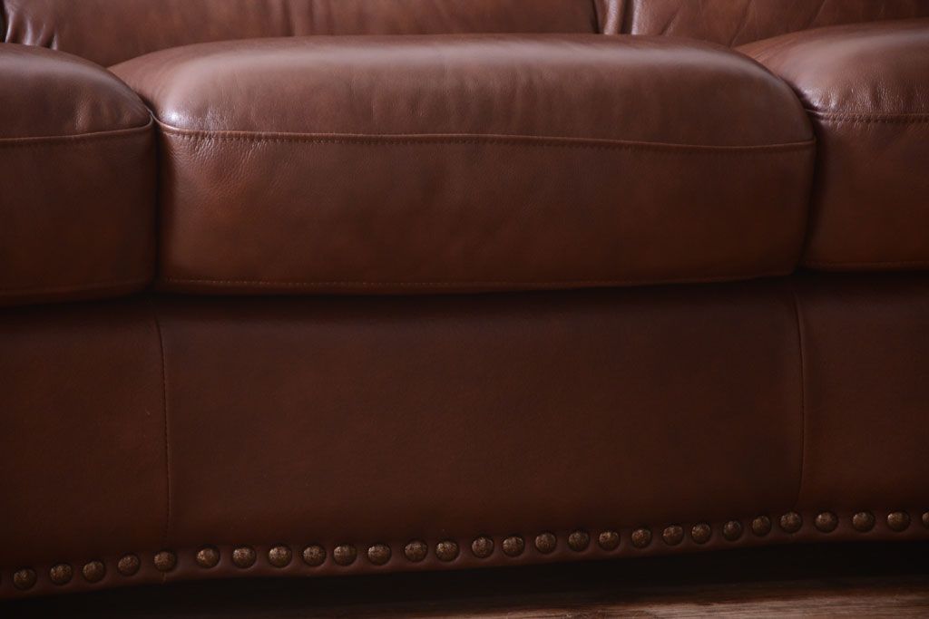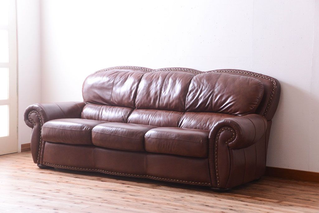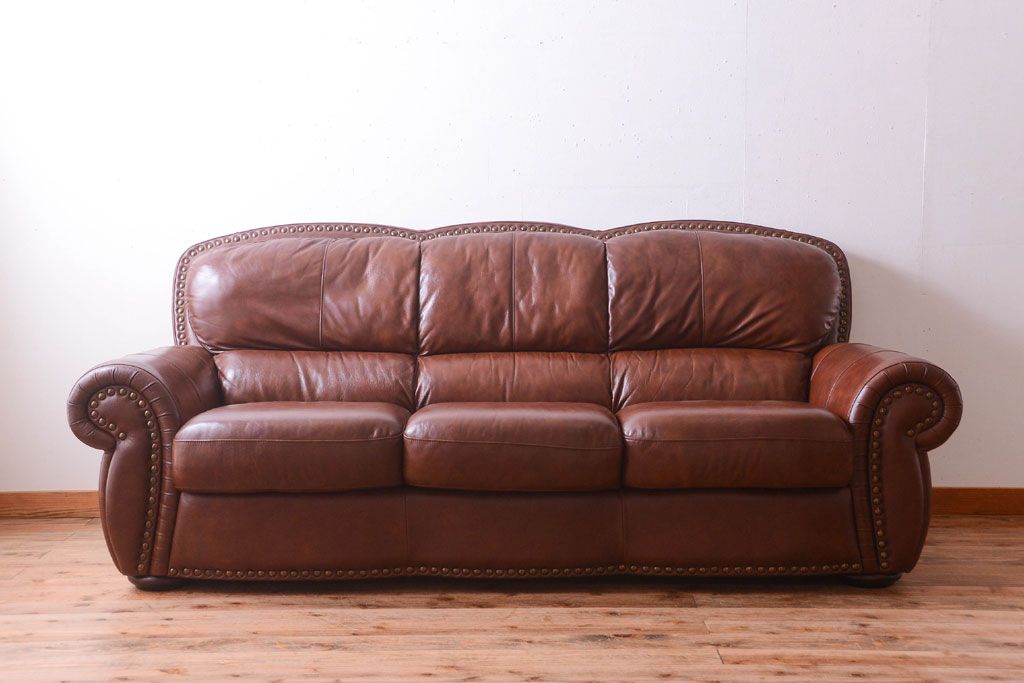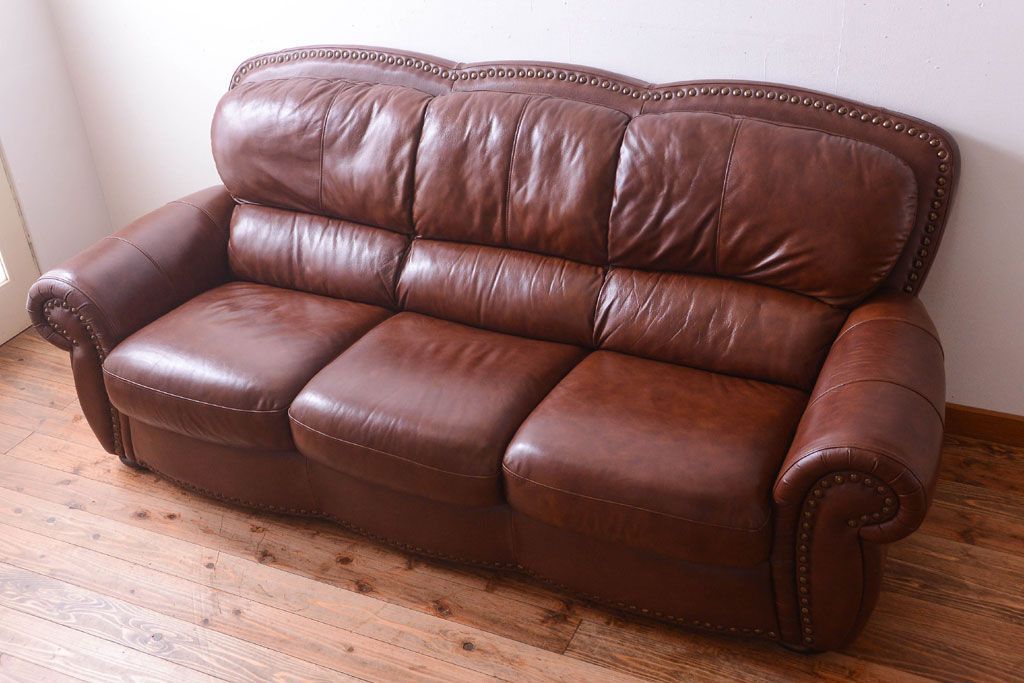 中古 イタリア製 本革 トリプルソファ(3人掛けソファ)です。 ビンテージスタイルのインテリアにおすすめな、 イタリア製のトリプルソファです。 本革製のお品です。 大きな鋲がおしゃれな一品です。 【椅子の座り心地について】(身長154cmの女性スタッフの場合) 座面クッションはやや柔らかめです。 背もたれはとても柔らかいです。 座面に奥行きがある為、座って背もたれに寄りかかると、 頭がやや上を向いて、足が浮きます。 背もたれ・座面共にクッションの取り外しはできません。本体に縫い付けられています。 多少の汚れ・ダメージ等ありますので、画像を参考にお願い致します。 使用上問題のあるダメージはありません。 ■座面までの高さ 480mm ■重量 約81kg