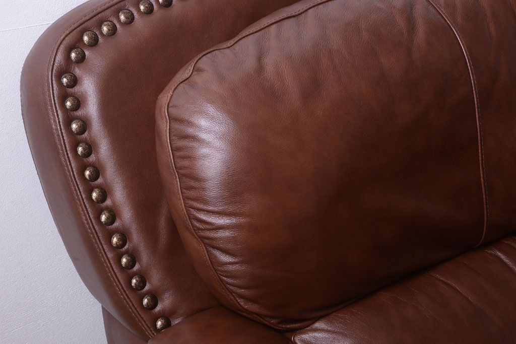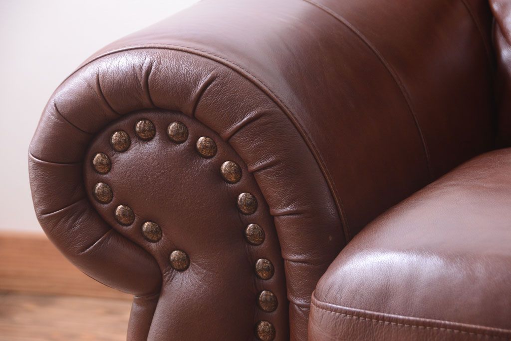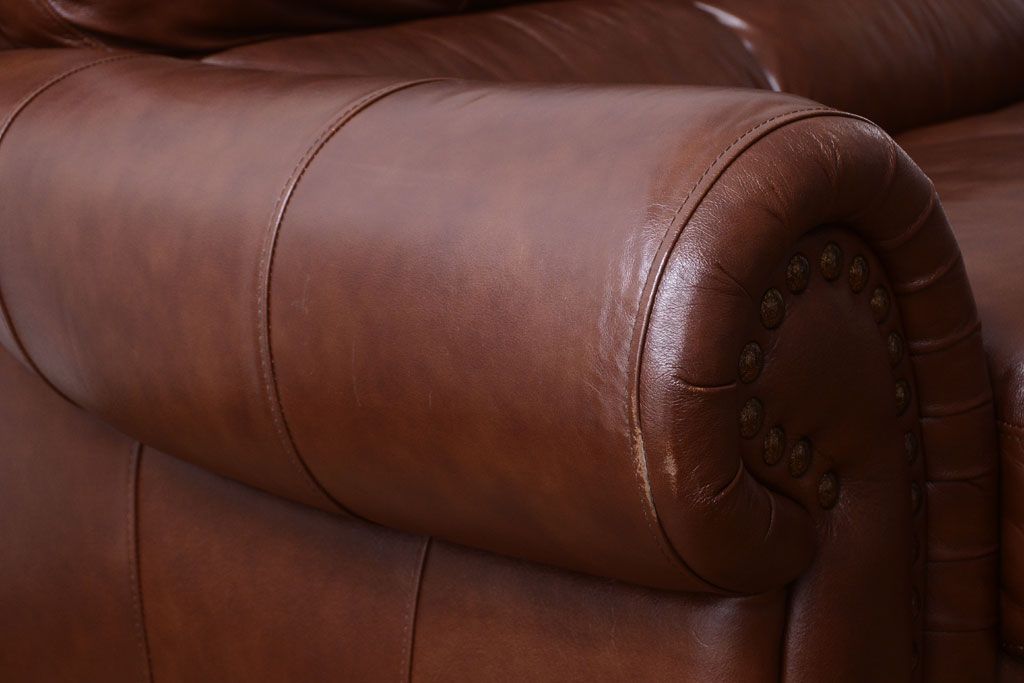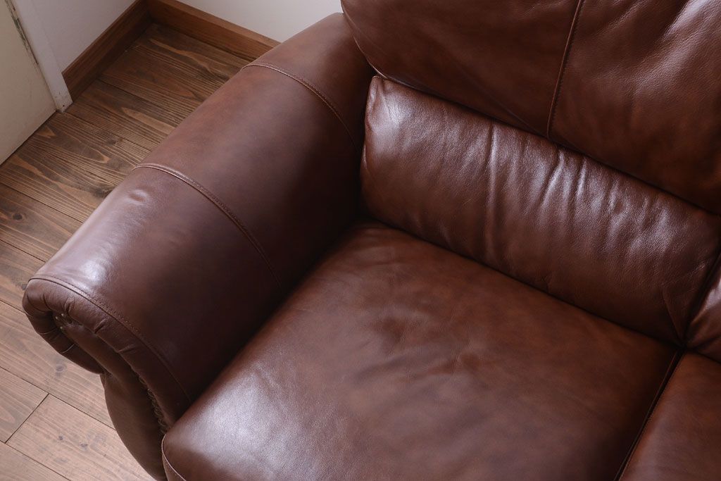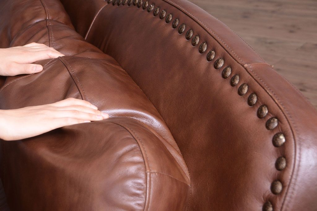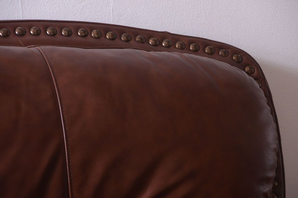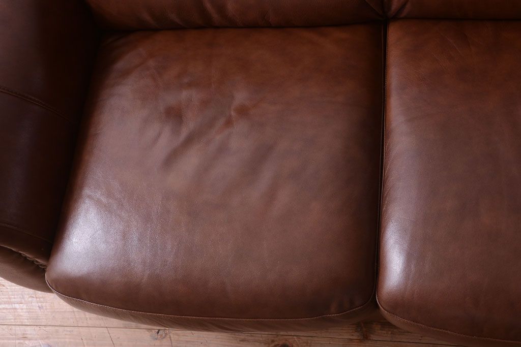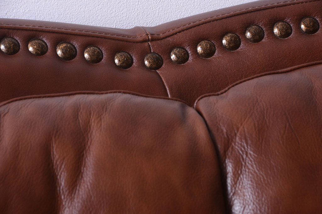 中古 イタリア製 本革 トリプルソファ(3人掛けソファ)です。 ビンテージスタイルのインテリアにおすすめな、 イタリア製のトリプルソファです。 本革製のお品です。 大きな鋲がおしゃれな一品です。 【椅子の座り心地について】(身長154cmの女性スタッフの場合) 座面クッションはやや柔らかめです。 背もたれはとても柔らかいです。 座面に奥行きがある為、座って背もたれに寄りかかると、 頭がやや上を向いて、足が浮きます。 背もたれ・座面共にクッションの取り外しはできません。本体に縫い付けられています。 多少の汚れ・ダメージ等ありますので、画像を参考にお願い致します。 使用上問題のあるダメージはありません。 ■座面までの高さ 480mm ■重量 約81kg