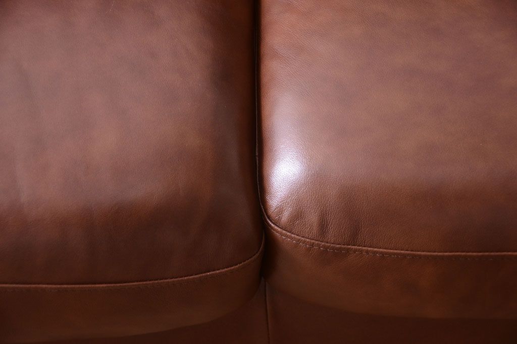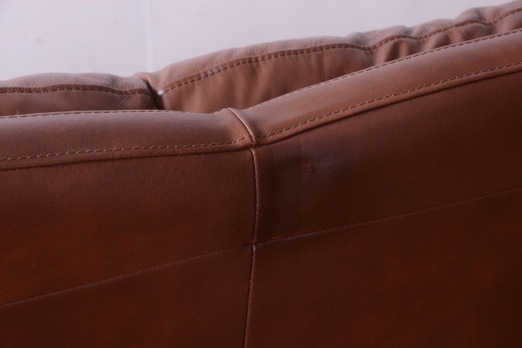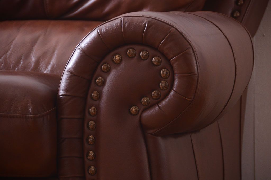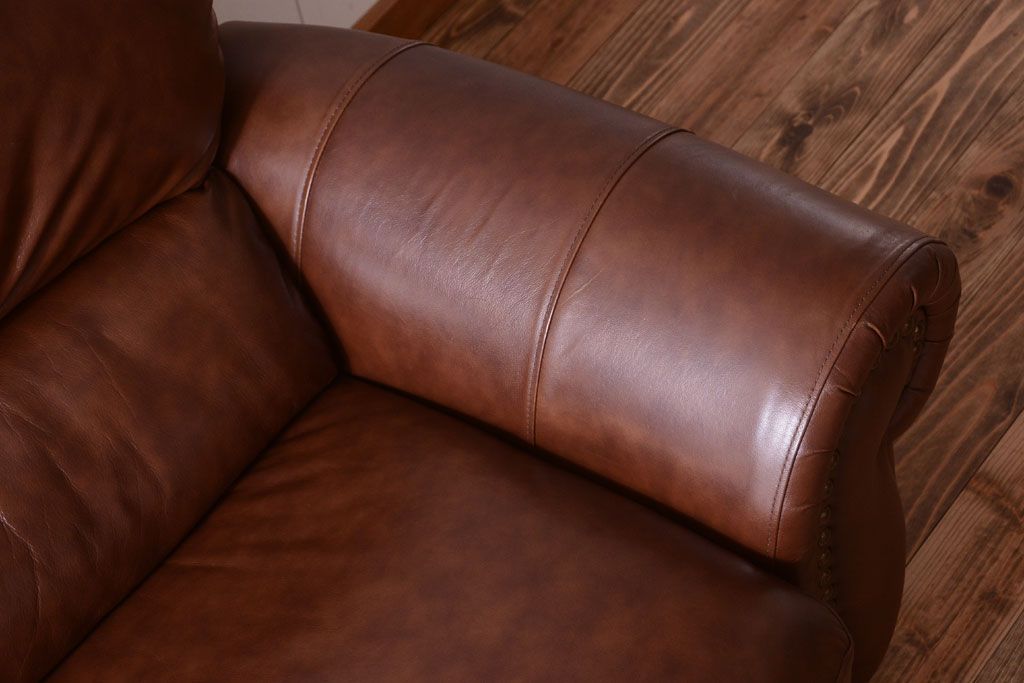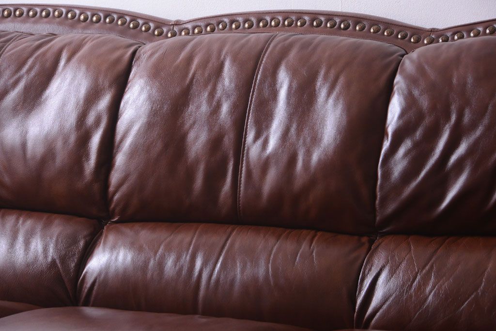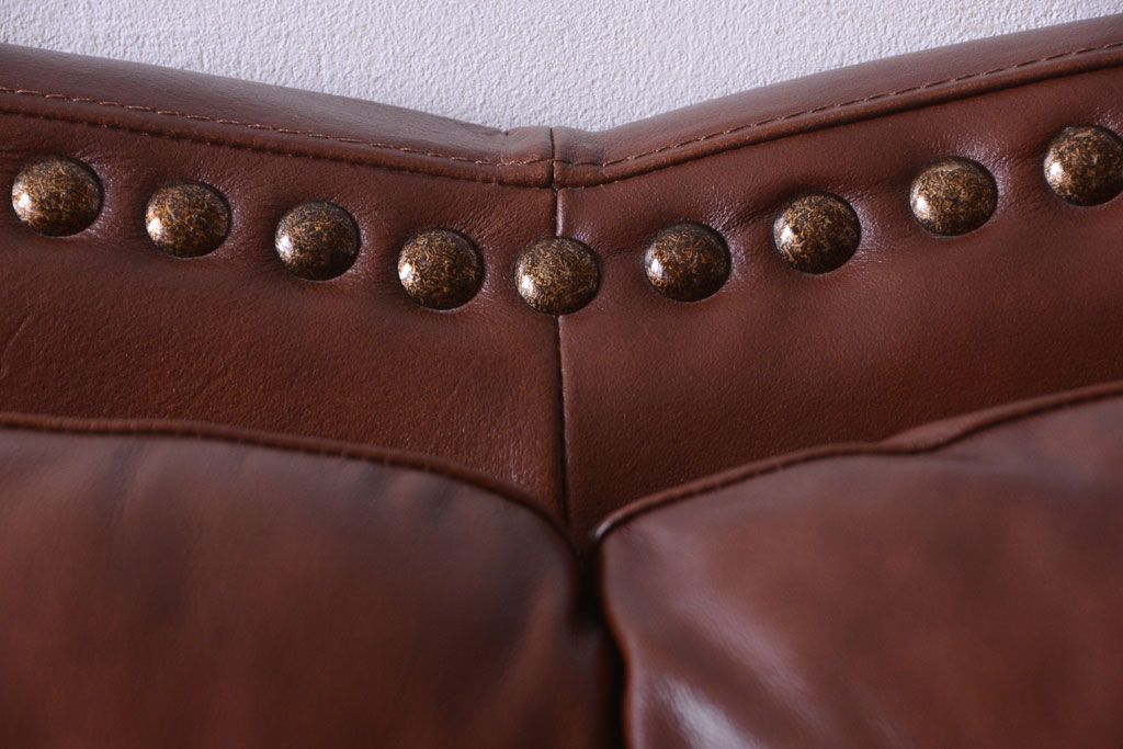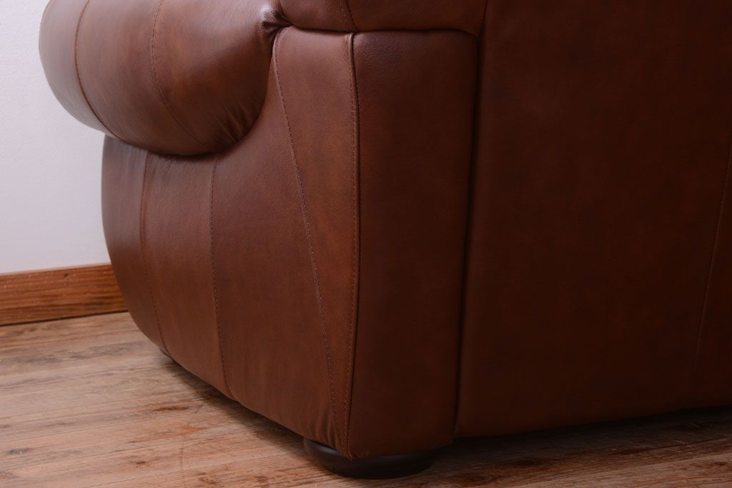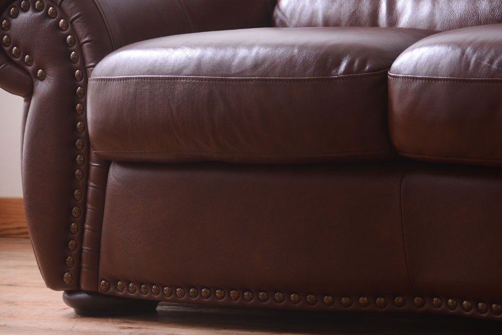 中古 イタリア製 本革 トリプルソファ(3人掛けソファ)です。 ビンテージスタイルのインテリアにおすすめな、 イタリア製のトリプルソファです。 本革製のお品です。 大きな鋲がおしゃれな一品です。 【椅子の座り心地について】(身長154cmの女性スタッフの場合) 座面クッションはやや柔らかめです。 背もたれはとても柔らかいです。 座面に奥行きがある為、座って背もたれに寄りかかると、 頭がやや上を向いて、足が浮きます。 背もたれ・座面共にクッションの取り外しはできません。本体に縫い付けられています。 多少の汚れ・ダメージ等ありますので、画像を参考にお願い致します。 使用上問題のあるダメージはありません。 ■座面までの高さ 480mm ■重量 約81kg