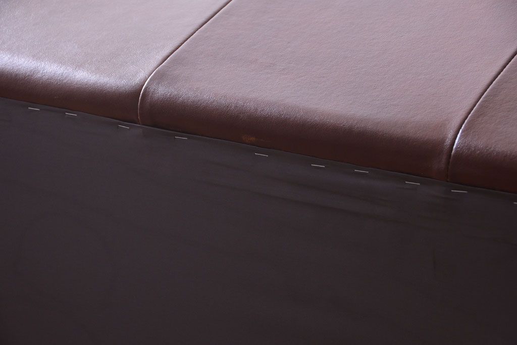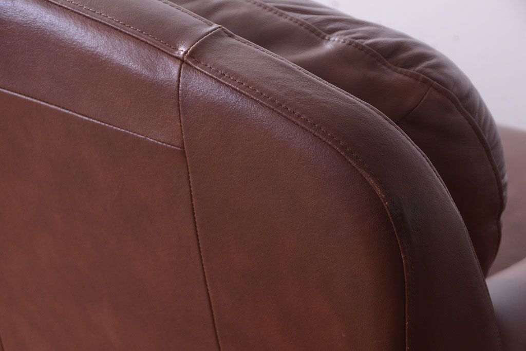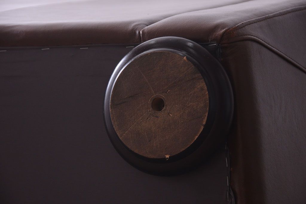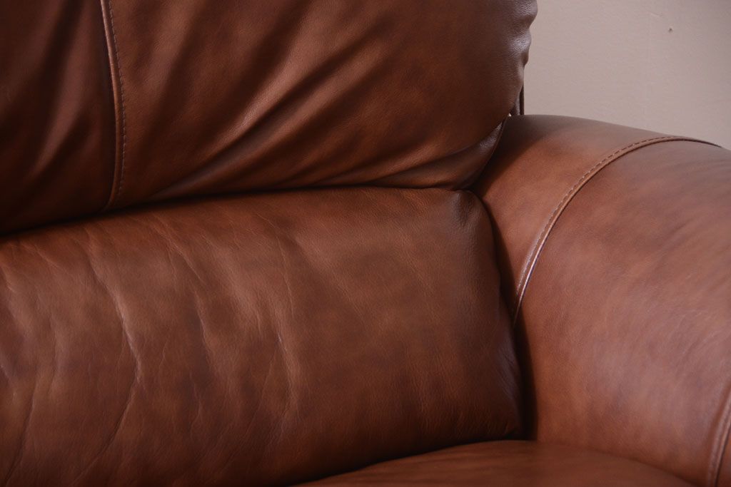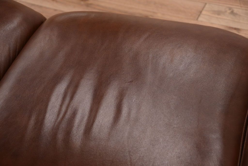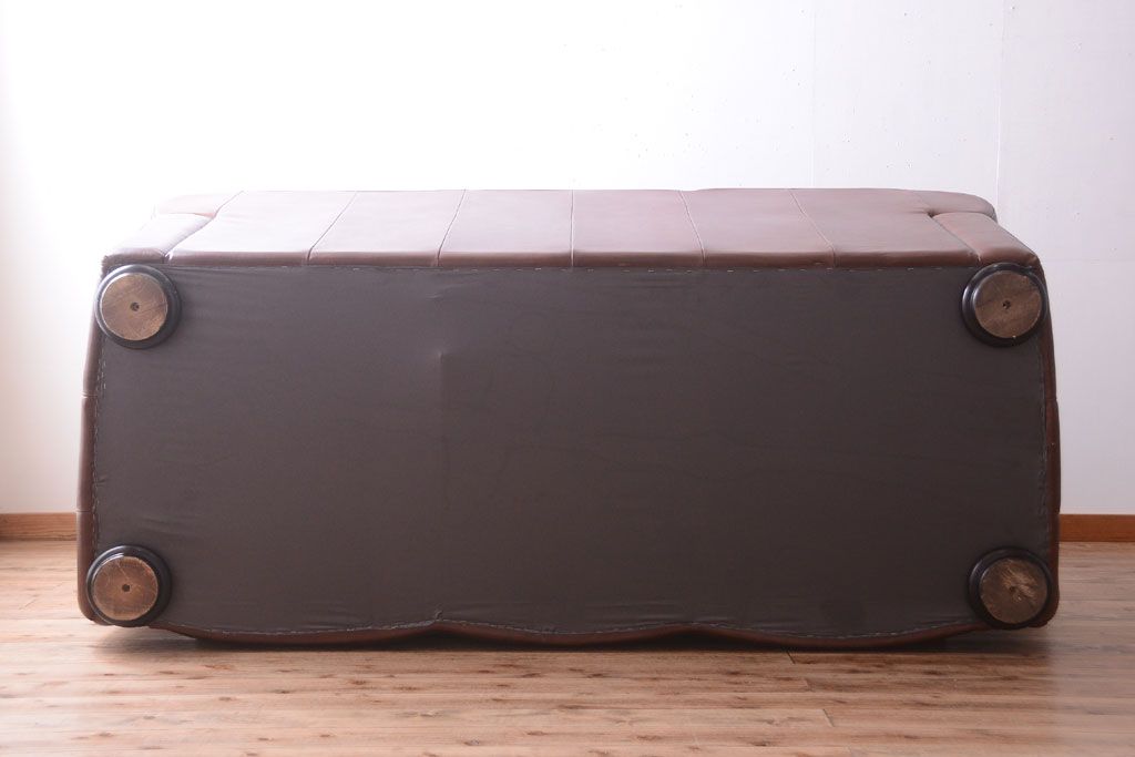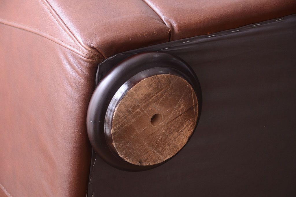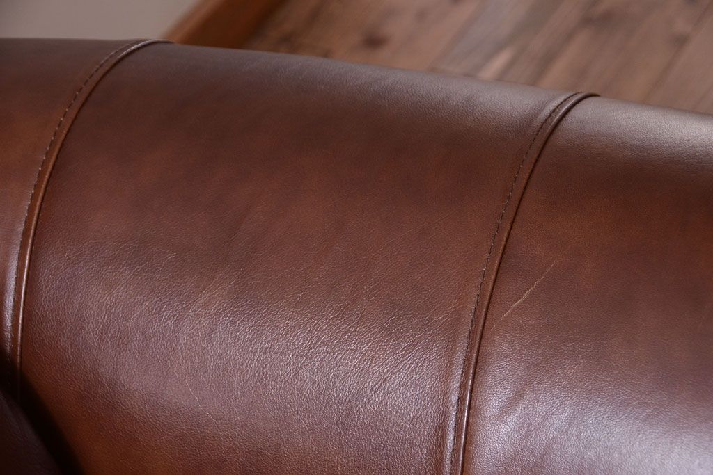 中古 イタリア製 本革 トリプルソファ(3人掛けソファ)です。 ビンテージスタイルのインテリアにおすすめな、 イタリア製のトリプルソファです。 本革製のお品です。 大きな鋲がおしゃれな一品です。 【椅子の座り心地について】(身長154cmの女性スタッフの場合) 座面クッションはやや柔らかめです。 背もたれはとても柔らかいです。 座面に奥行きがある為、座って背もたれに寄りかかると、 頭がやや上を向いて、足が浮きます。 背もたれ・座面共にクッションの取り外しはできません。本体に縫い付けられています。 多少の汚れ・ダメージ等ありますので、画像を参考にお願い致します。 使用上問題のあるダメージはありません。 ■座面までの高さ 480mm ■重量 約81kg