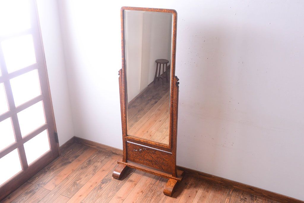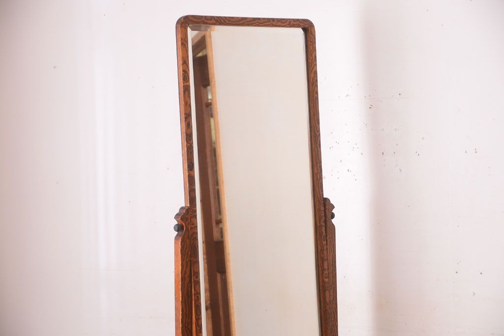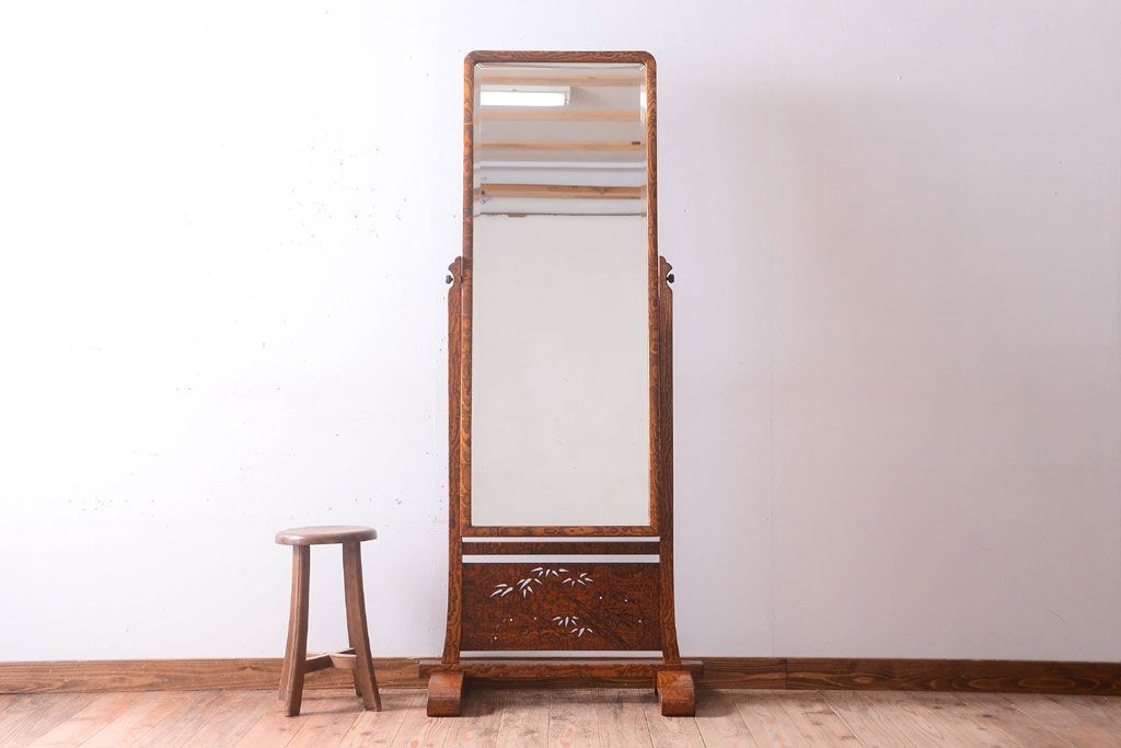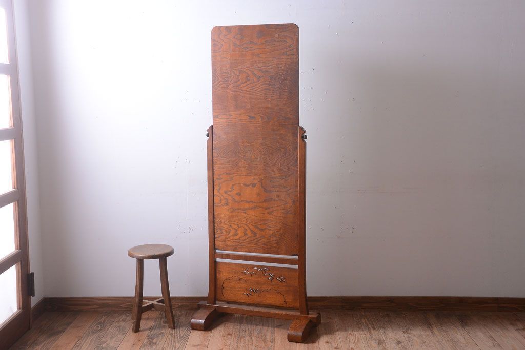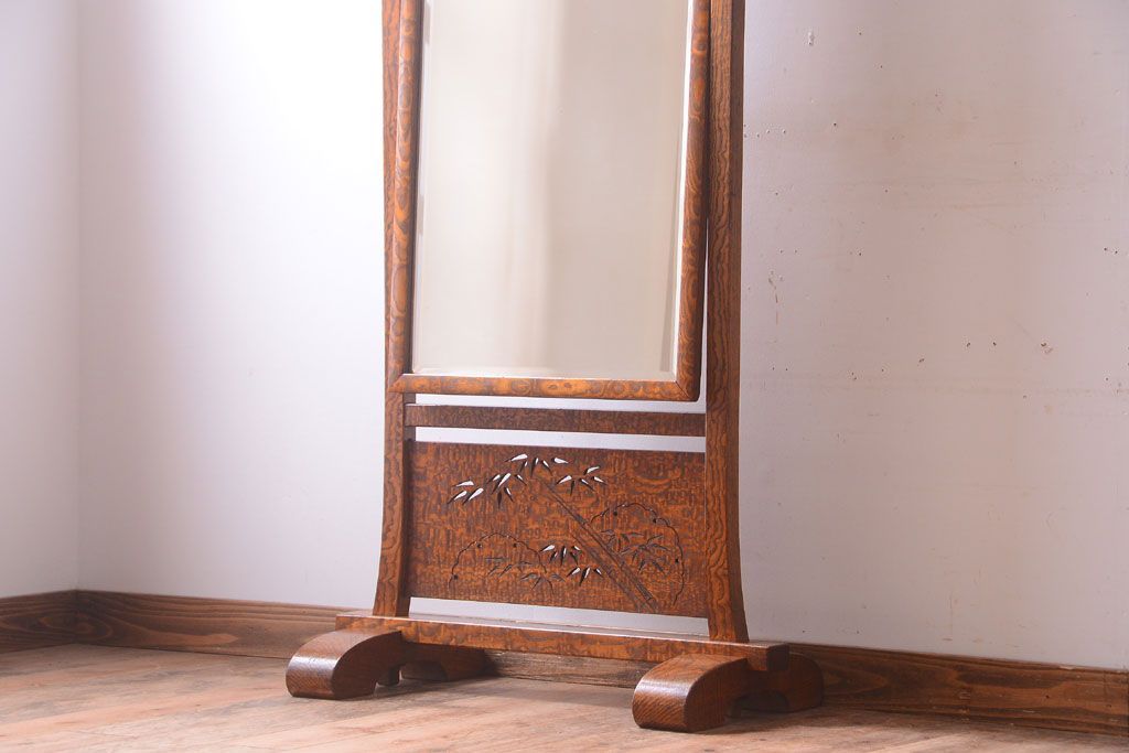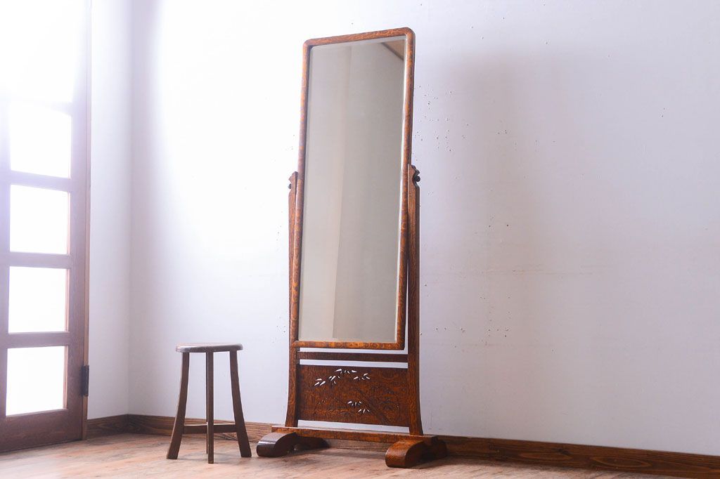 ラフジュ工房> 鏡> 姿見 > アンティーク雑貨 大正昭和期 透かし彫り!古いタモ材のアンティーク姿見(鏡)