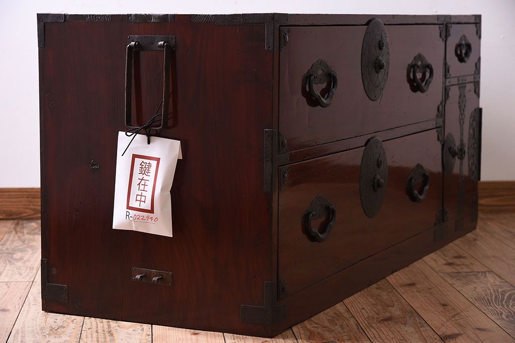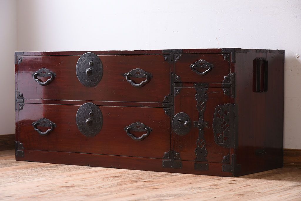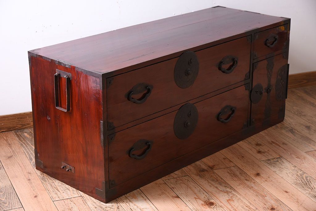 和箪笥> 衣装箪笥 > アンティーク家具 前面栗材!桜丸金具の時代箪笥ローボード(米沢箪笥・衣装箪笥)(1)
