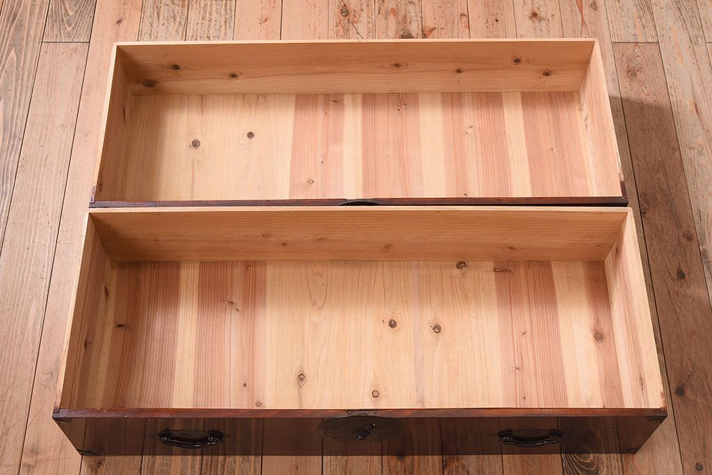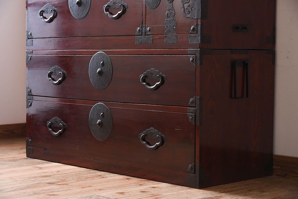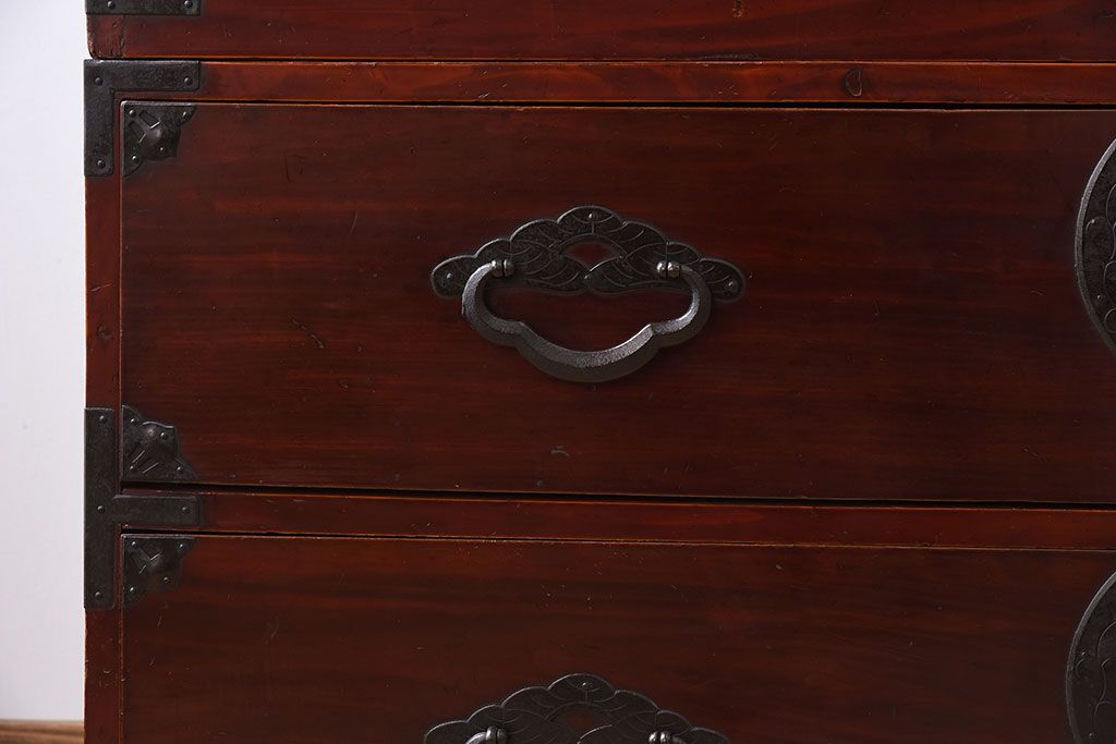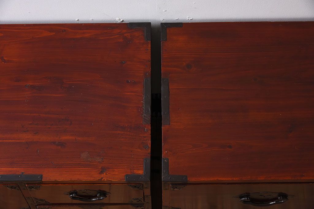 アンティーク家具 古民具・骨董 前面栗材の二段重ね米沢箪笥(衣装箪笥)(2)