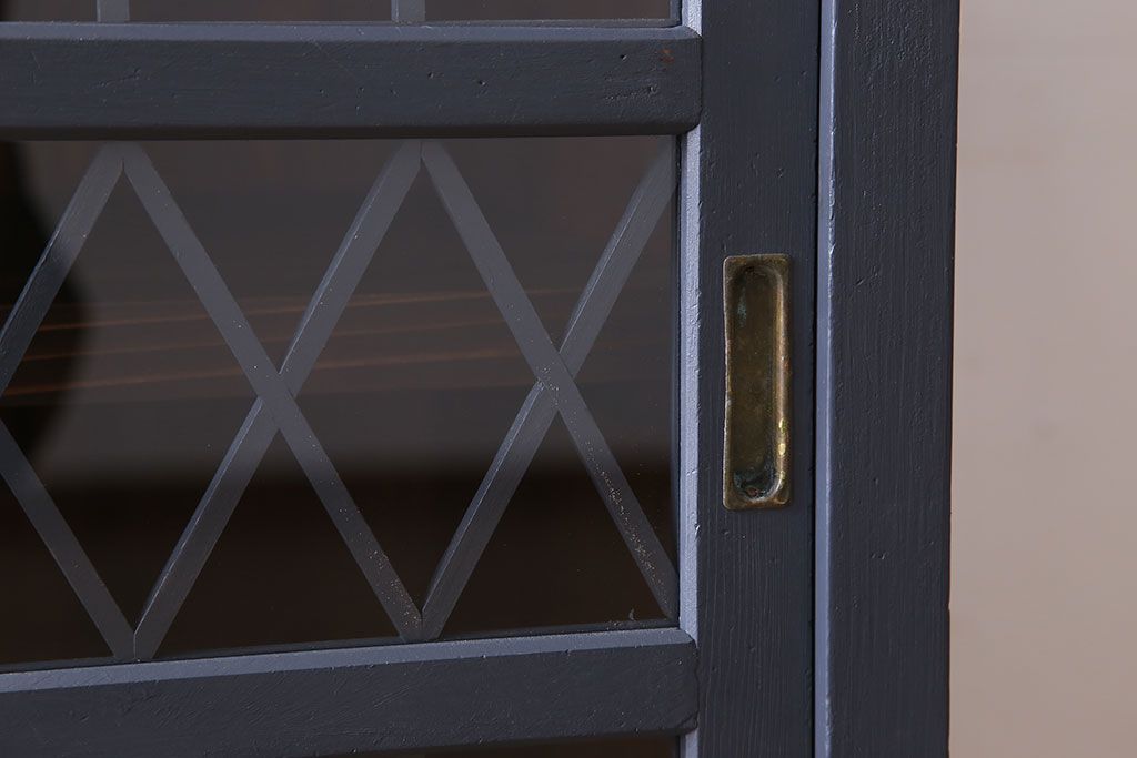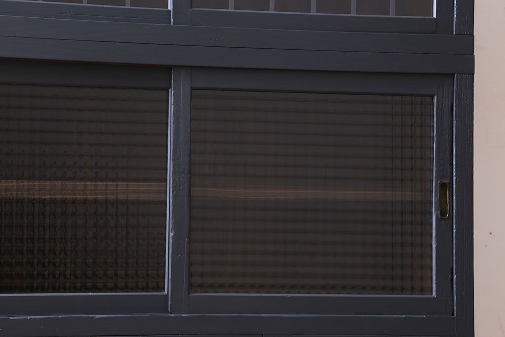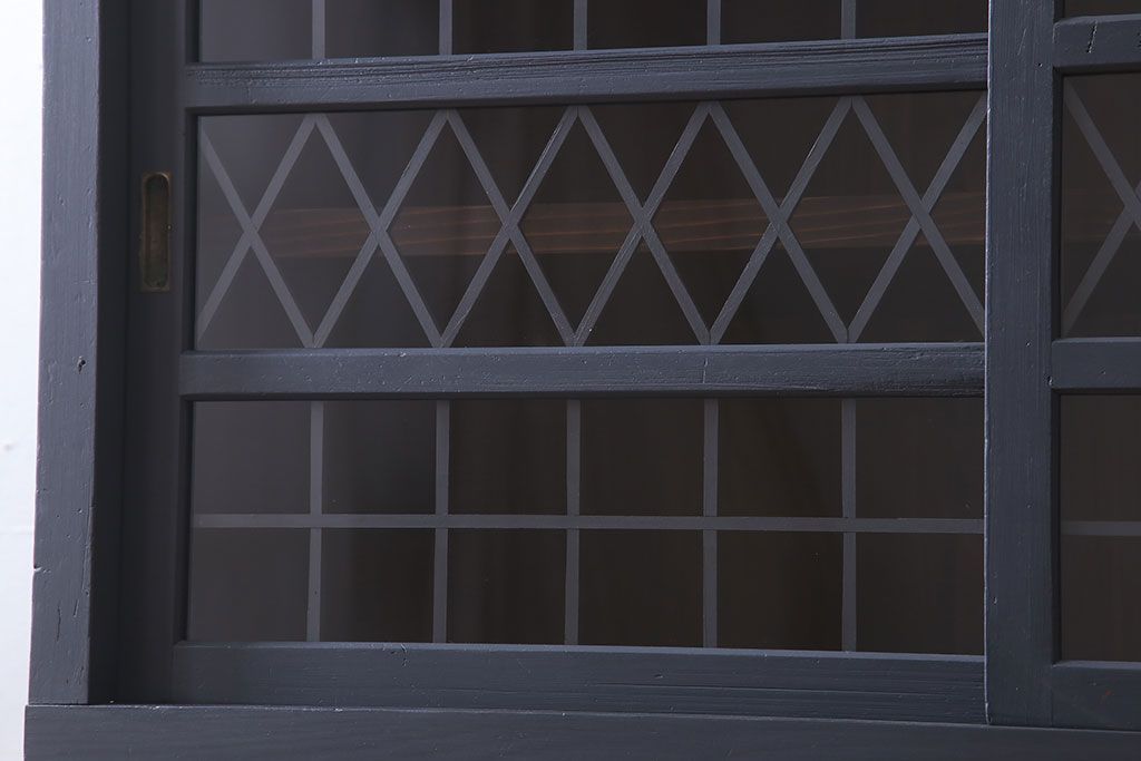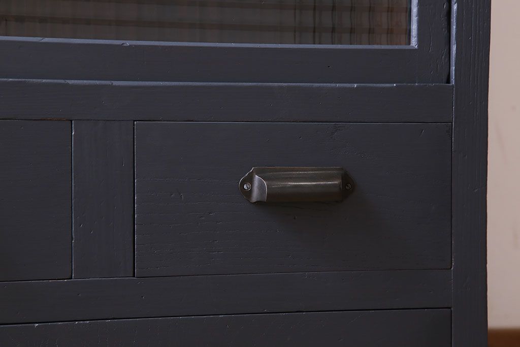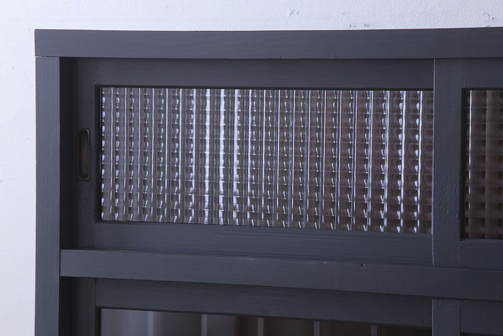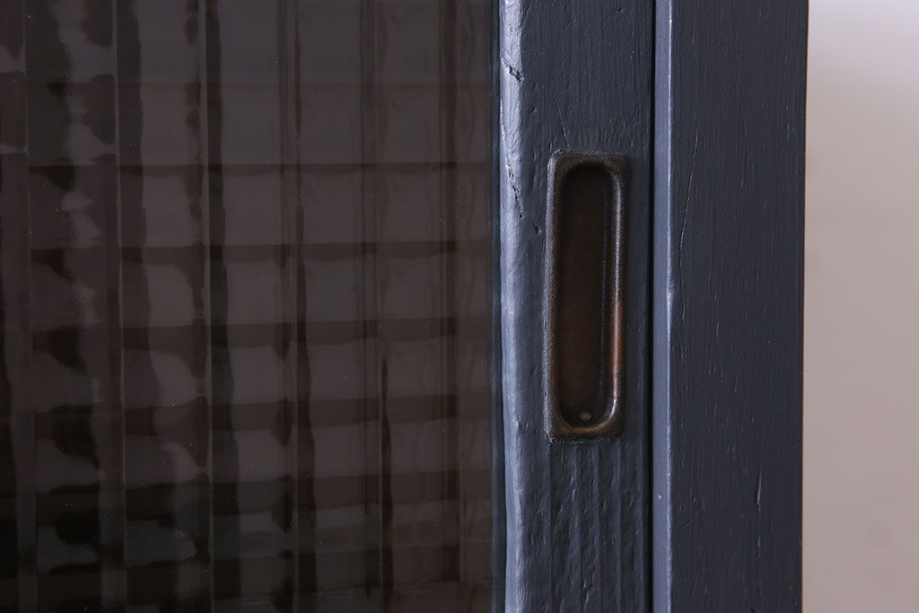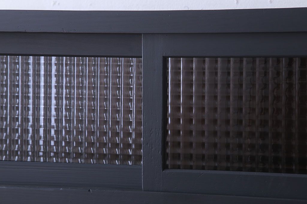 レトロ家具 レトロガラス入り!ダークグレーペイントのアンティーク食器棚
