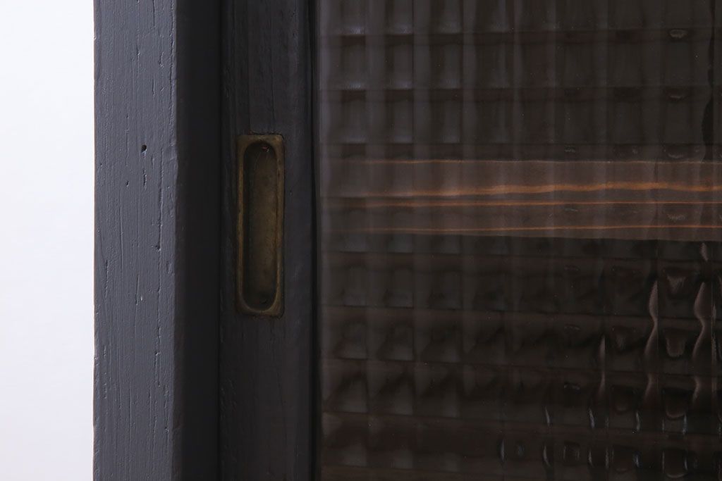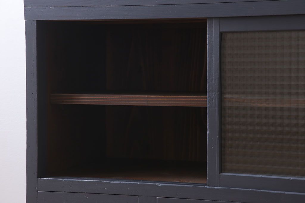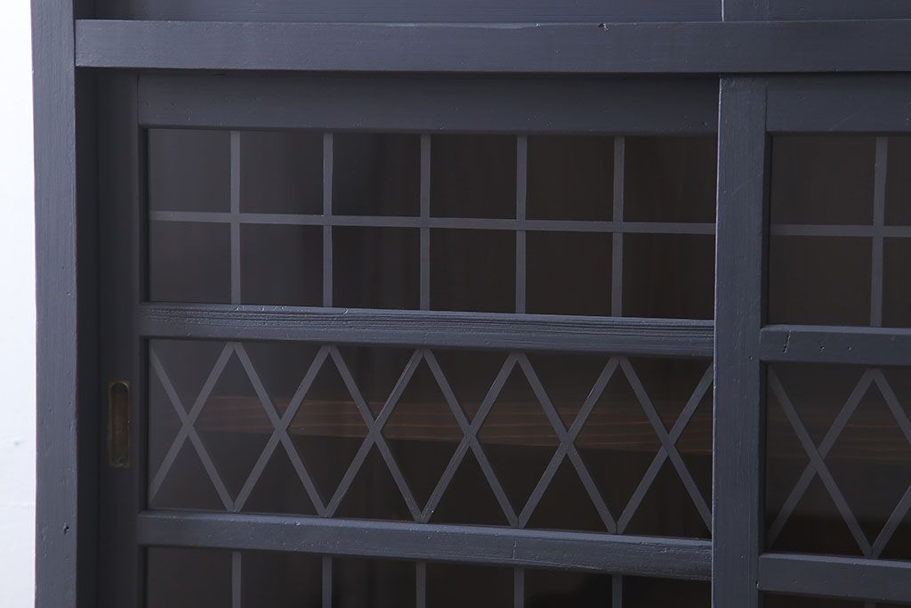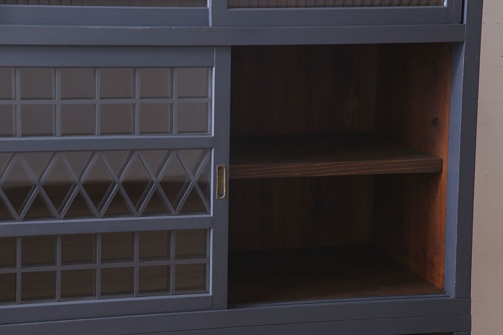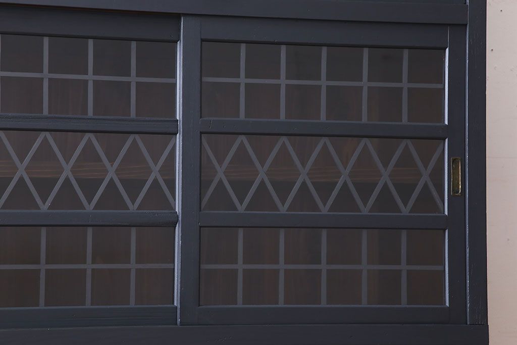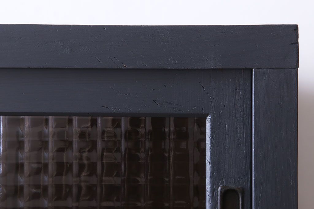レトロ家具 レトロガラス入り!ダークグレーペイントのアンティーク食器棚