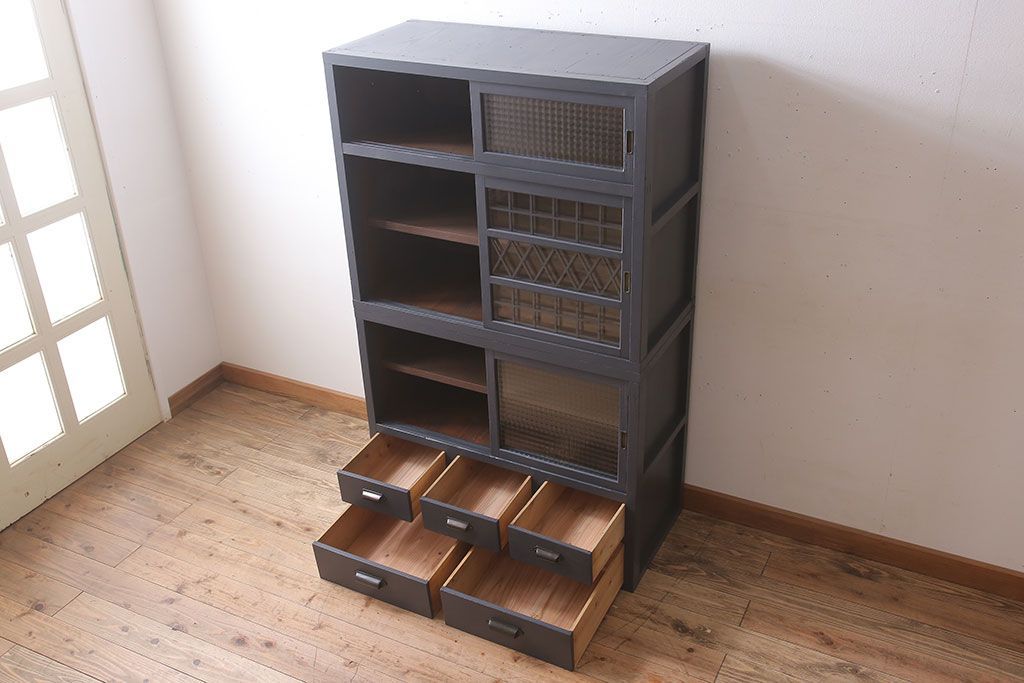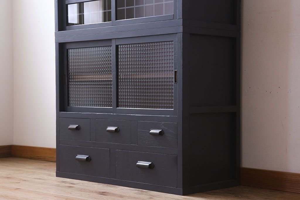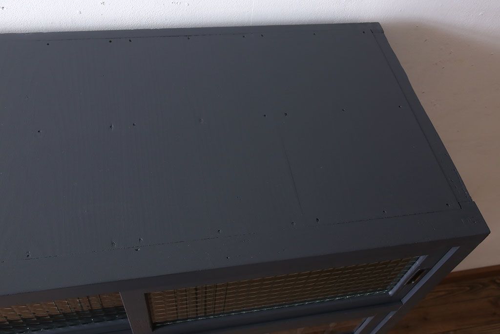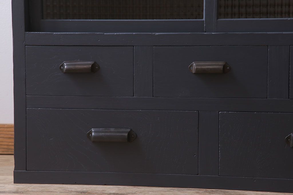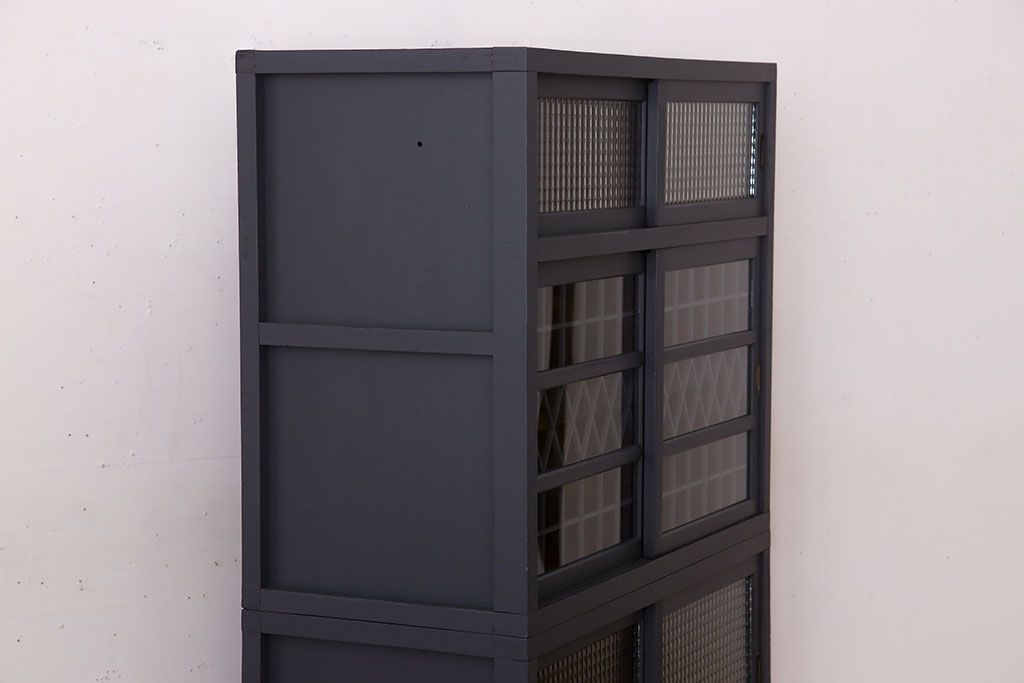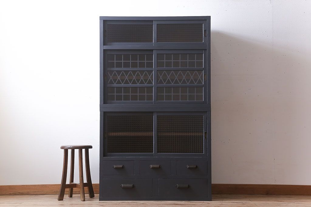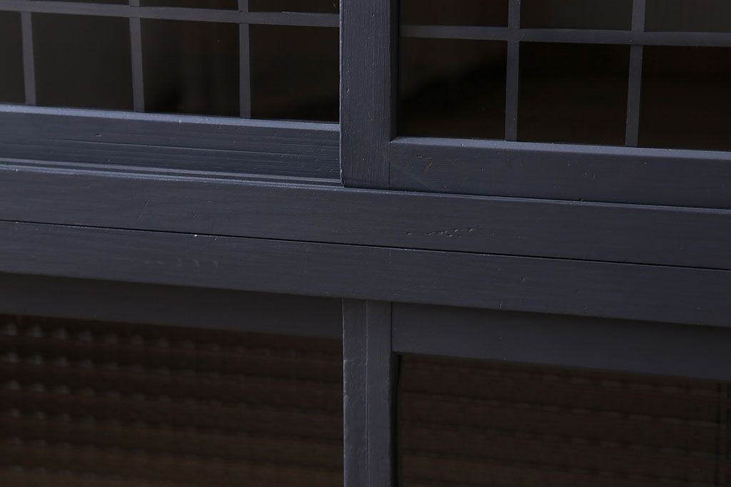 レトロ家具 レトロガラス入り!ダークグレーペイントのアンティーク食器棚