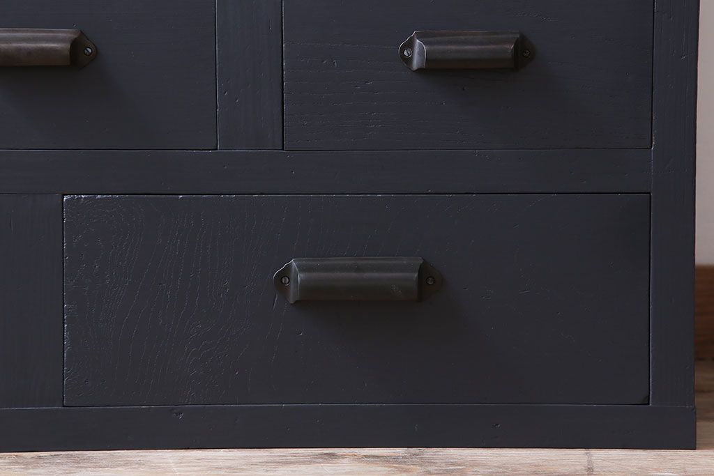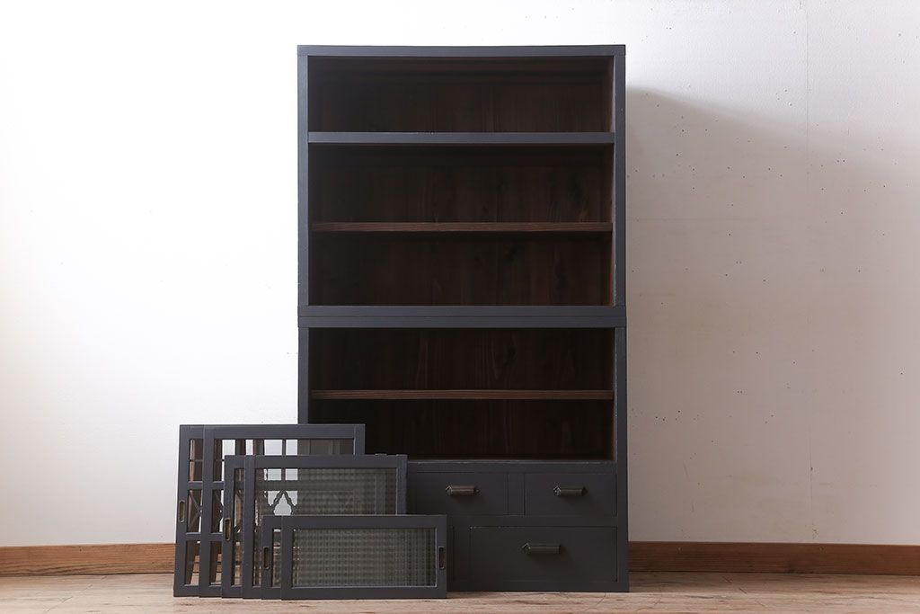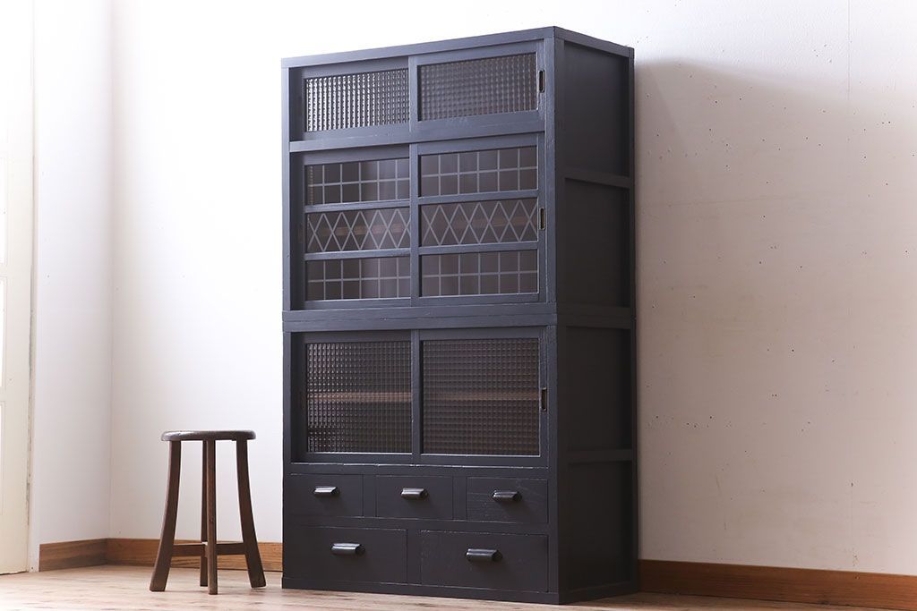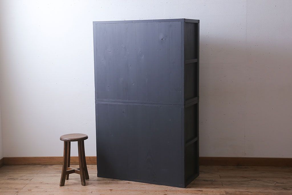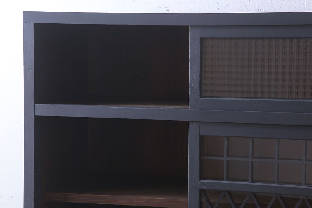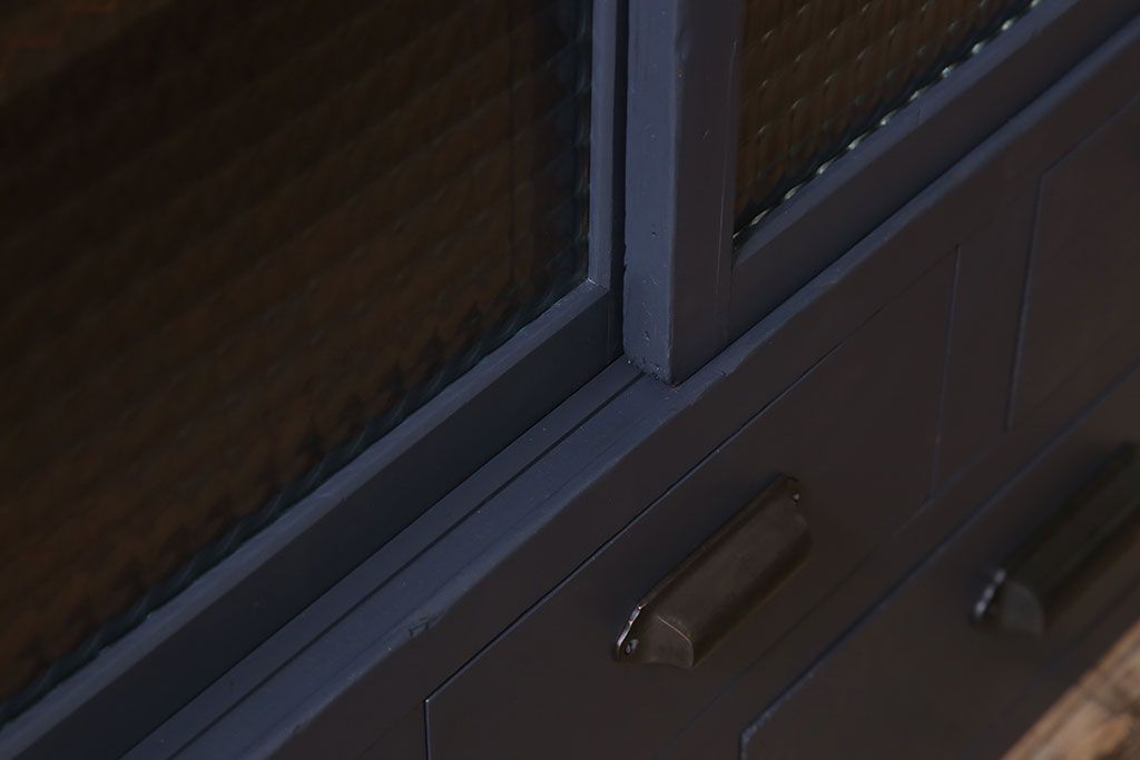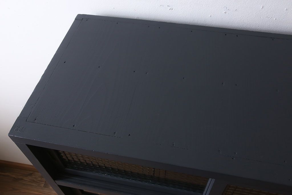 レトロ家具 レトロガラス入り!ダークグレーペイントのアンティーク食器棚