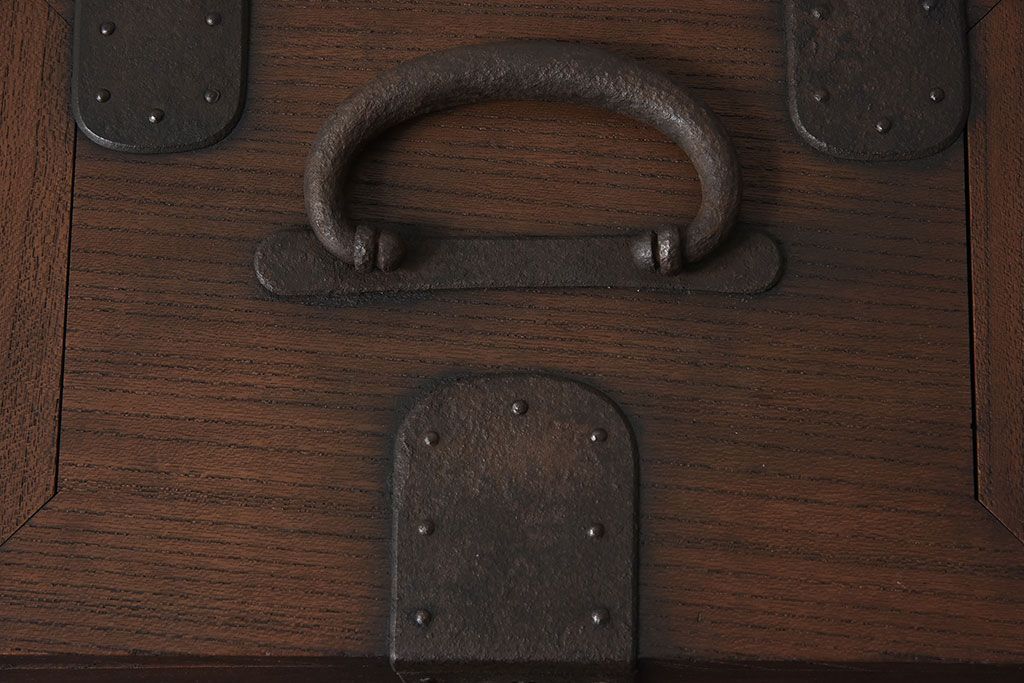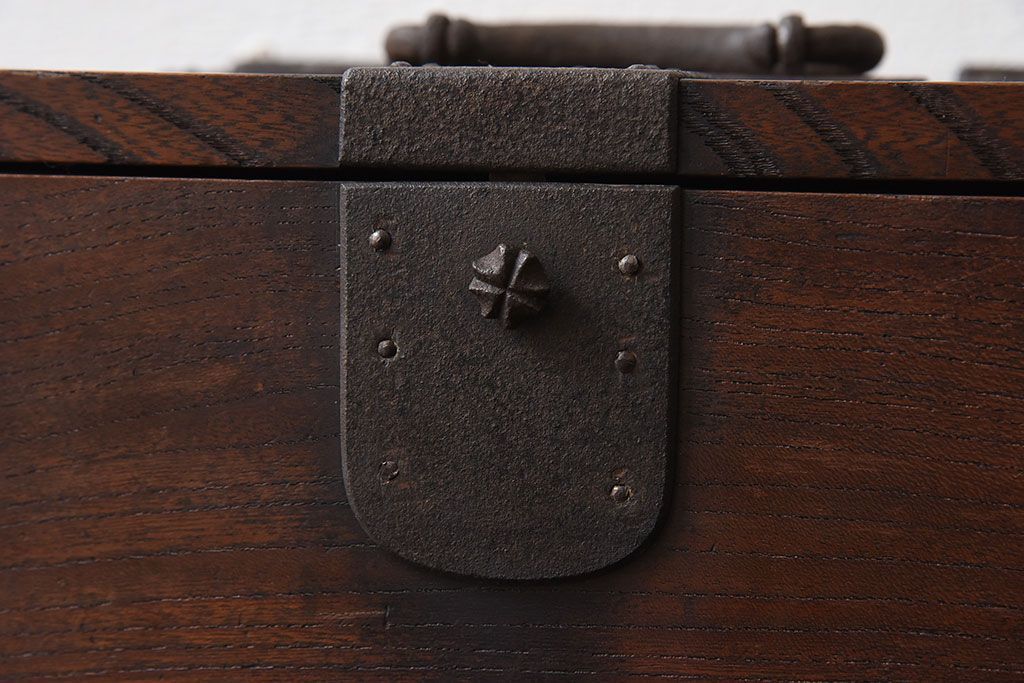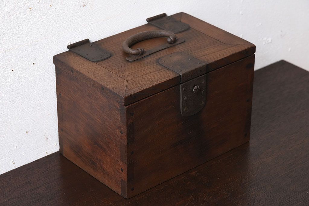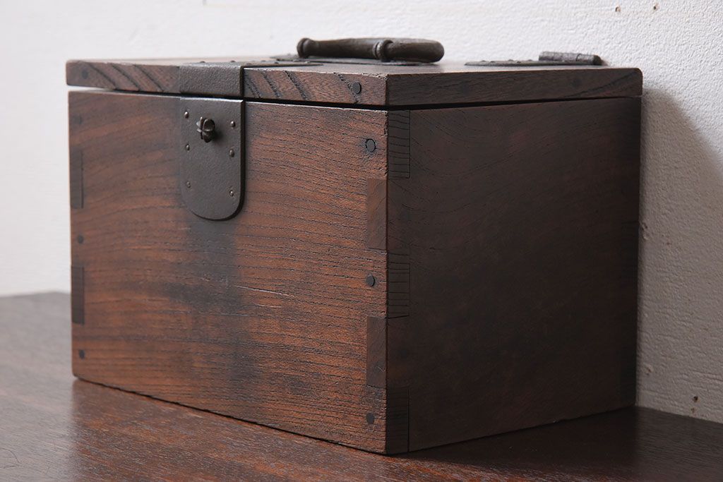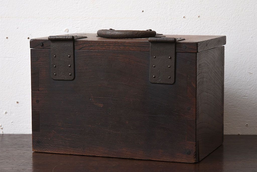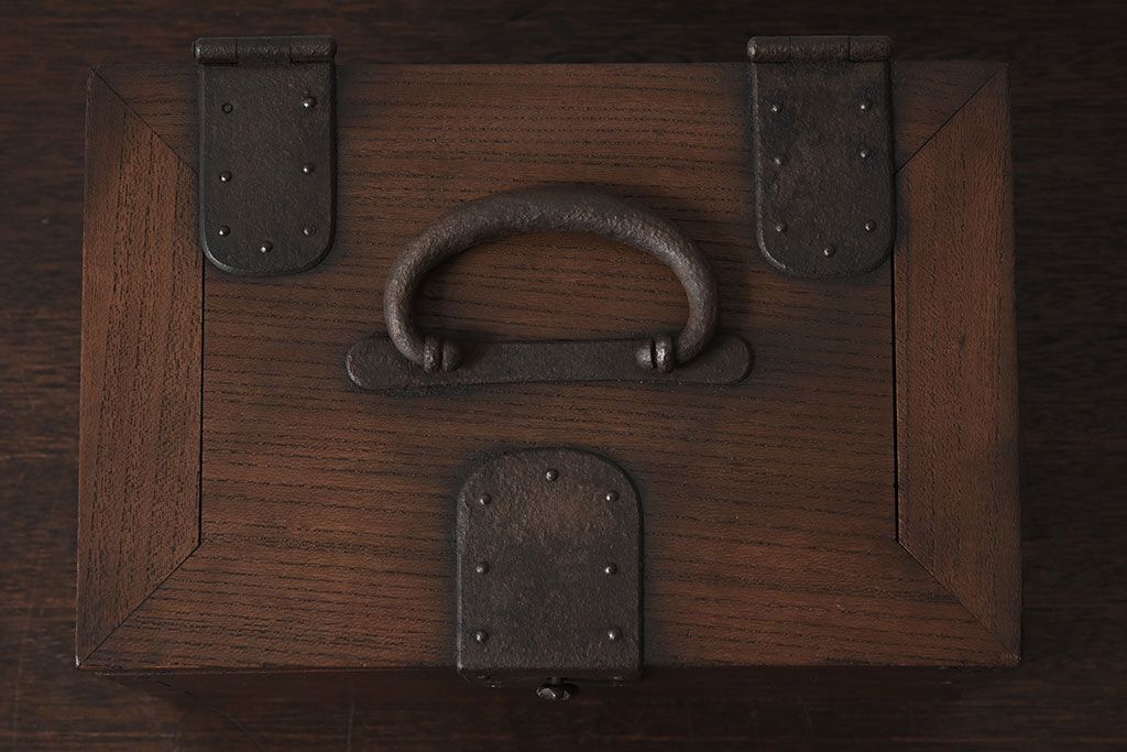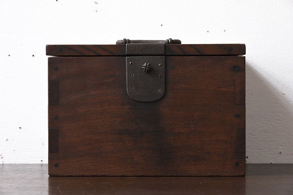 アンティーク雑貨 総欅材 明治期の古い金具付き!アンティーク硯箱(小箱・木箱)
