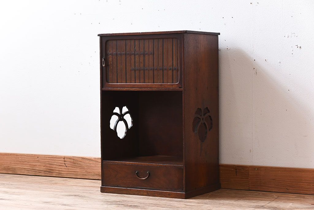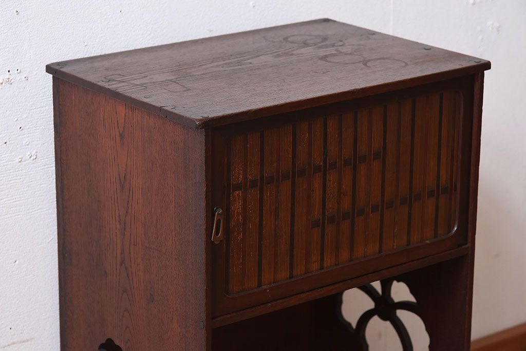 桑材製 透かし彫り 上品な意匠の小さなアンティーク収納棚です。