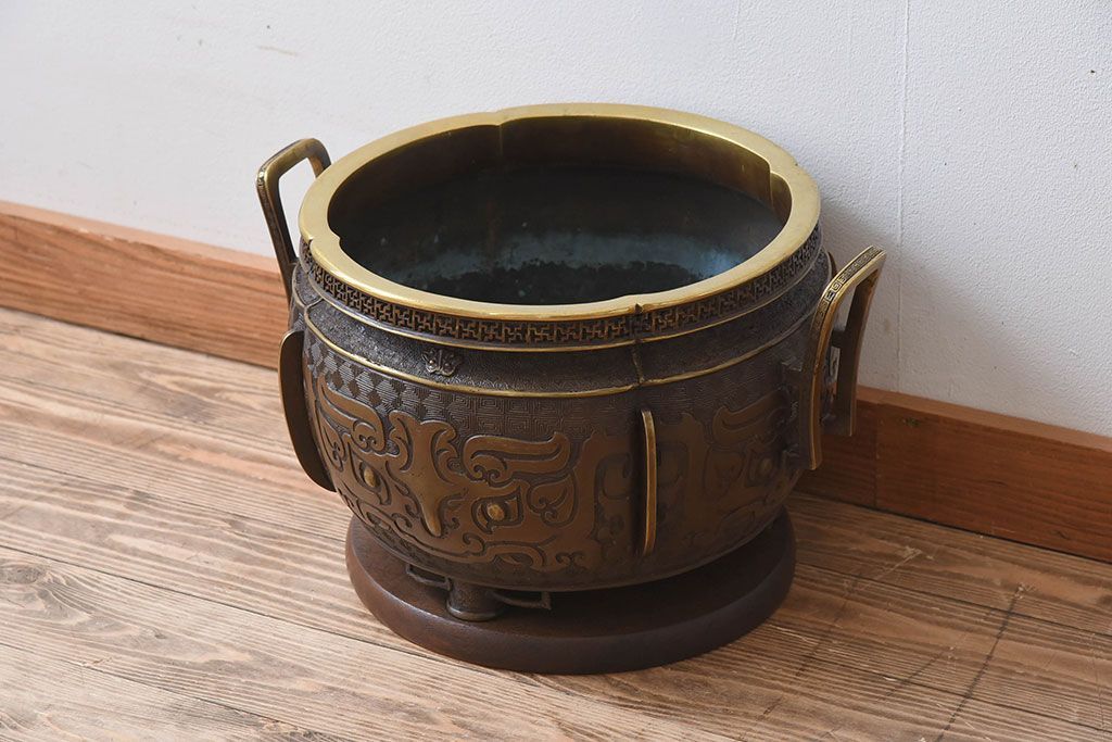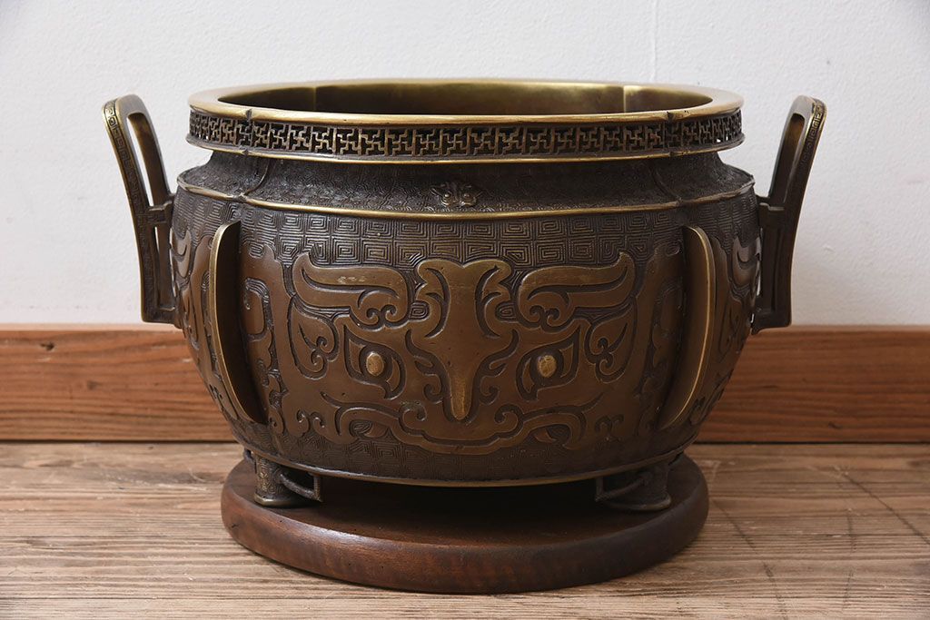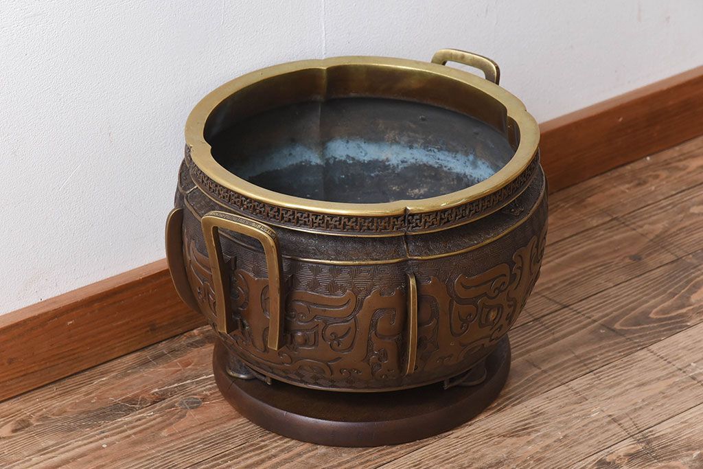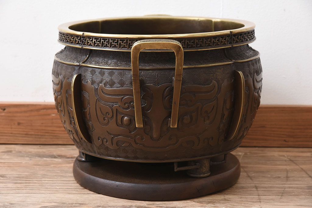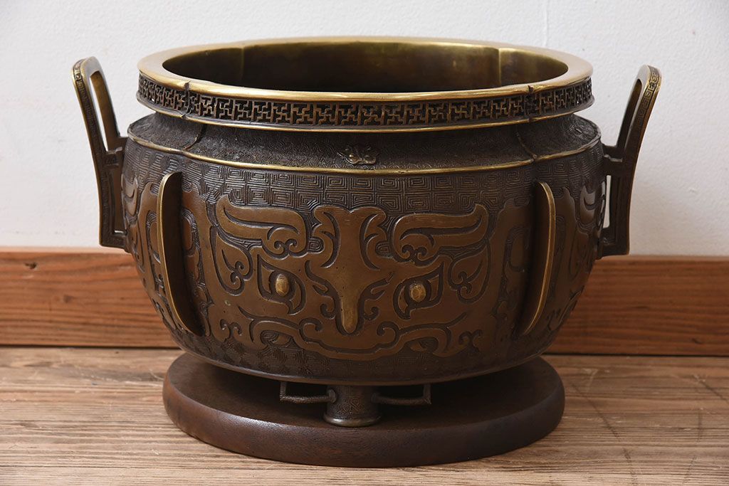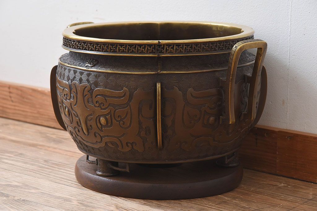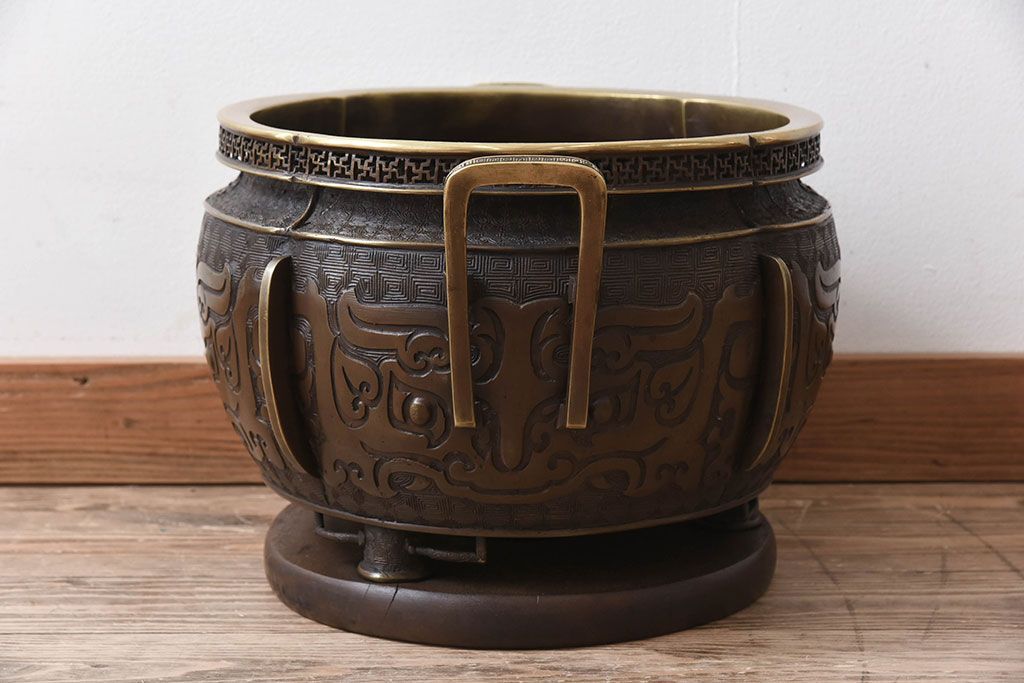 骨董・美術品 > アンティーク雑貨 古民具・骨董 木製台座付き!饕餮(とうてつ)紋の古い真鍮製火鉢(2)