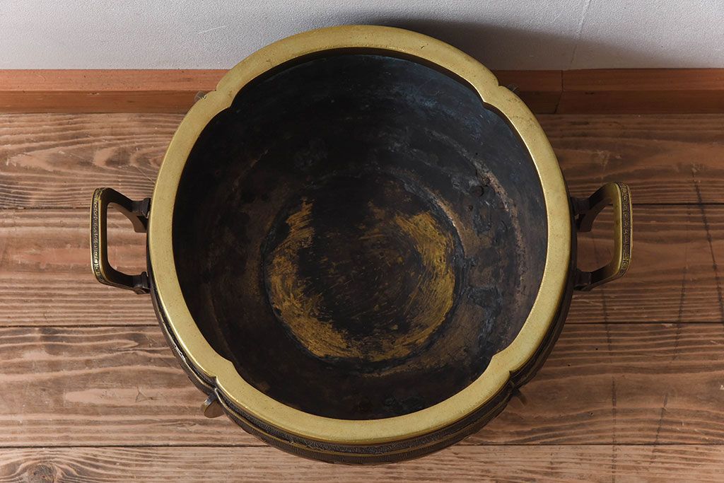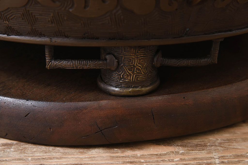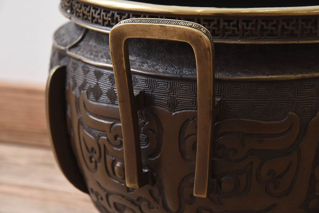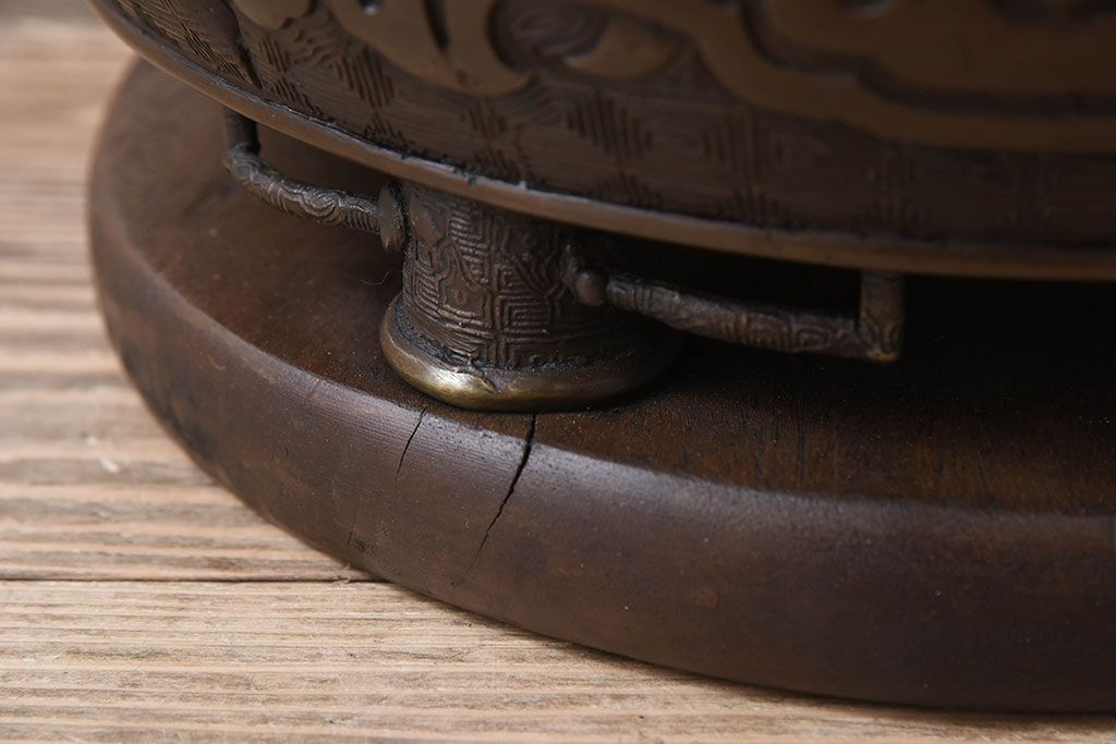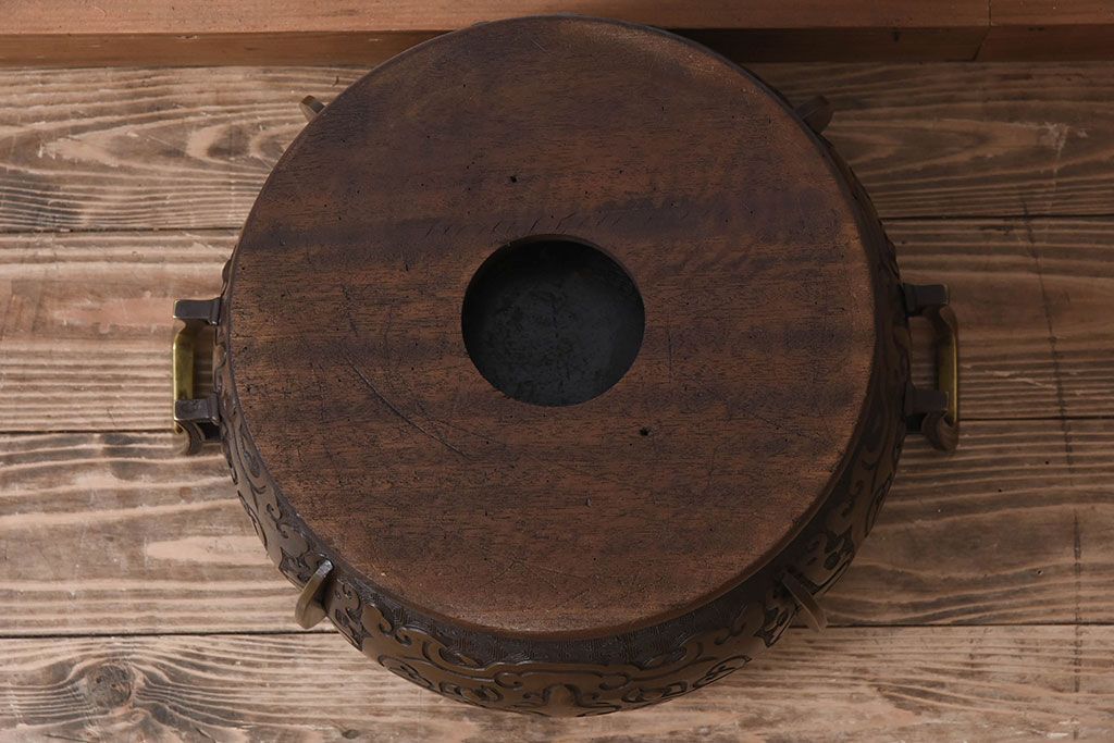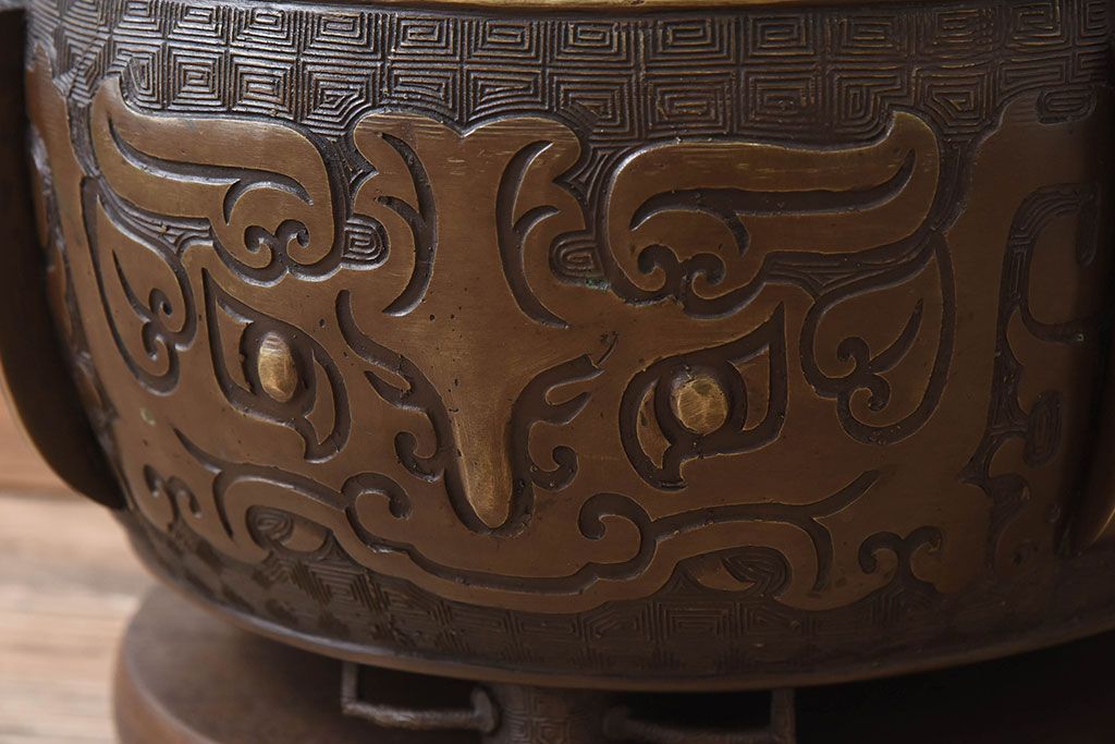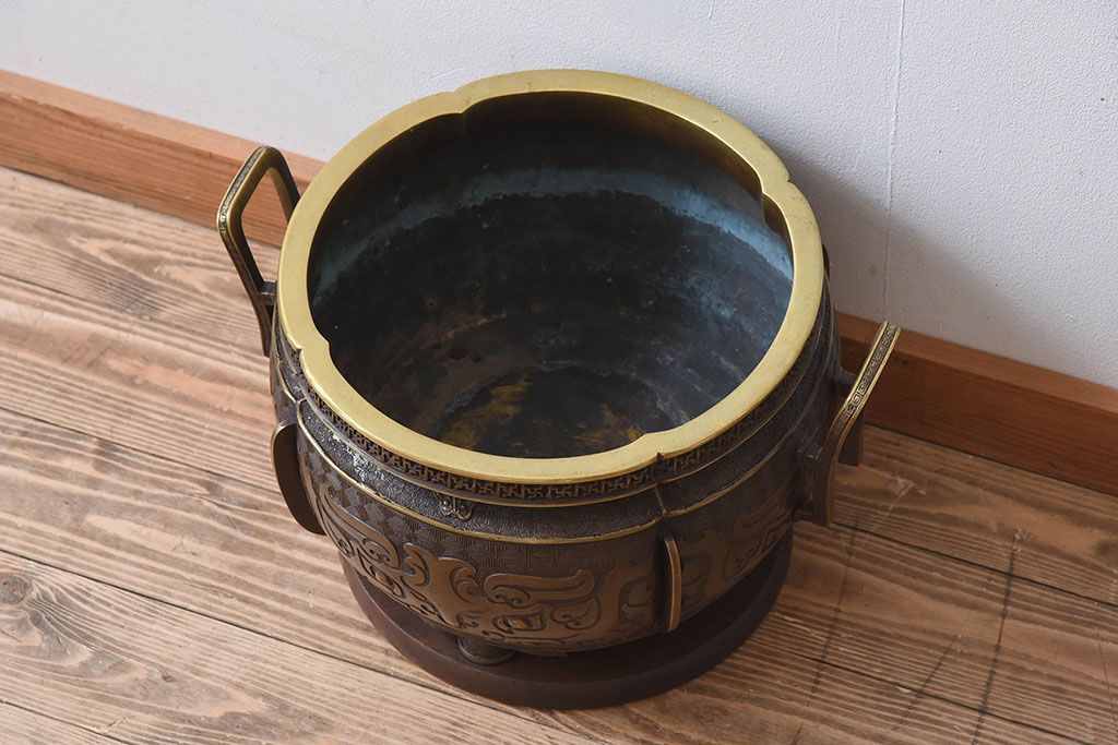 骨董・美術品 > アンティーク雑貨 古民具・骨董 木製台座付き!饕餮(とうてつ)紋の古い真鍮製火鉢(2)
