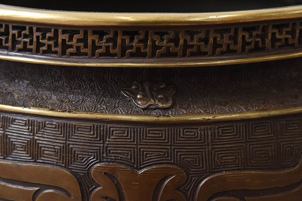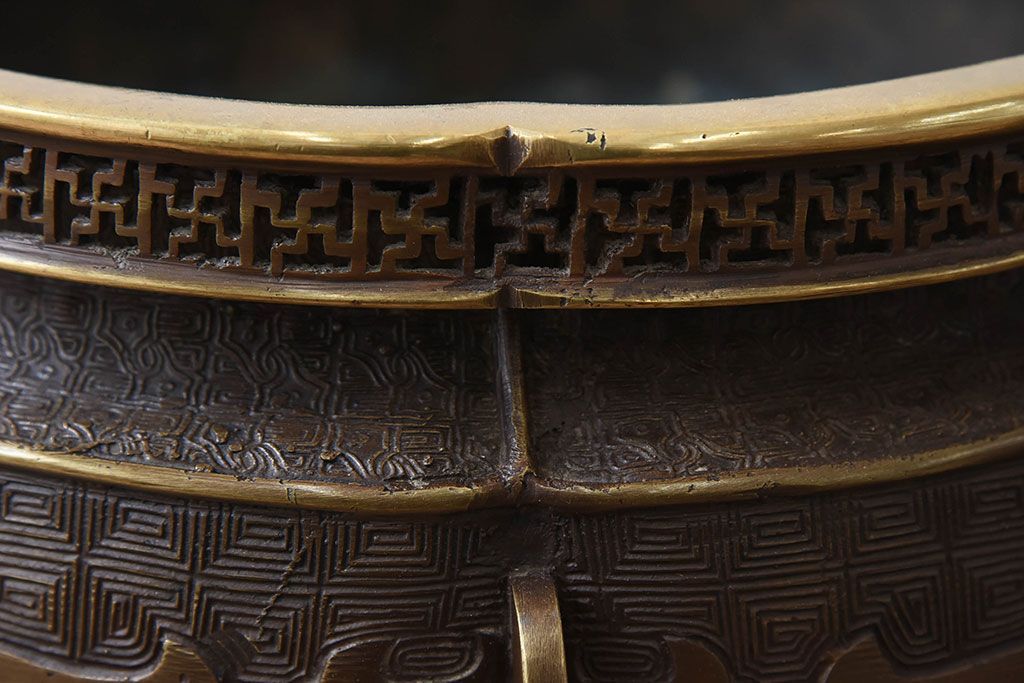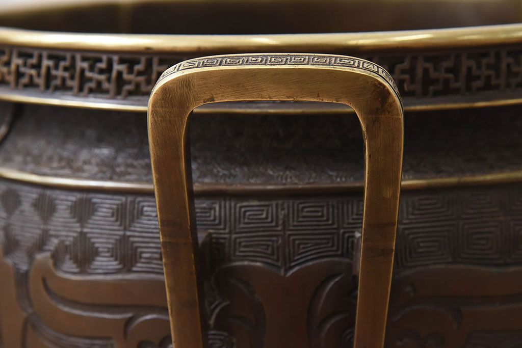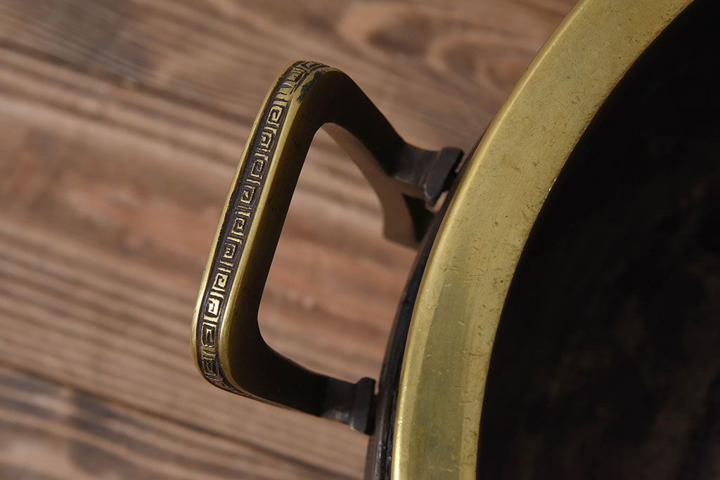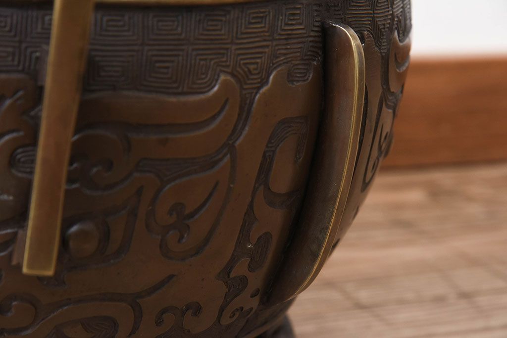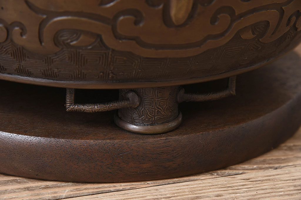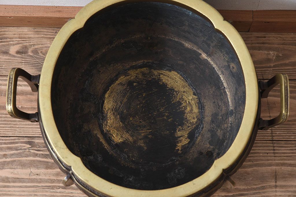骨董・美術品 > アンティーク雑貨 古民具・骨董 木製台座付き!饕餮(とうてつ)紋の古い真鍮製火鉢(2)