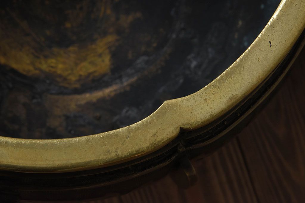火鉢> 長火鉢 > アンティーク雑貨 古民具・骨董 木製台座付き!饕餮(とうてつ)紋の古い真鍮製火鉢(2)