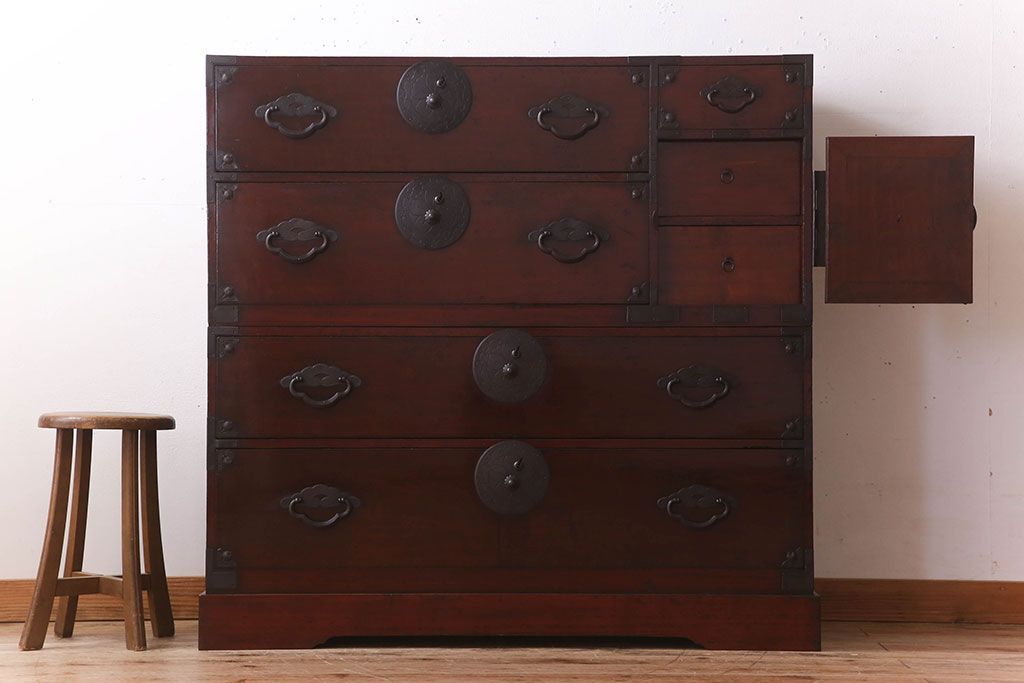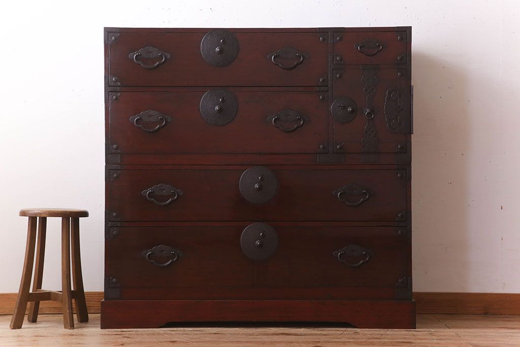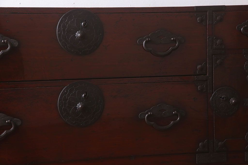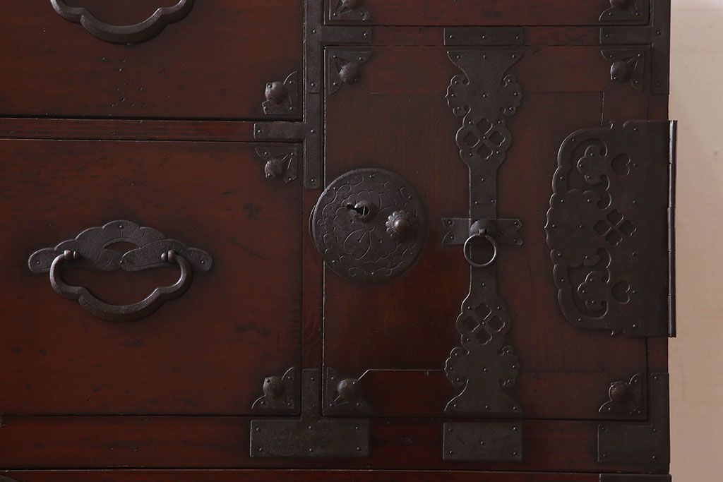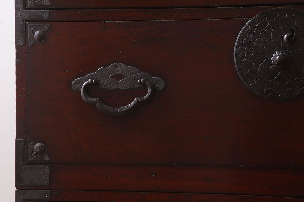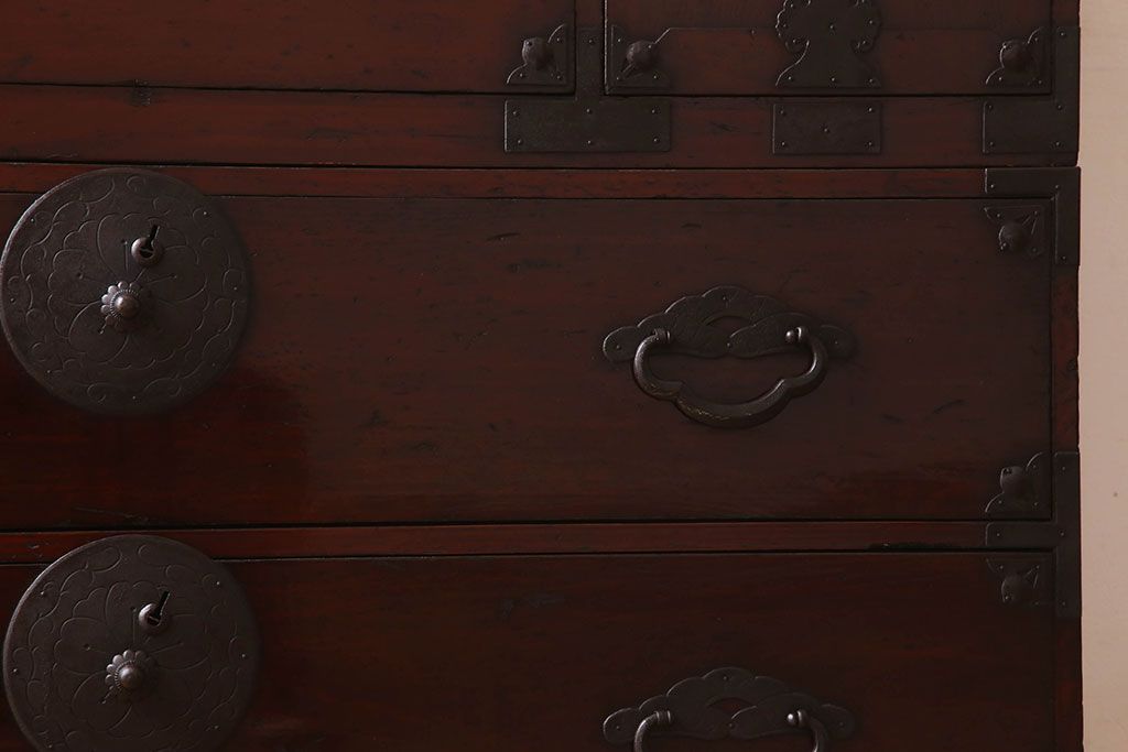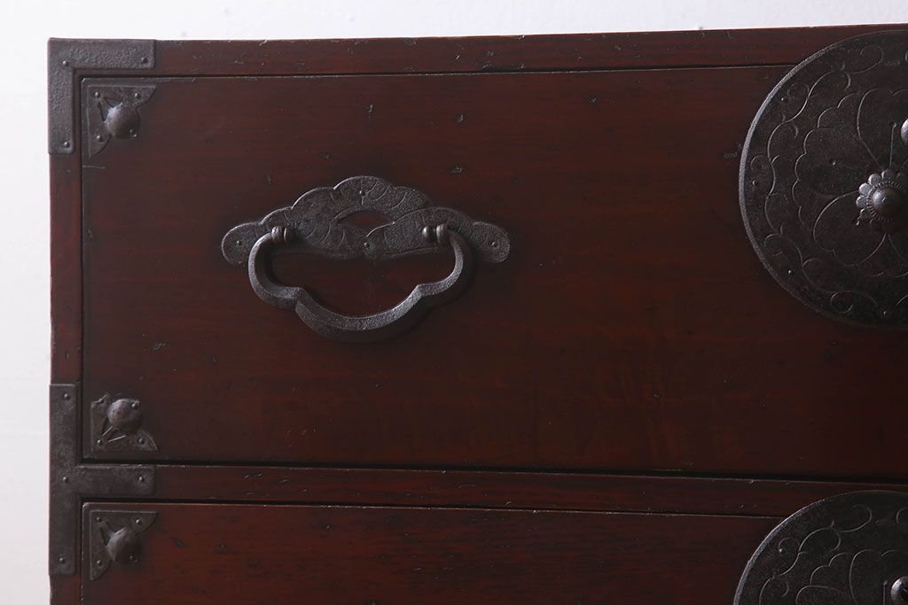 アンティーク家具 古民具・骨董 桜丸金具 前面栗材の米沢箪笥(衣装箪笥)(台輪付き)