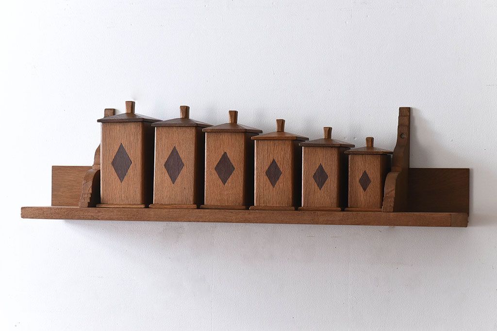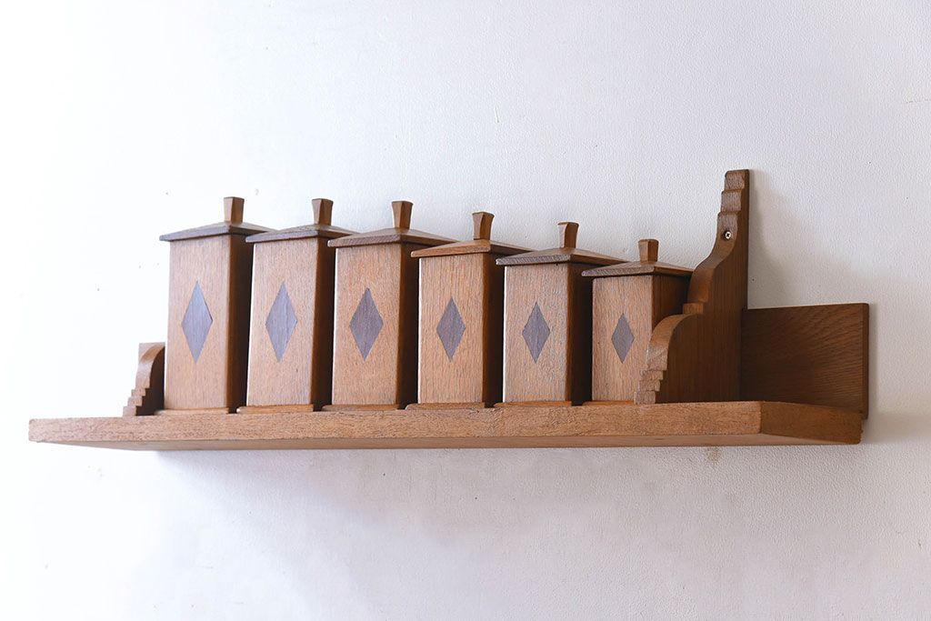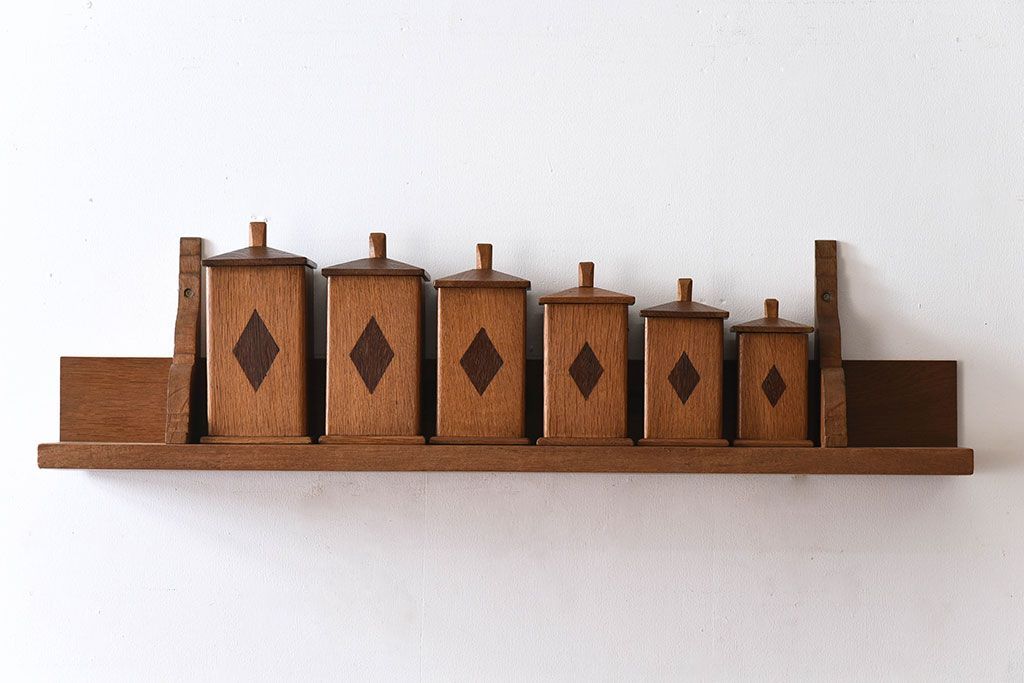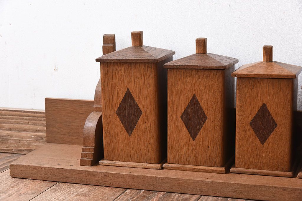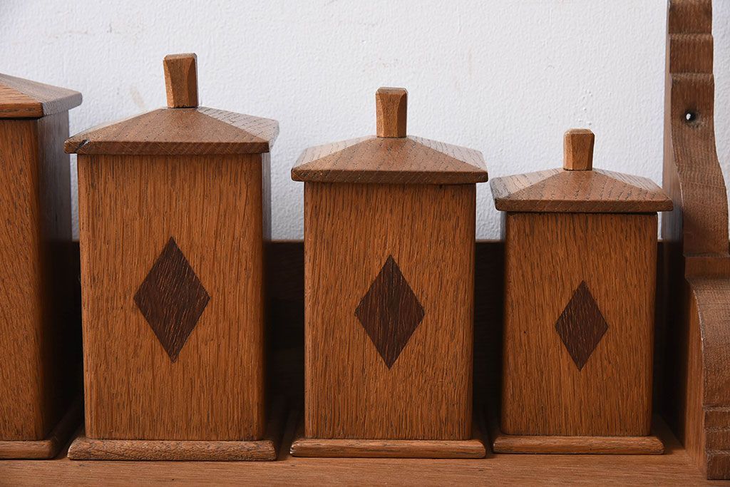 ラフジュ工房> 洋食器・キッチン用品> キャニスター > アンティーク雑貨 イギリスアンティーク 飾り棚付き!木製キャ二スター6点セット