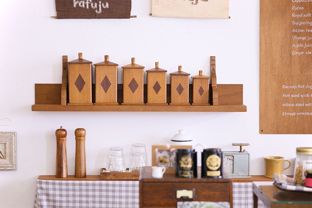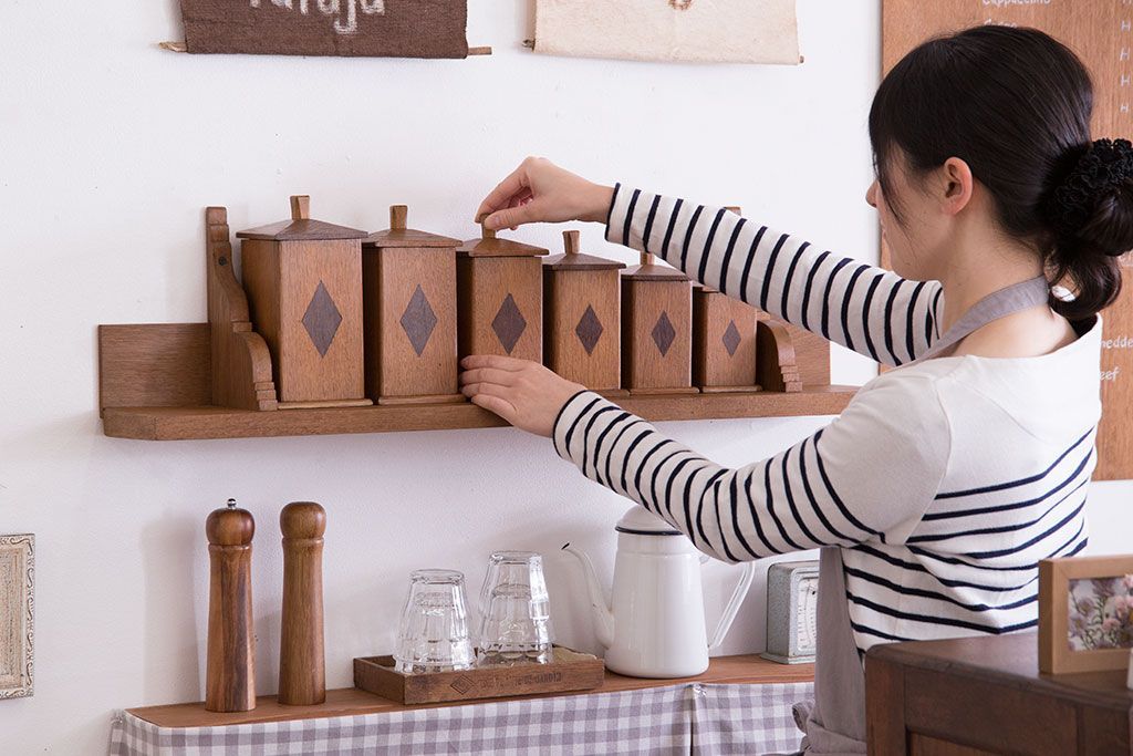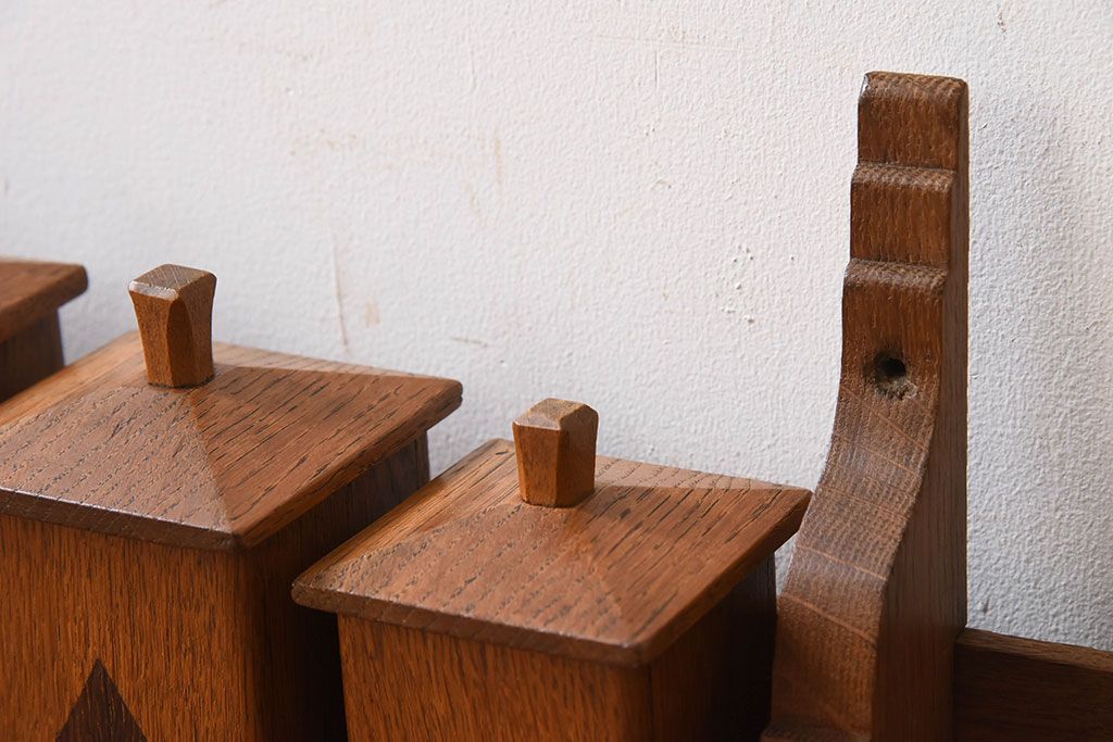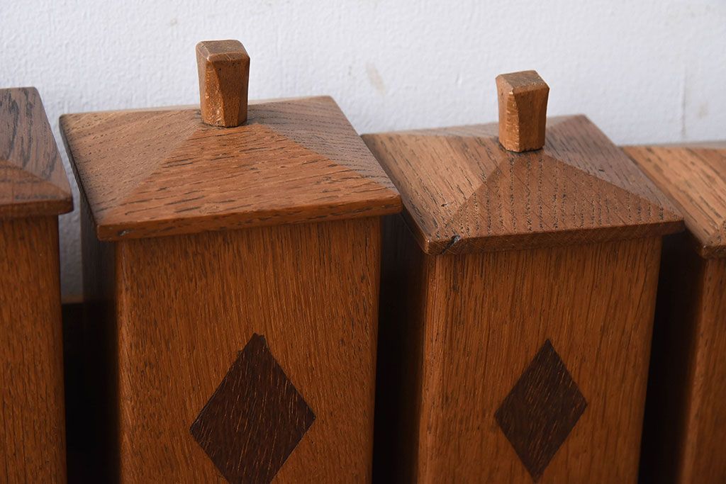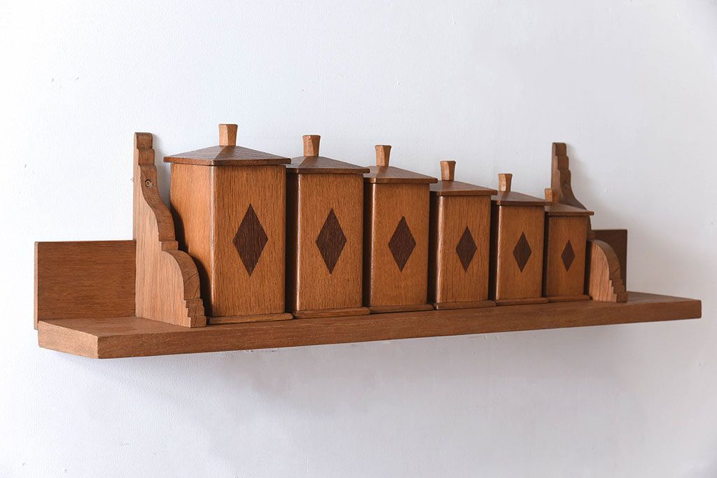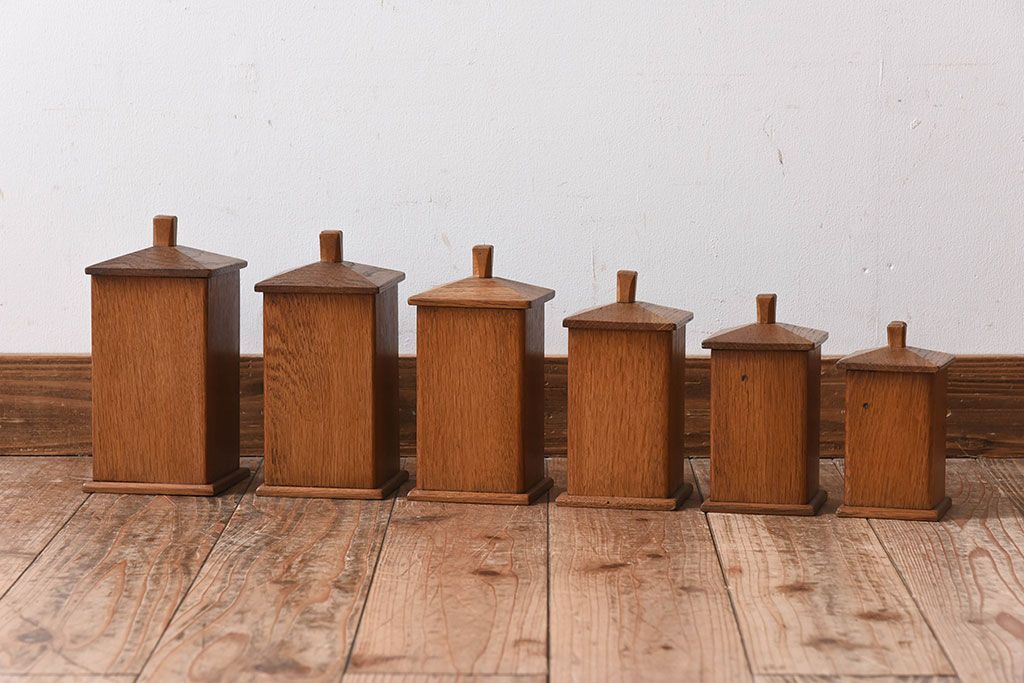 ラフジュ工房> 洋食器・キッチン用品> キャニスター > アンティーク雑貨 イギリスアンティーク 飾り棚付き!木製キャ二スター6点セット