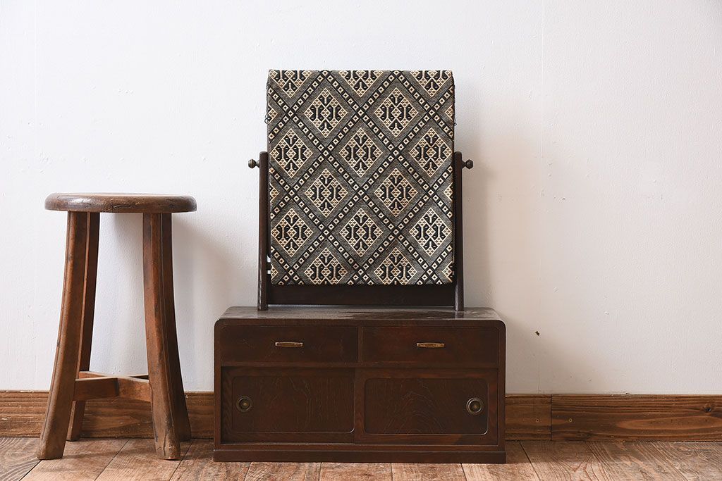 アンティーク家具 高級品 大正昭和期 総桑材 指物 こぎん刺し鏡カバー付き アンティークの小ぶりな鏡台