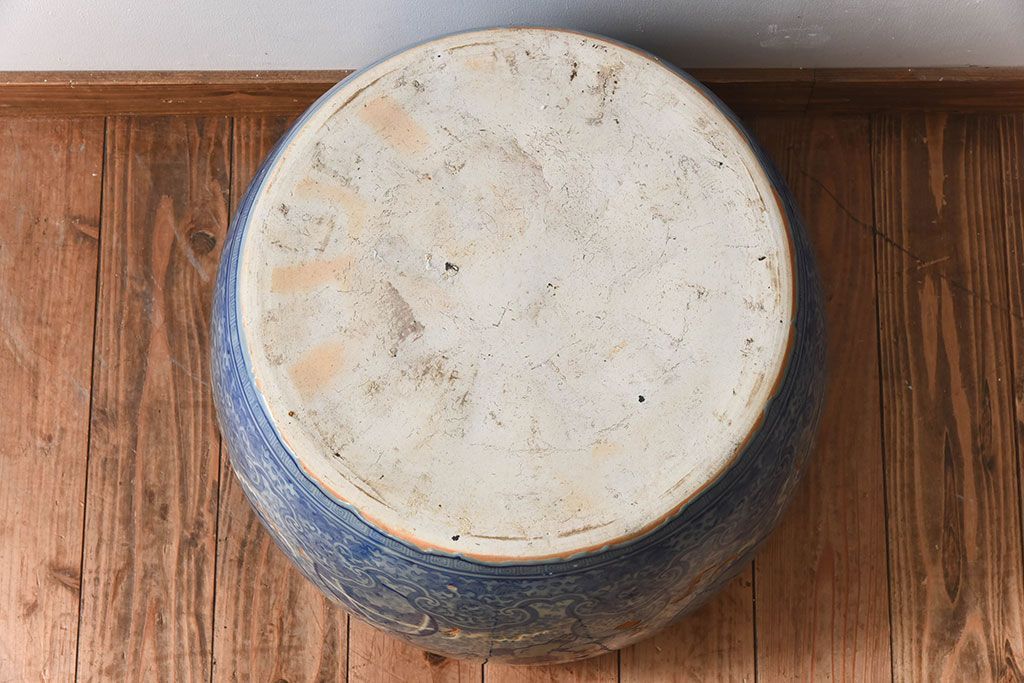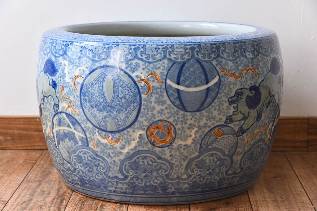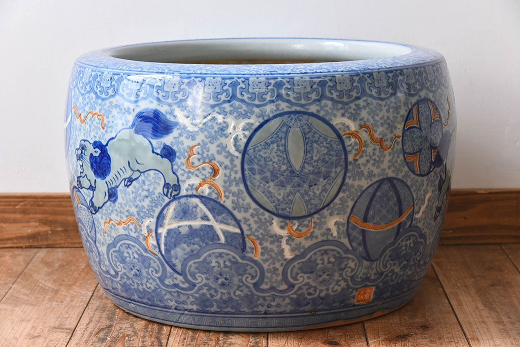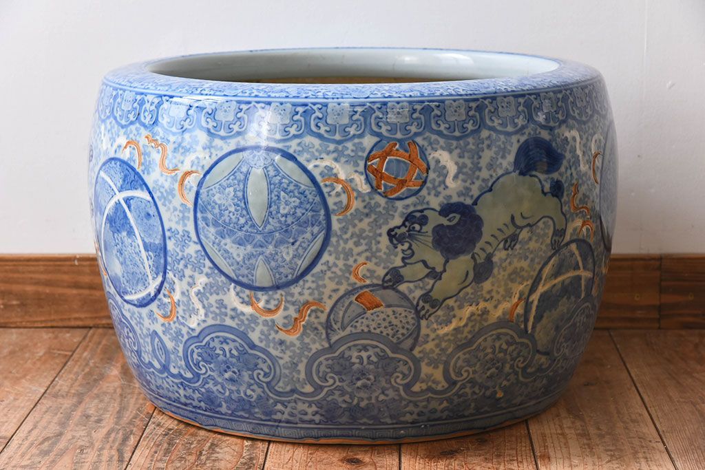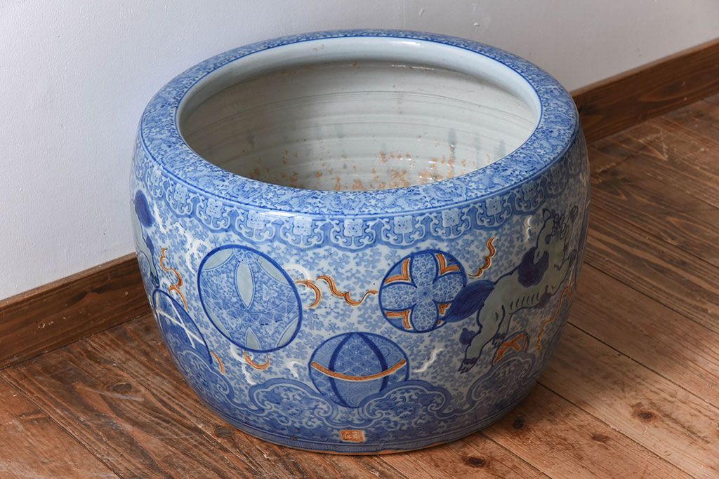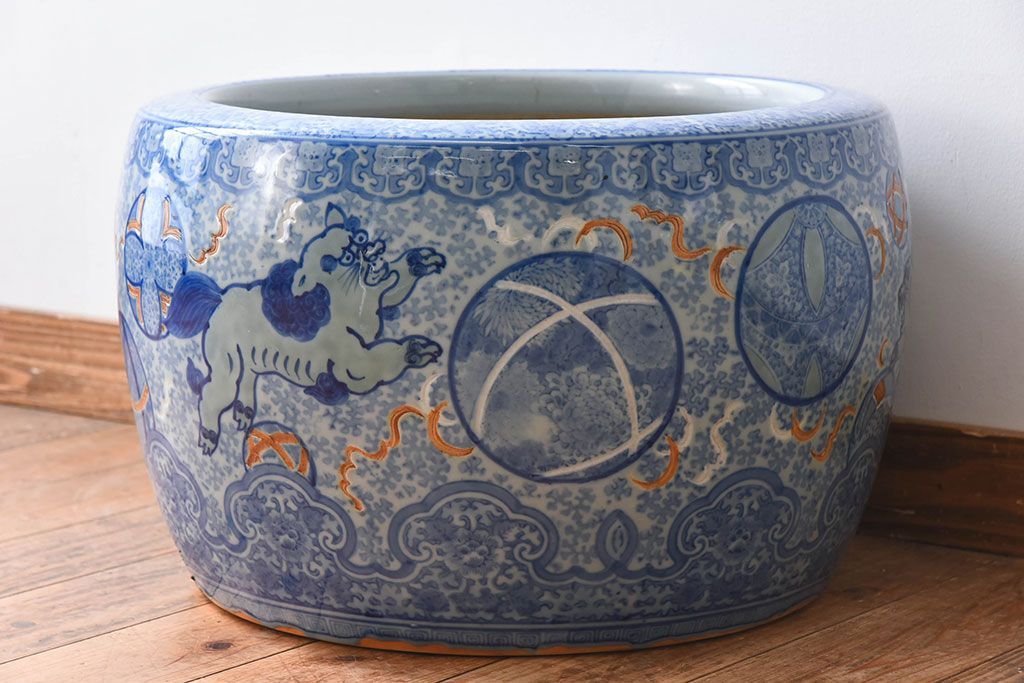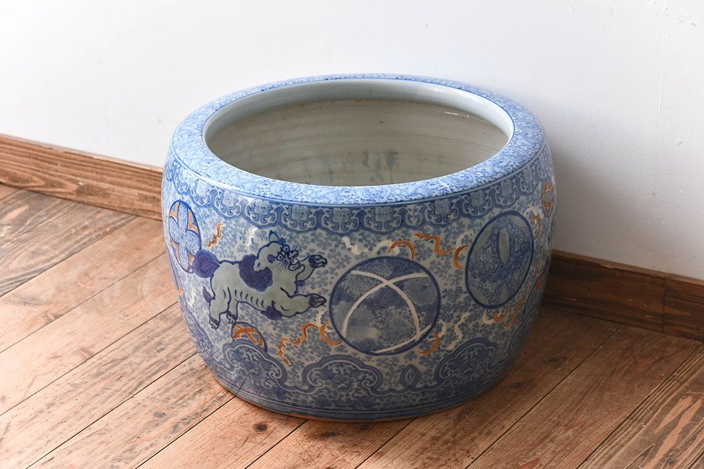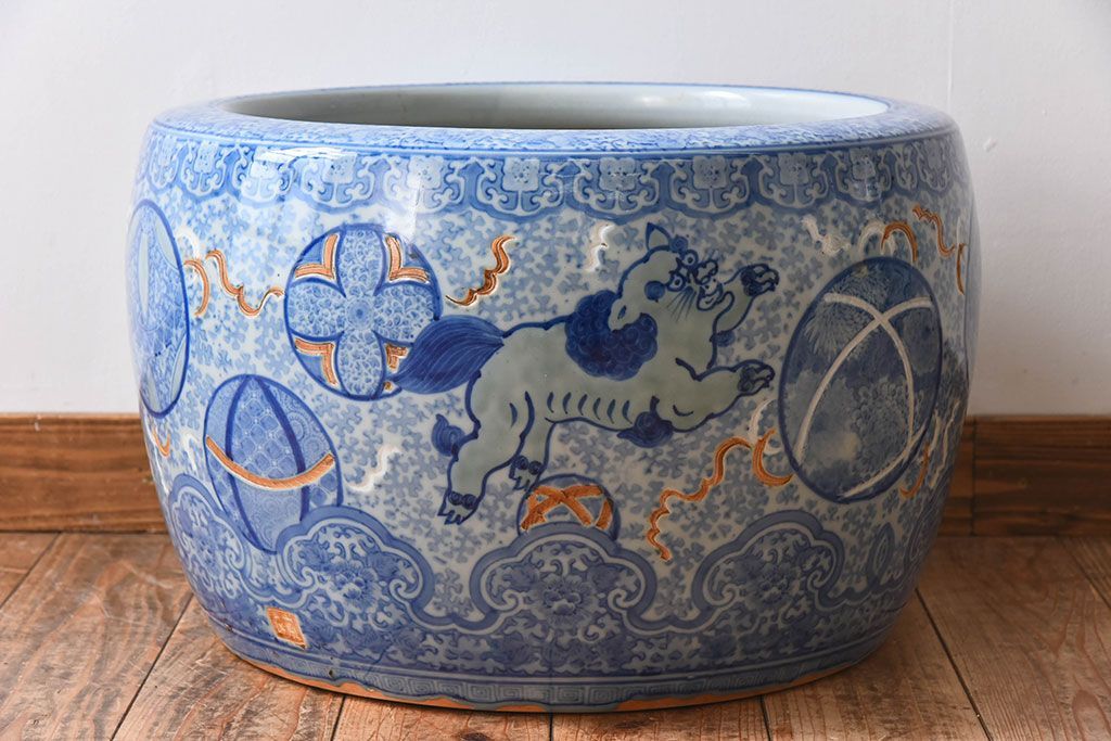 アンティーク雑貨 古民具・骨董 玉取獅子図 アンティーク染付瀬戸火鉢