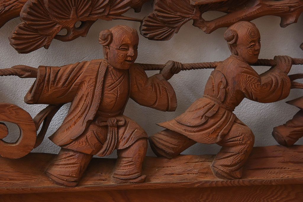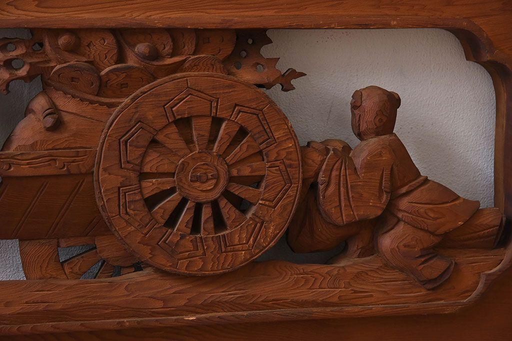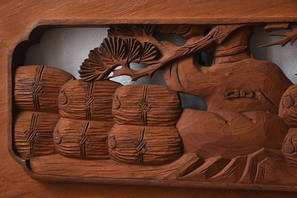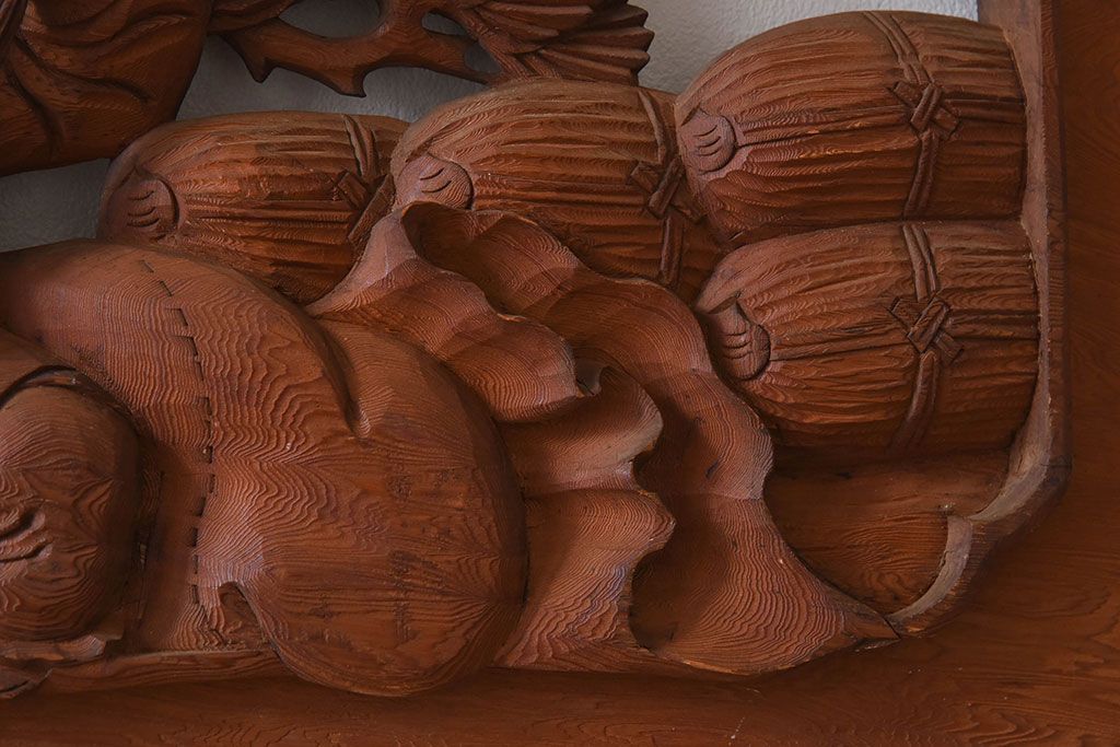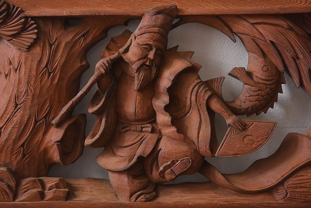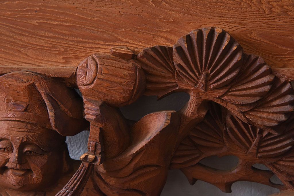 彫刻で恵比寿・大黒などが描かれた逸品です。