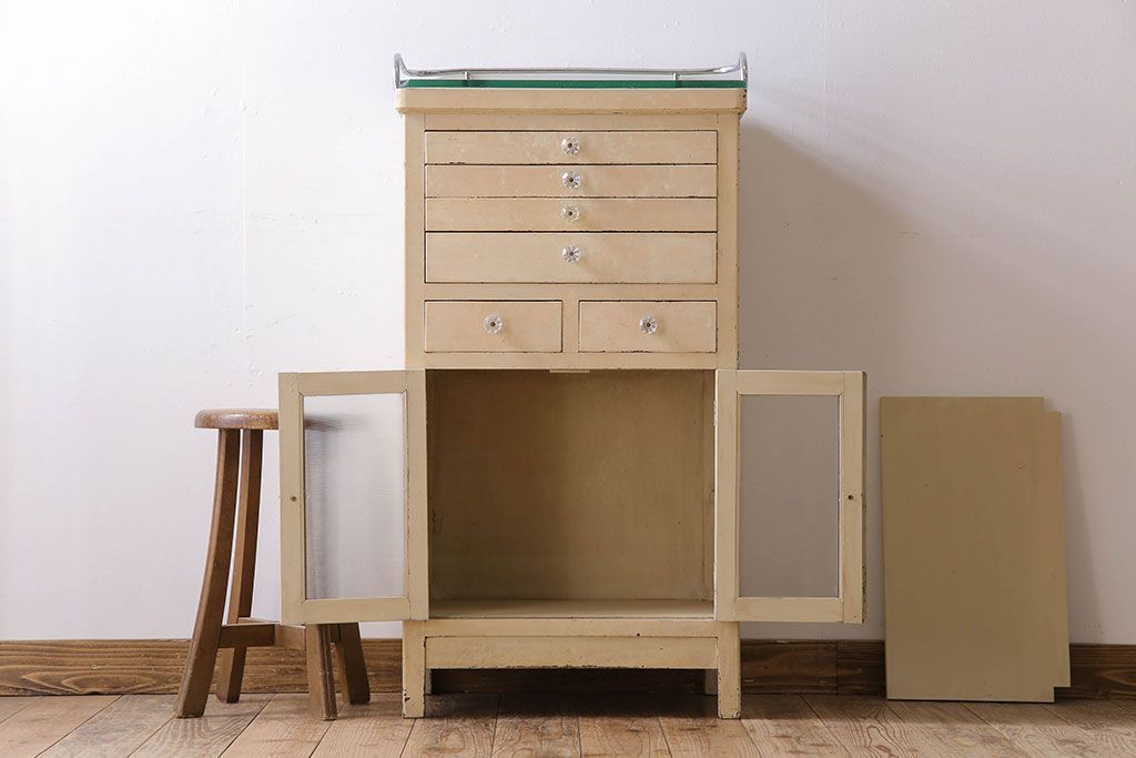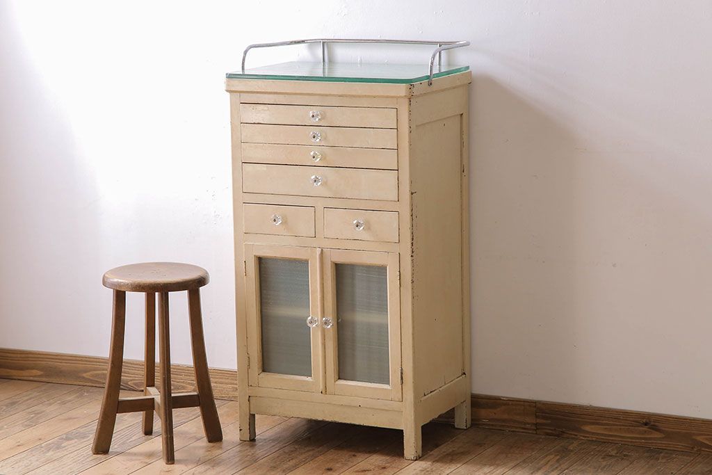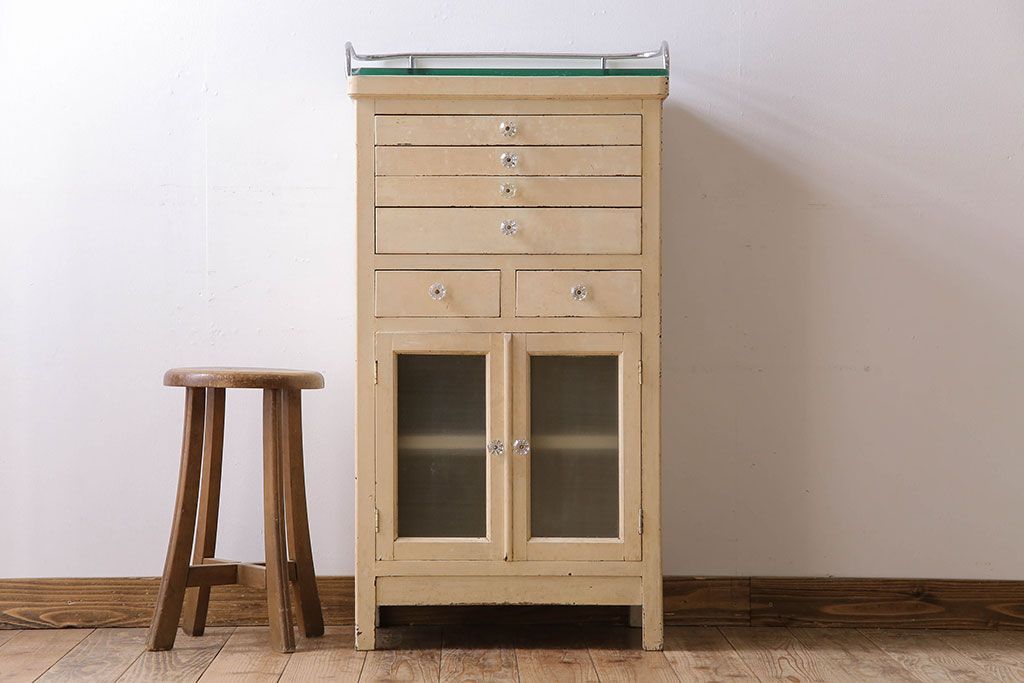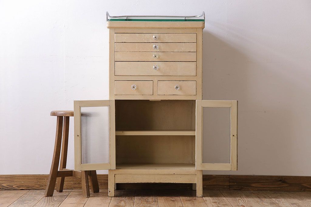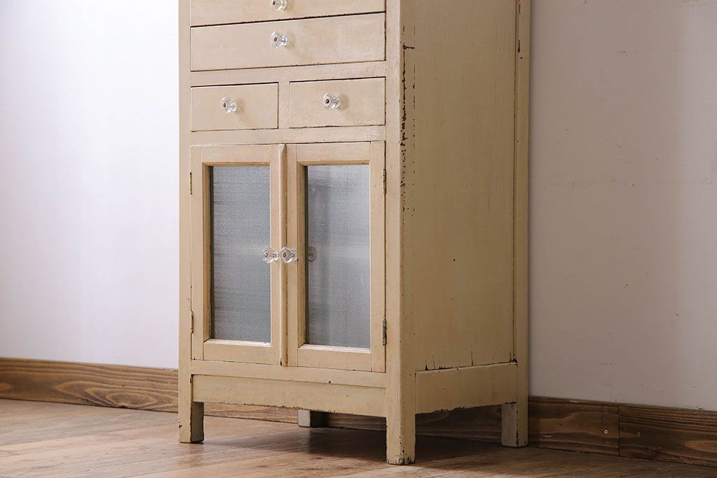 ラフジュ工房> キャビネット・戸棚> 医療用キャビネット・ケビント > アンティーク家具 ガラスの取っ手のペイントデンタルキャビネット ミストガラス