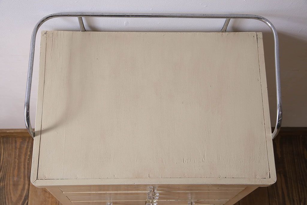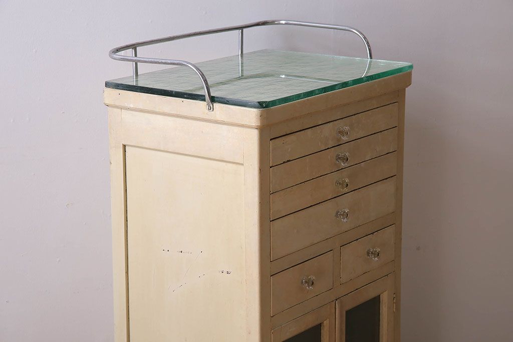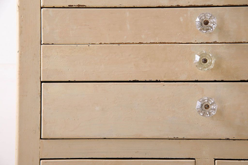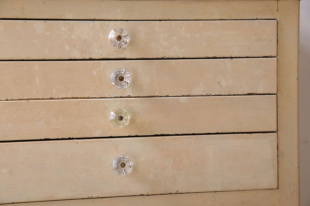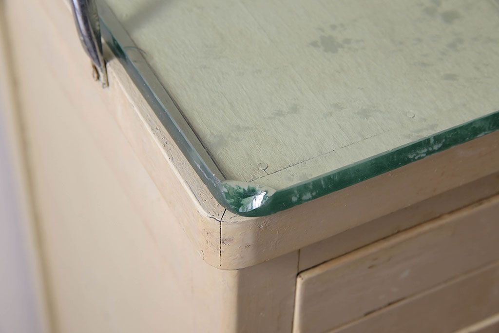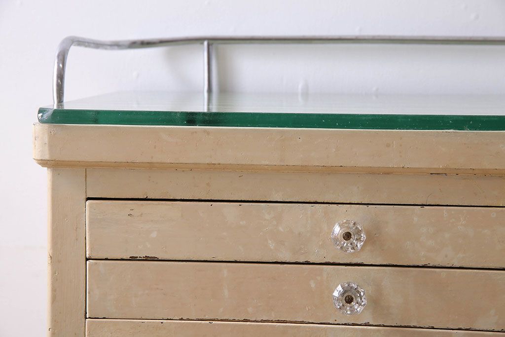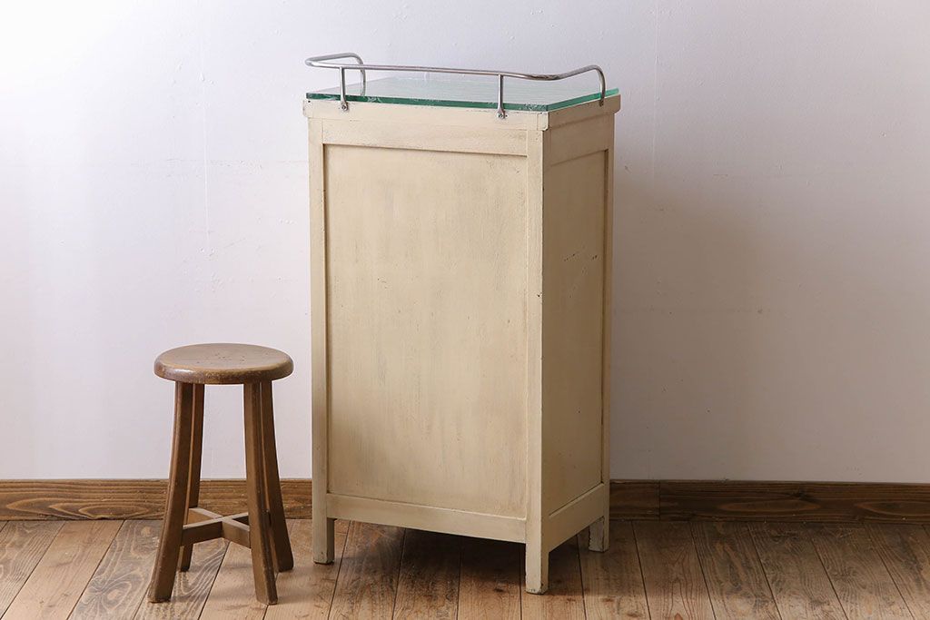 ラフジュ工房> チェスト・引き出し> サイドチェスト > アンティーク家具 ガラスの取っ手のペイントデンタルキャビネット ミストガラス