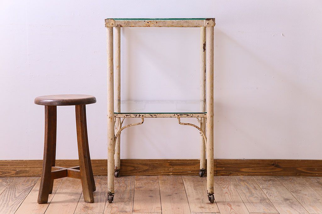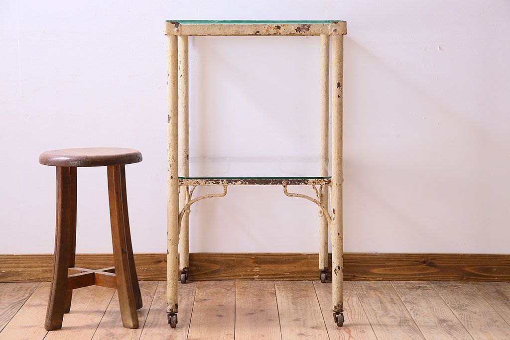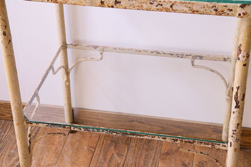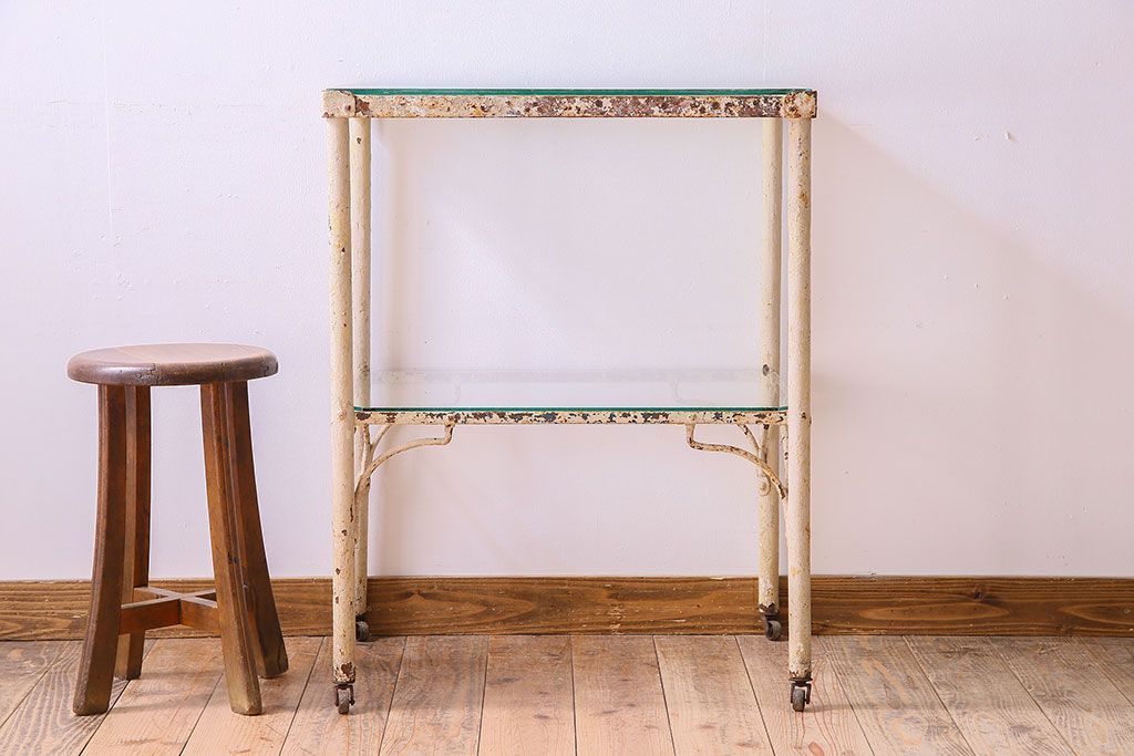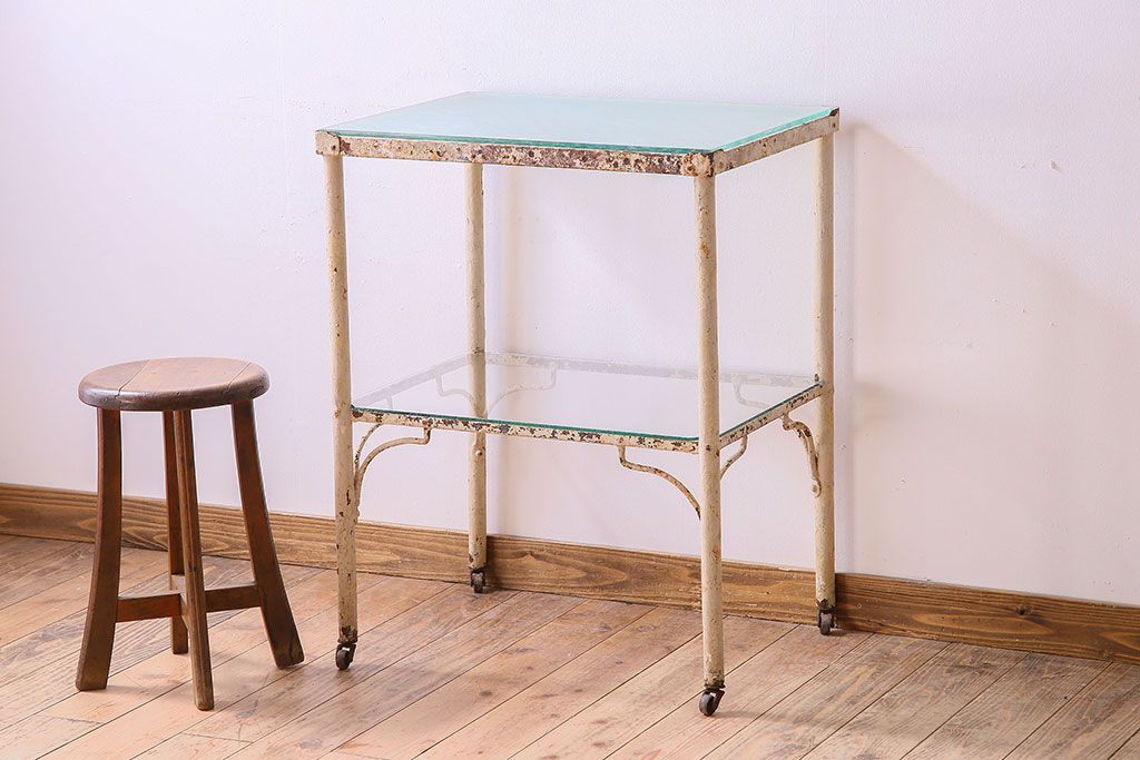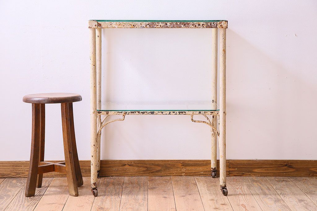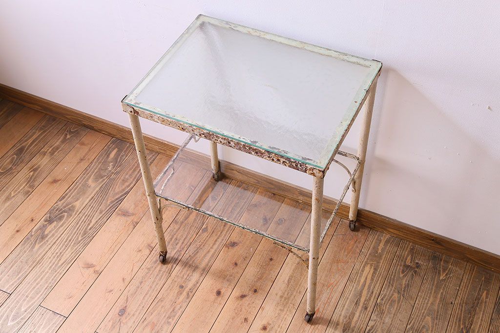 ラフジュ工房> テーブル> サイドテーブル > レトロ家具 昭和レトロ アイアン製!ガラストップのキャスター付きテーブル(サイドテーブル、コンソールテーブル、アイアンラック、店舗什器)(R-024191)