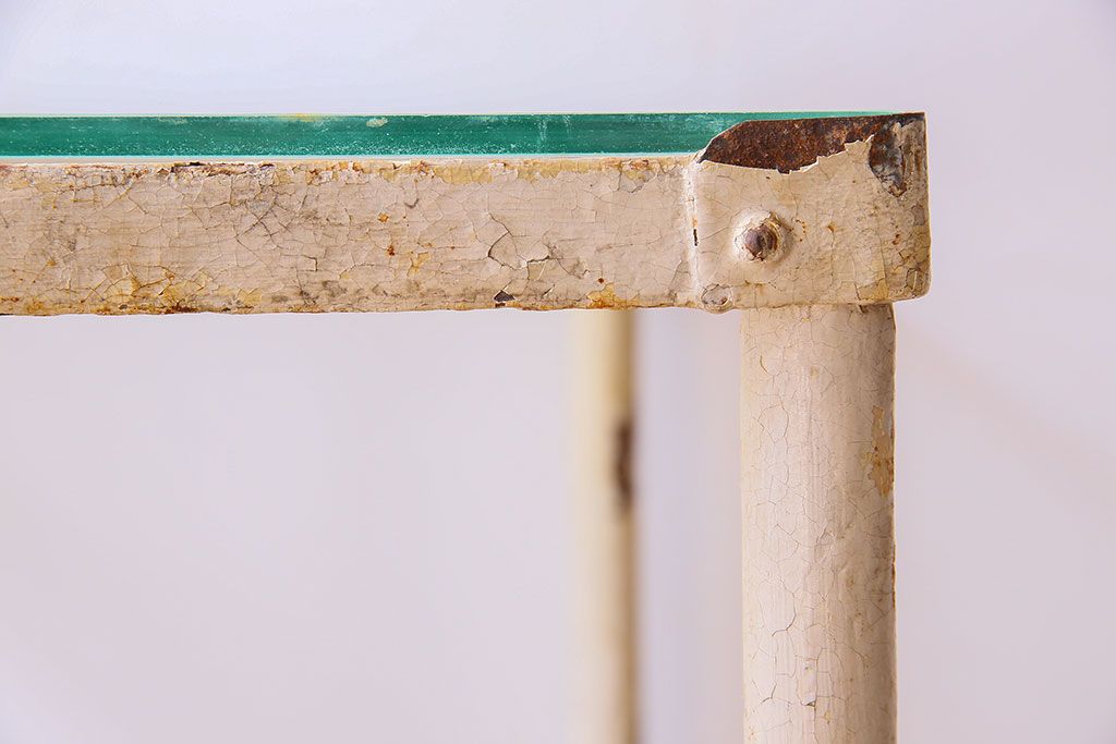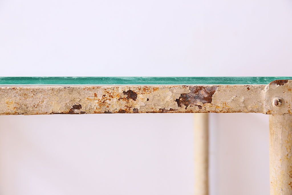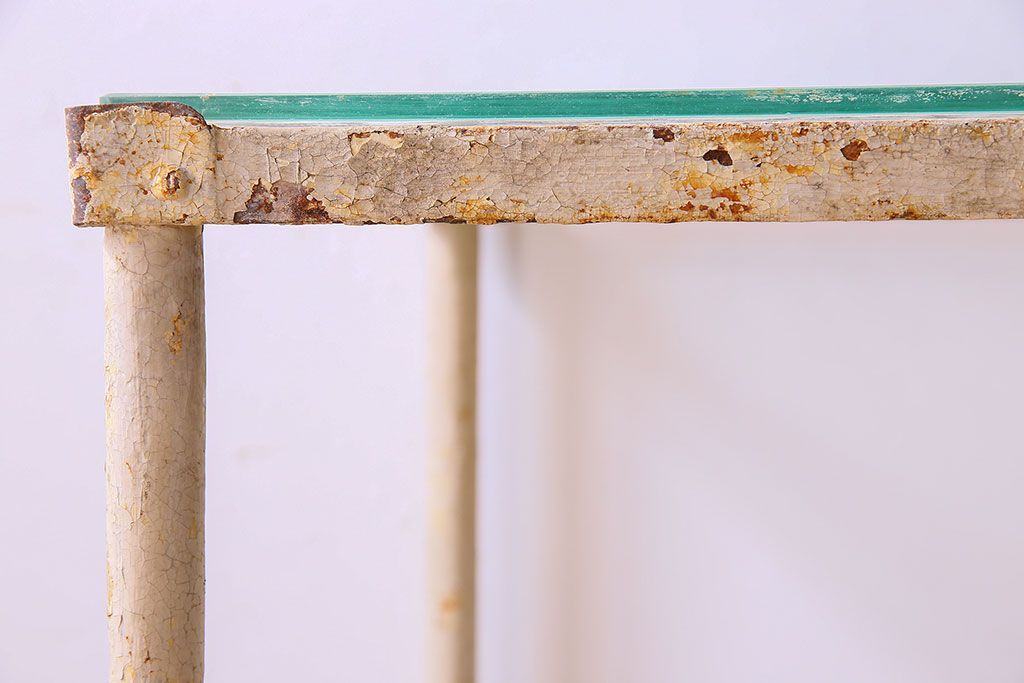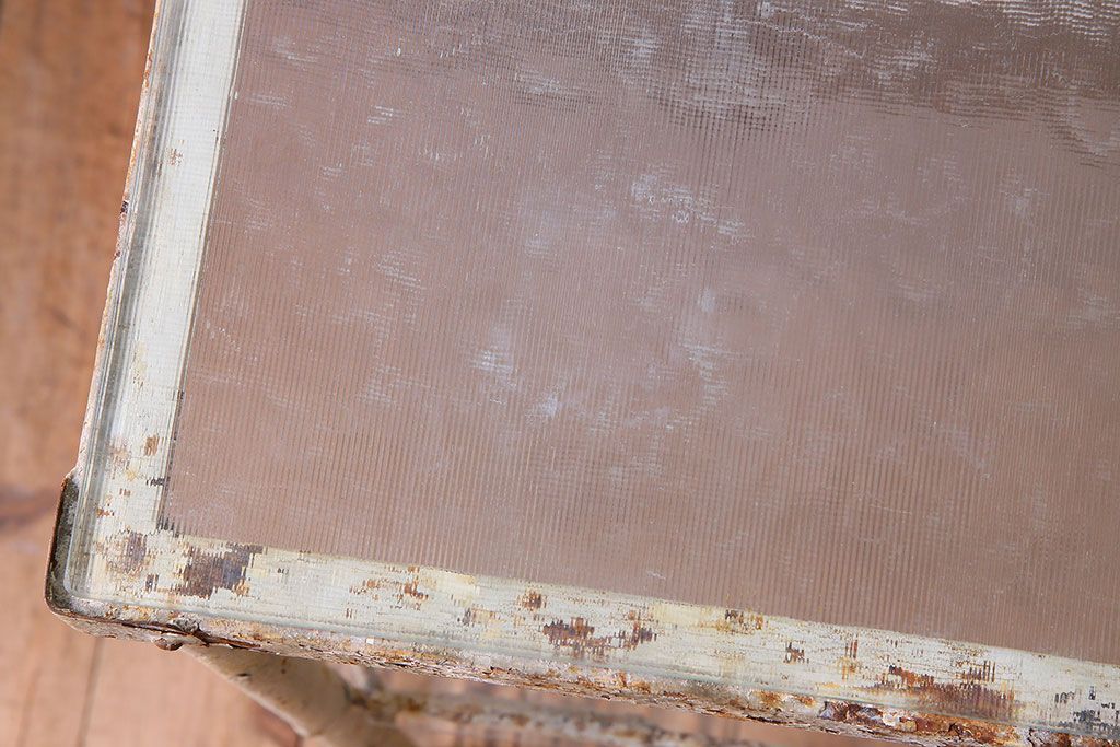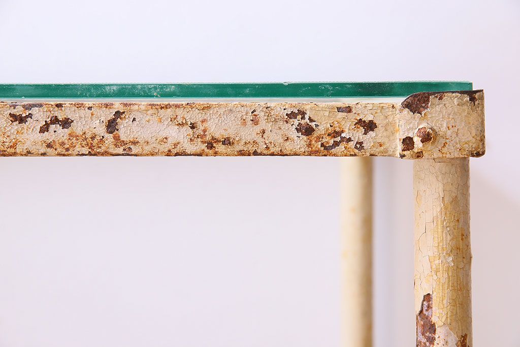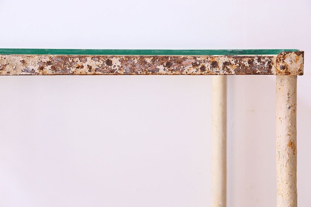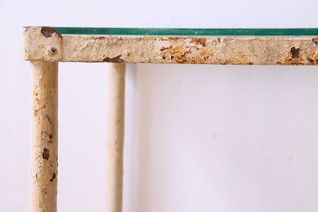 ラフジュ工房> テーブル> サイドテーブル > レトロ家具 昭和レトロ アイアン製!ガラストップのキャスター付きテーブル(サイドテーブル、コンソールテーブル、アイアンラック、店舗什器)(R-024191)
