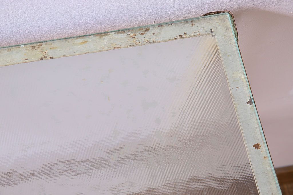 ラフジュ工房> テーブル> 鉄脚テーブル > レトロ家具 昭和レトロ アイアン製!ガラストップのキャスター付きテーブル(サイドテーブル、コンソールテーブル、アイアンラック、店舗什器)(R-024191)