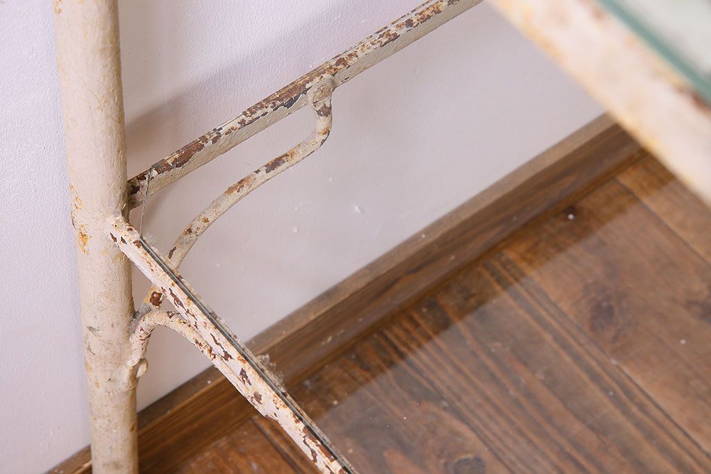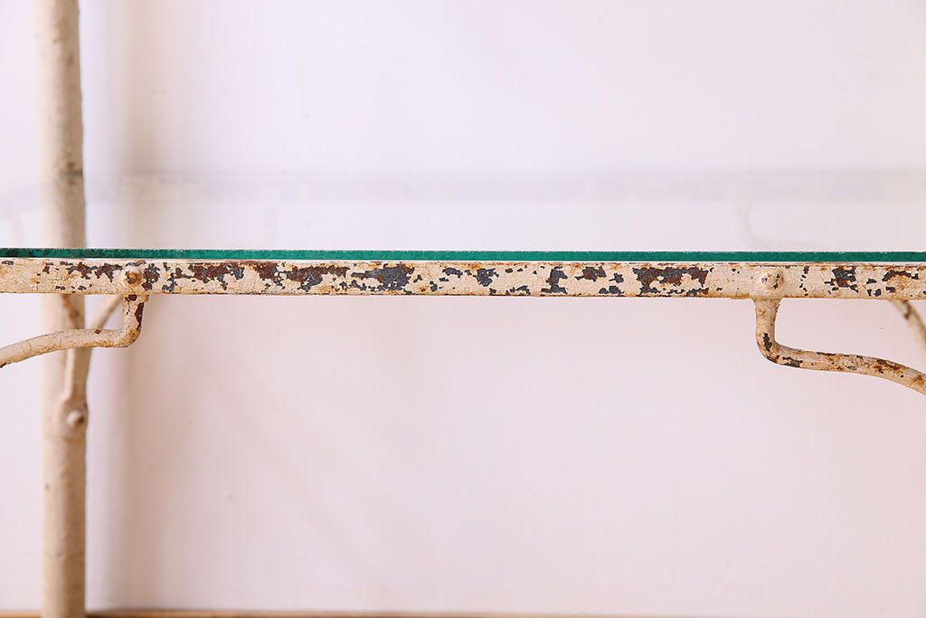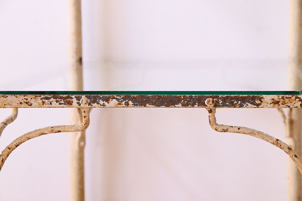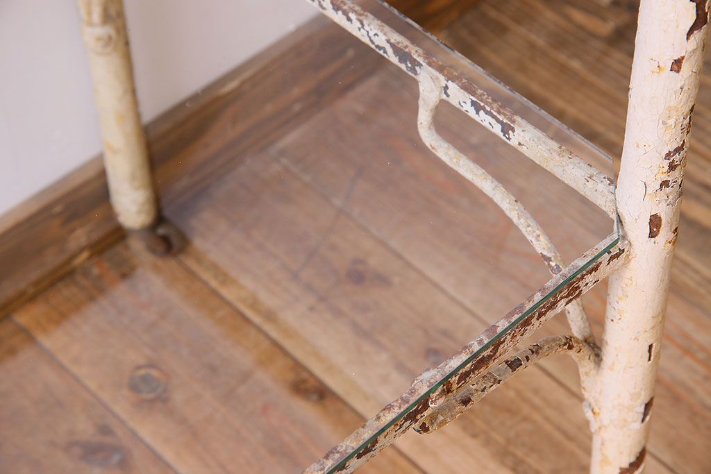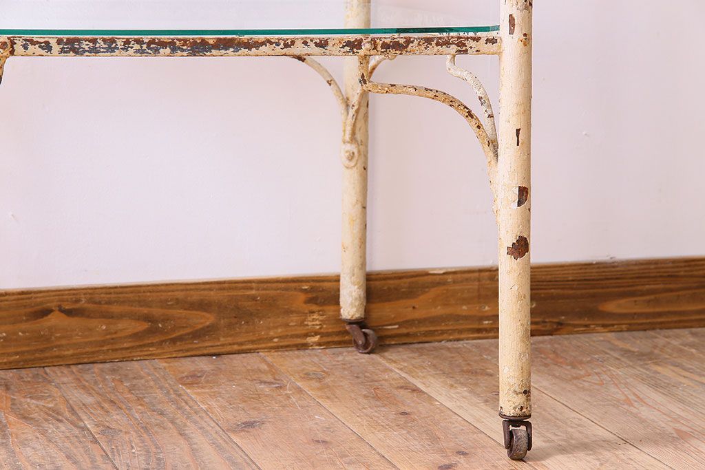 ラフジュ工房> 店舗什器 > レトロ家具 昭和レトロ アイアン製!ガラストップのキャスター付きテーブル(サイドテーブル、コンソールテーブル、アイアンラック、店舗什器)(R-024191)