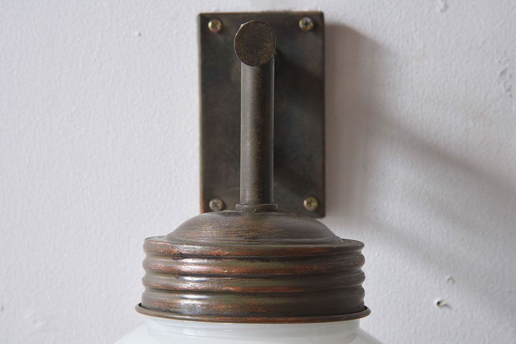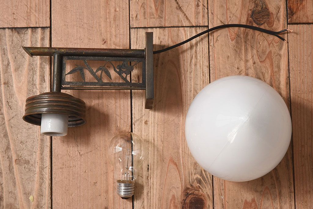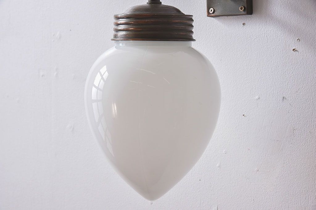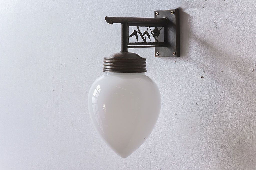 つぼみ型 白いガラスのアンティーク壁付け照明(ライト)です。 つぼみ型の丸いフォルムが愛らしい 和製アンティークの壁付け照明です。 金属部分には和を感じさせるデザインが施された 味わい深いお品です。 和モダンスタイルのインテリアにいかがでしょうか。 シェードの取付け部は棒を軸として360度回転します。 金具部分に錆が見られますが、目立つ傷・ダメージはなく、状態良好です。 画像にありますように点灯は確認しております。問題なくご使用いただけます。 適合電球はE26です。電球口径さえ合えば、LED電球への交換もお客様ご自身で簡単にできます。 取付け部は配線そのままです。取付け部の画像もございますので、ご確認の上お買い求めください。 使用上問題のあるダメージはありません。