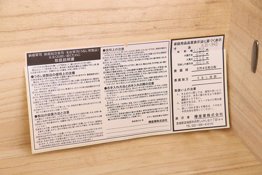 和箪笥 > 中古 仙台民芸箪笥(仙台箪笥) 欅産業 KB-34D 木地呂塗り 衣装箪笥(定価1117800円)