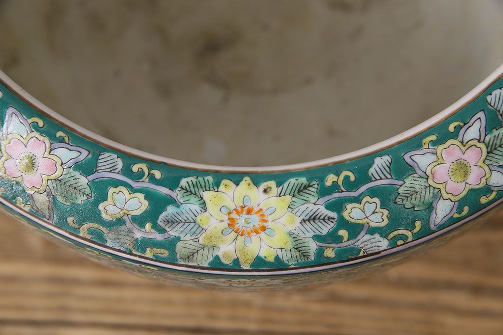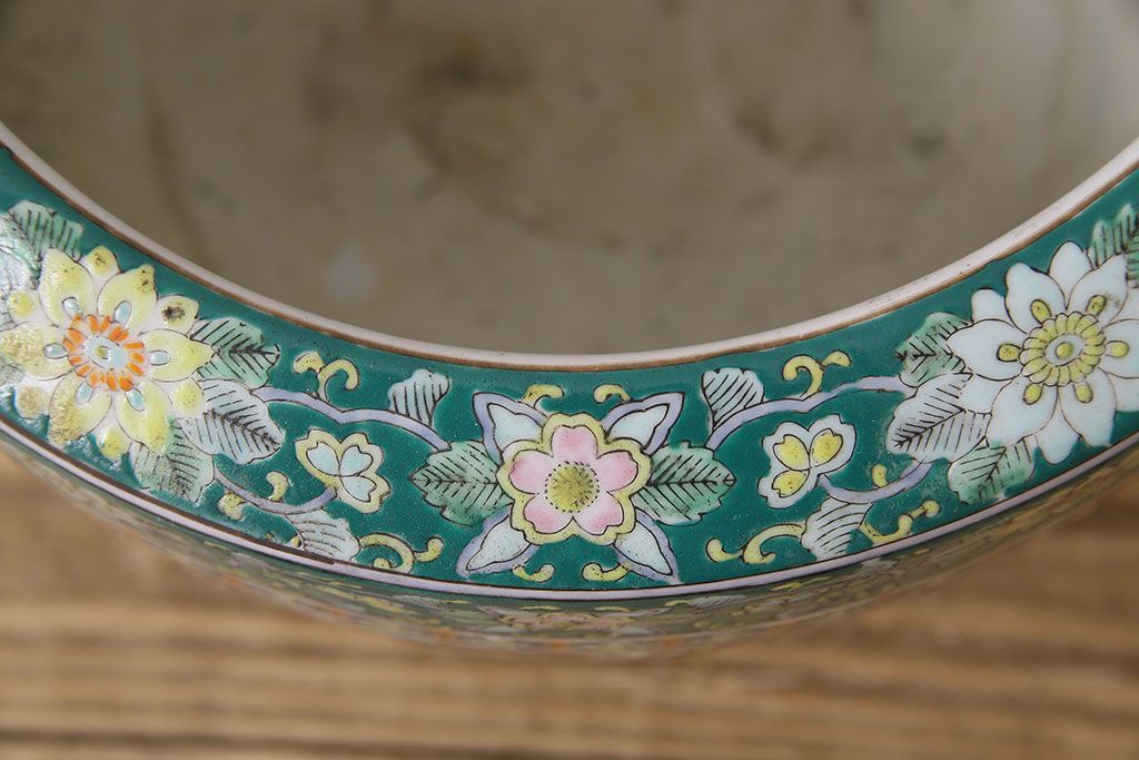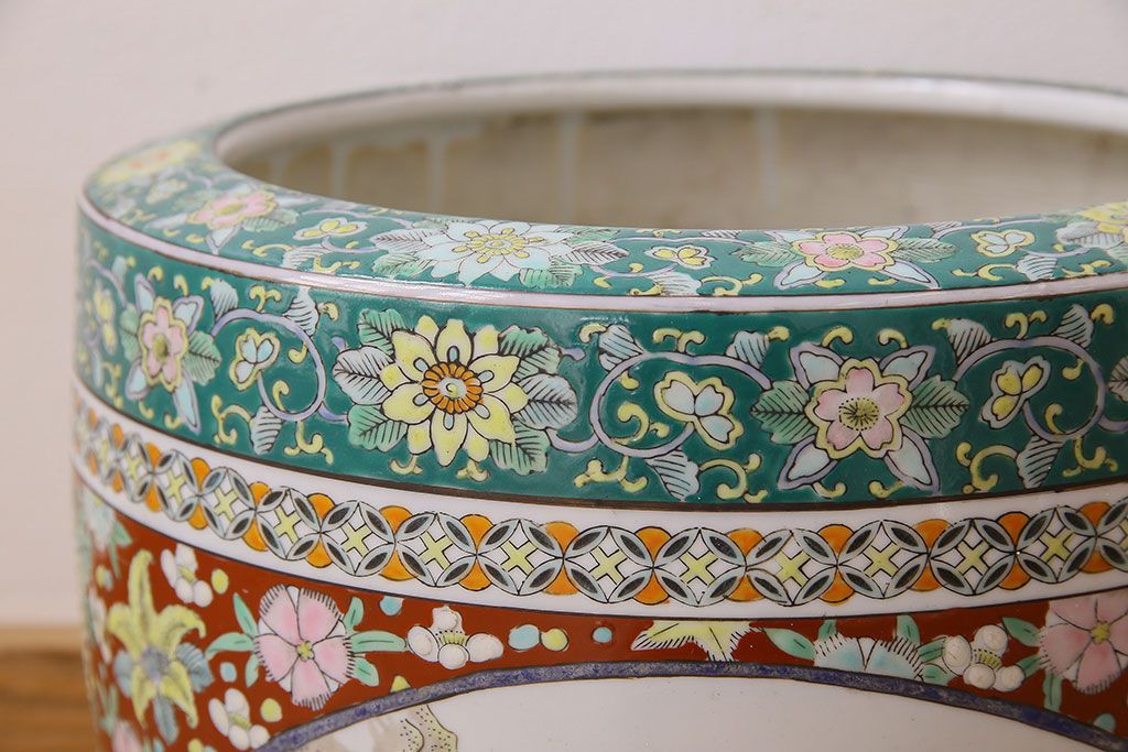 古民具・骨董 十錦手草花紋と窓絵が華やかな瀬戸火鉢です。