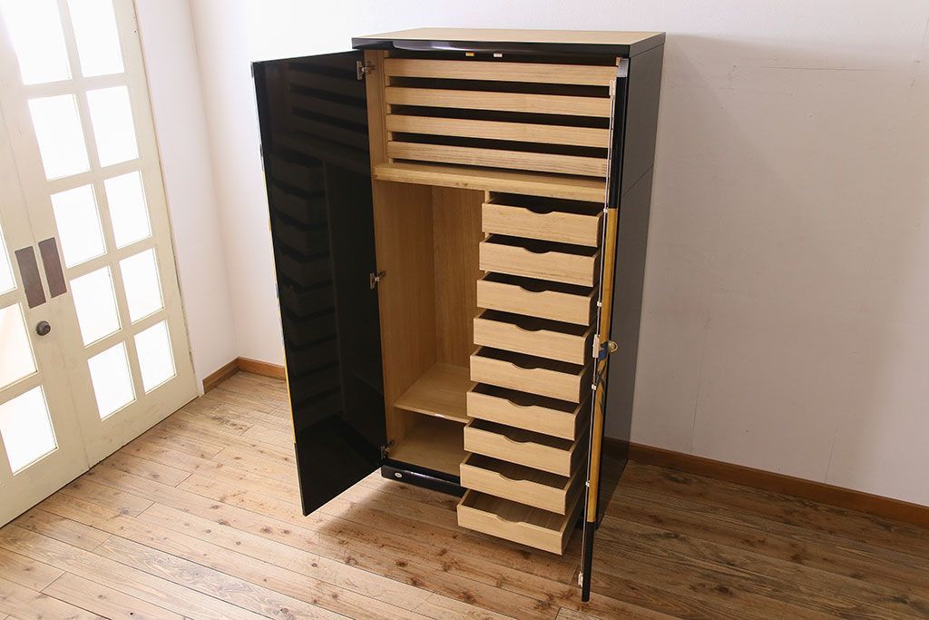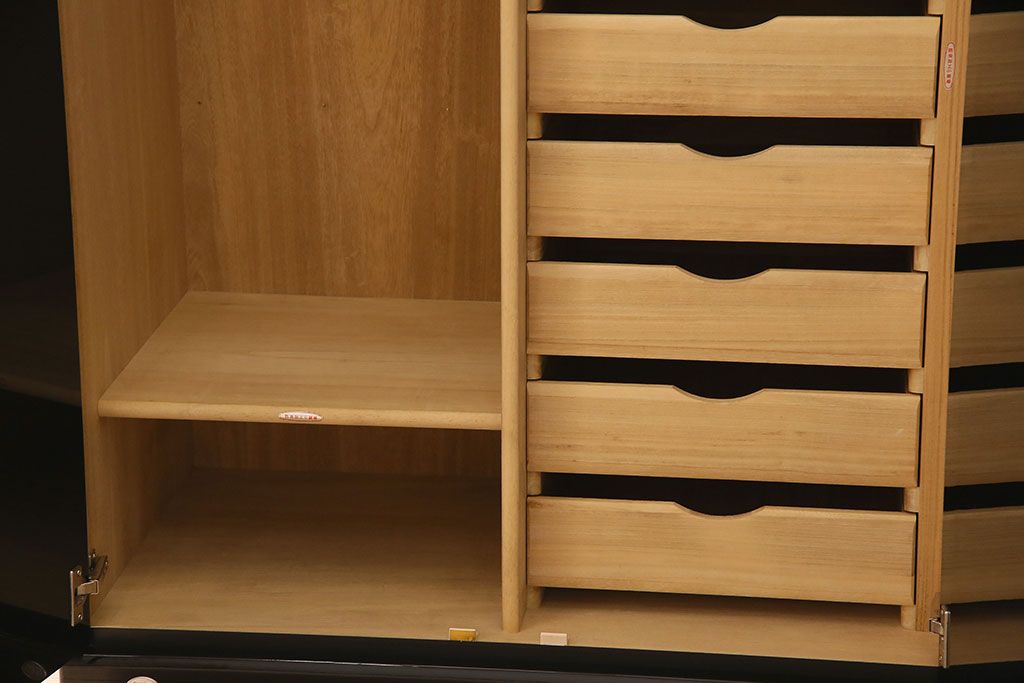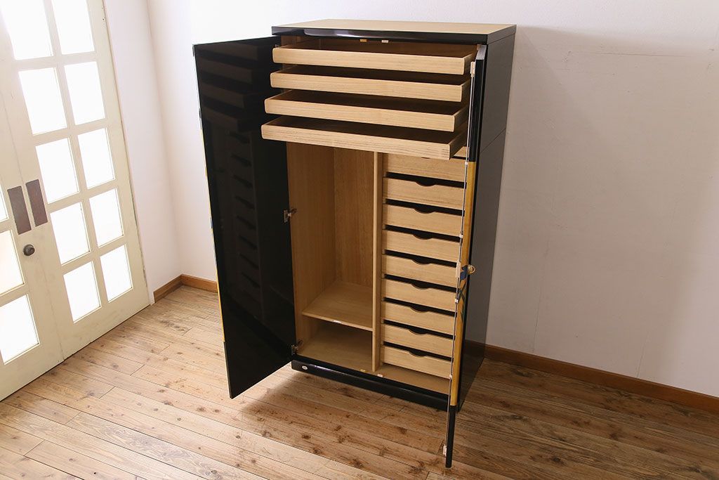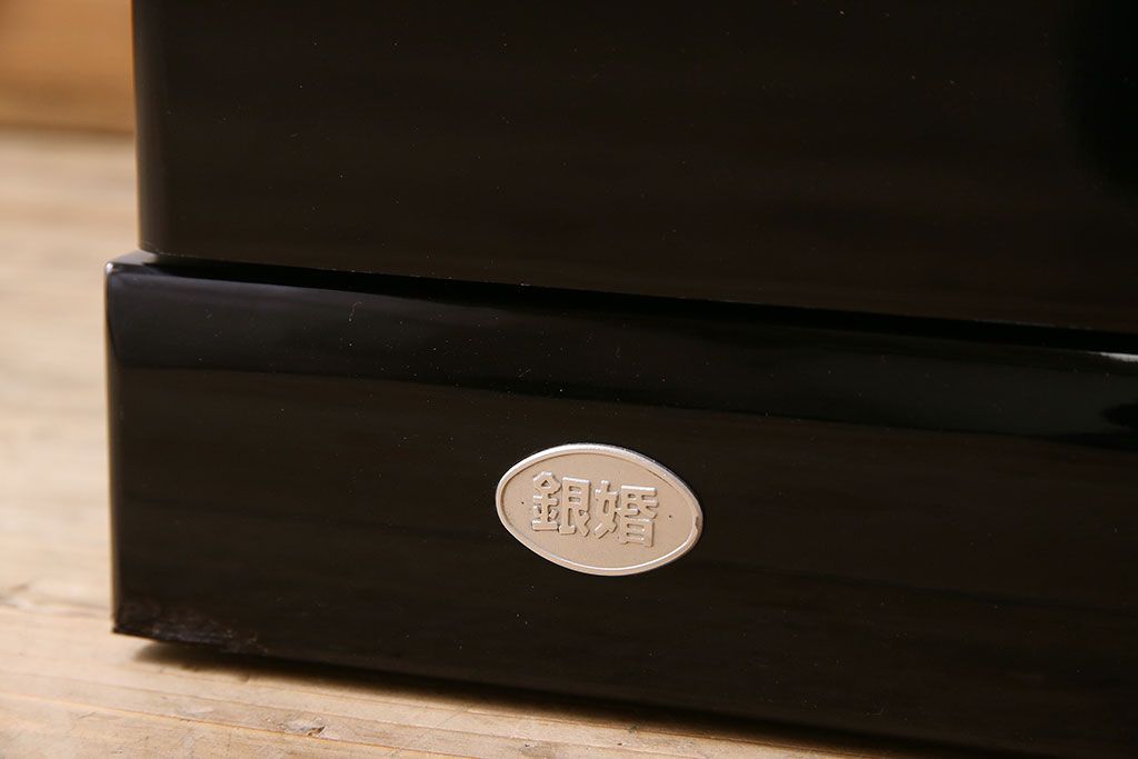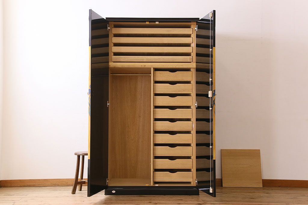 艶やかな黒の下地に鮮やかな花の絵が目を引く衣装箪笥です。