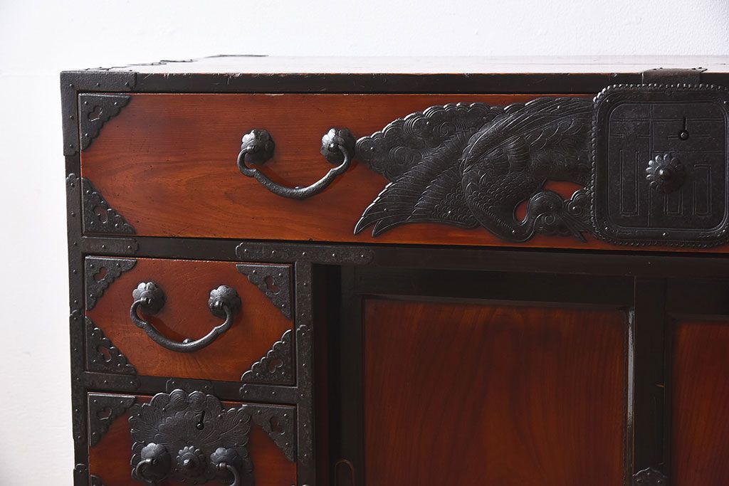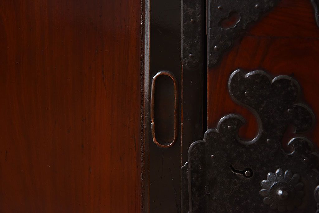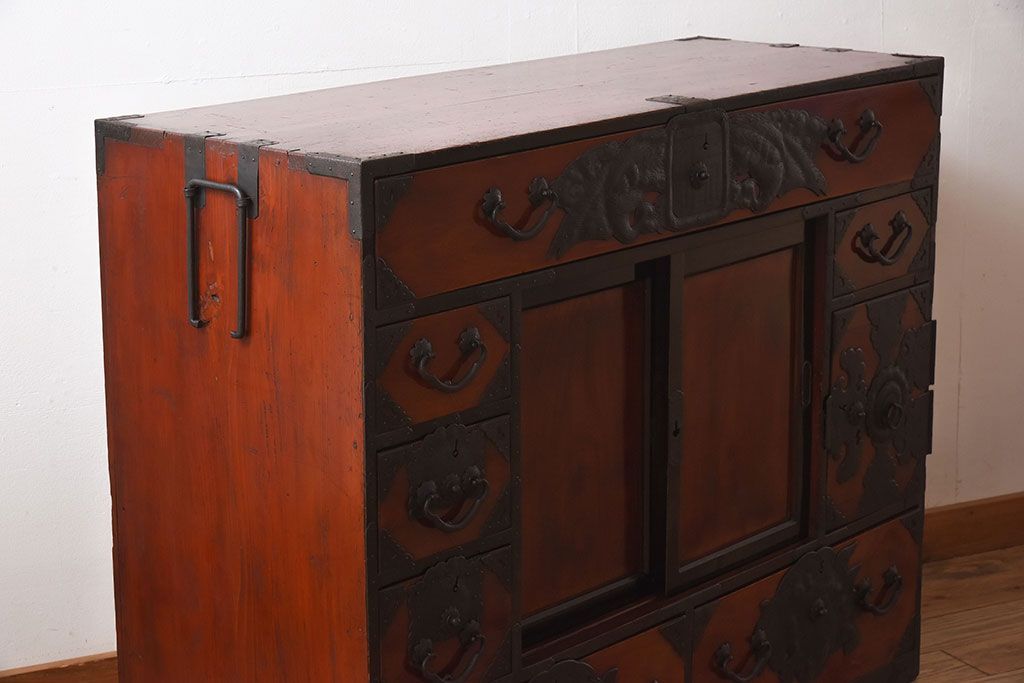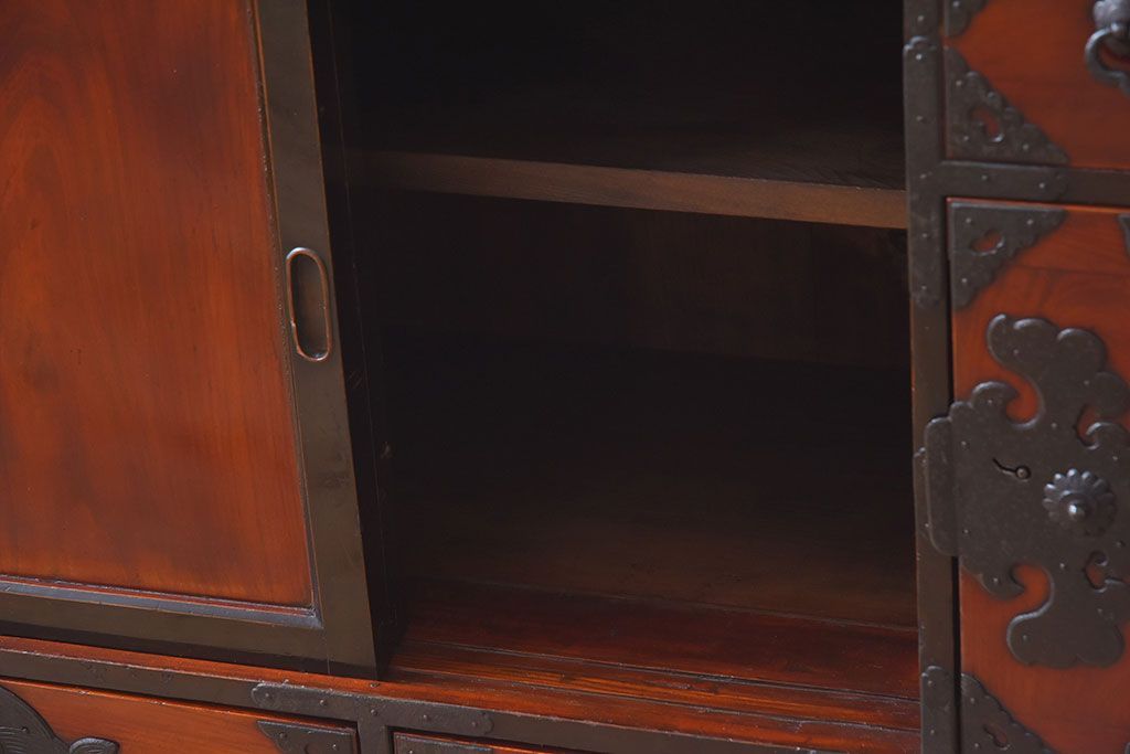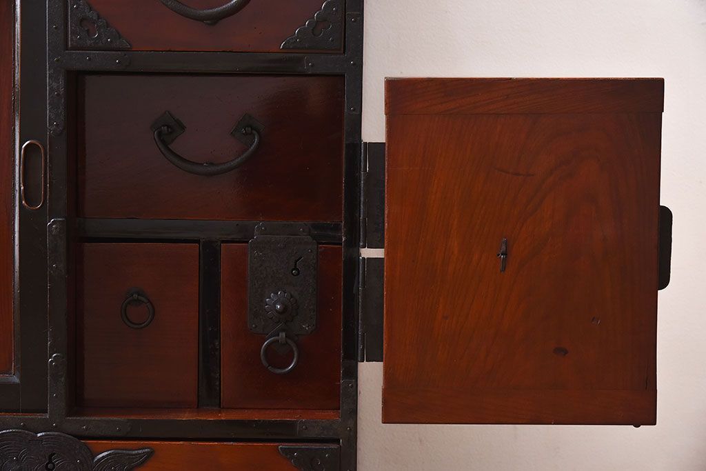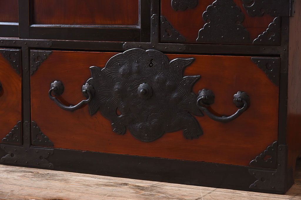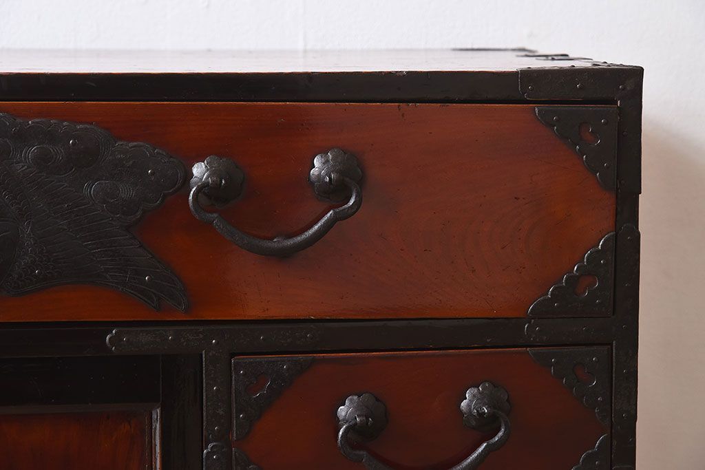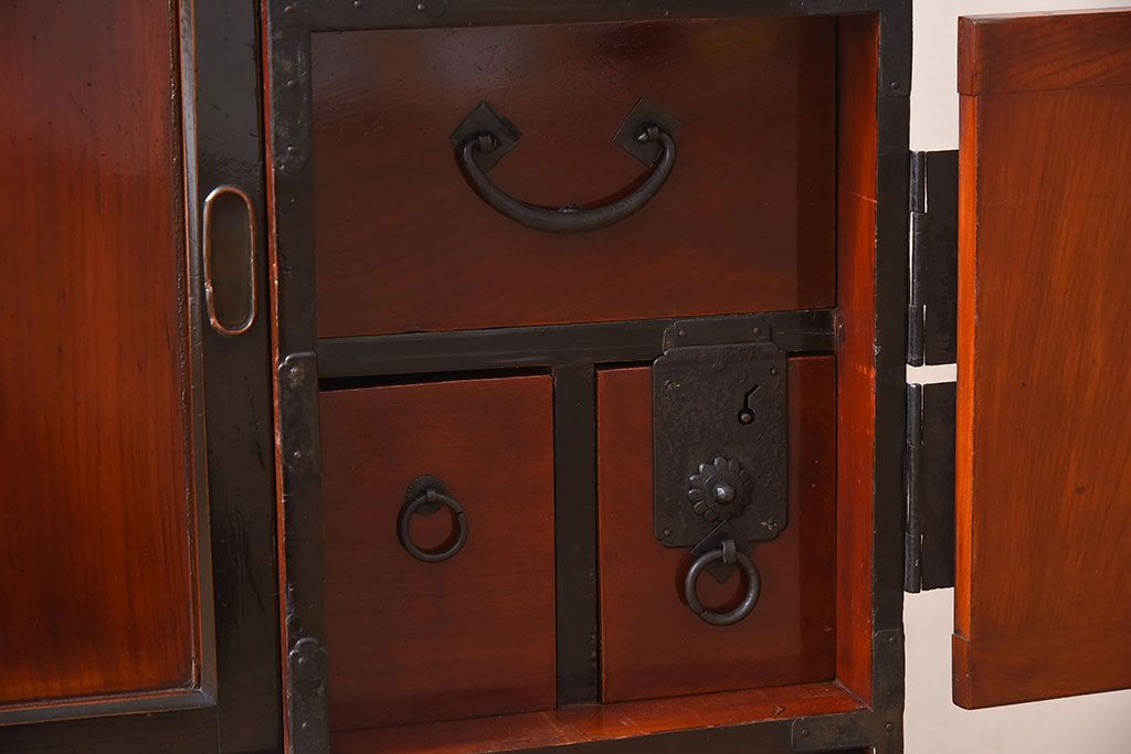 ラフジュ工房> 和箪笥> 船箪笥 > アンティーク家具 珍しい逸品 前面欅材の変わり型アンティーク仙台箪笥(帳場箪笥)