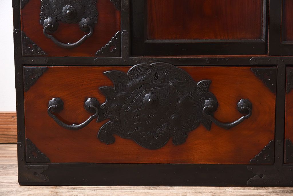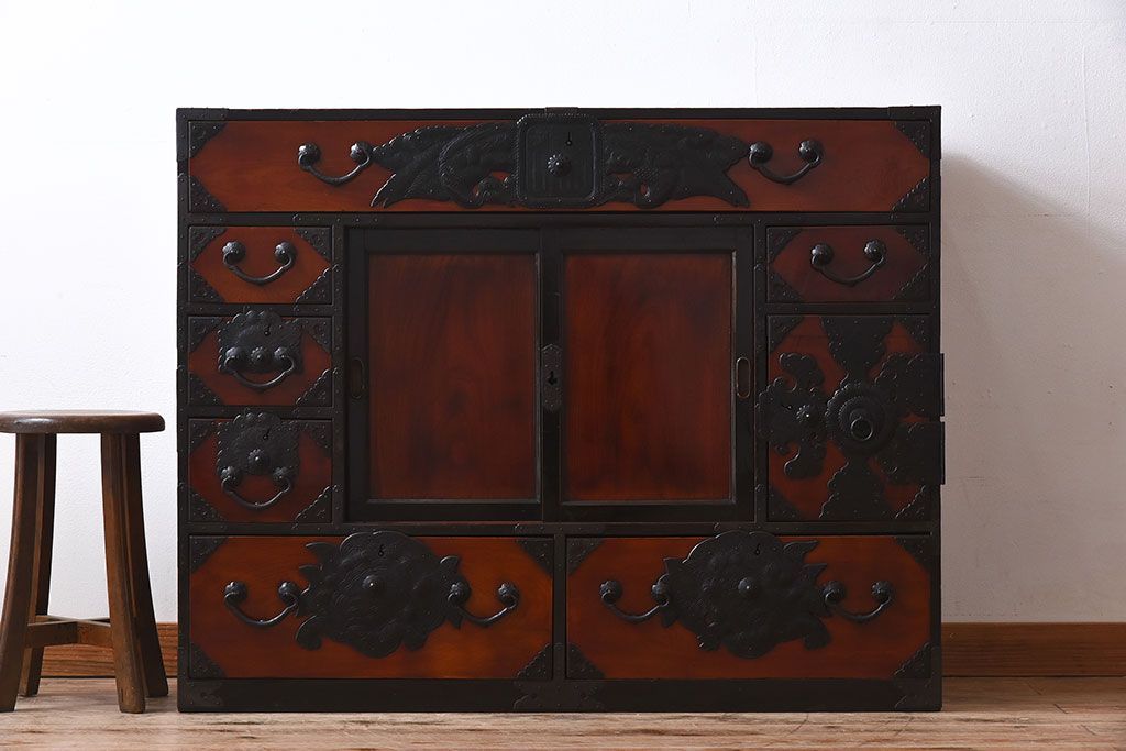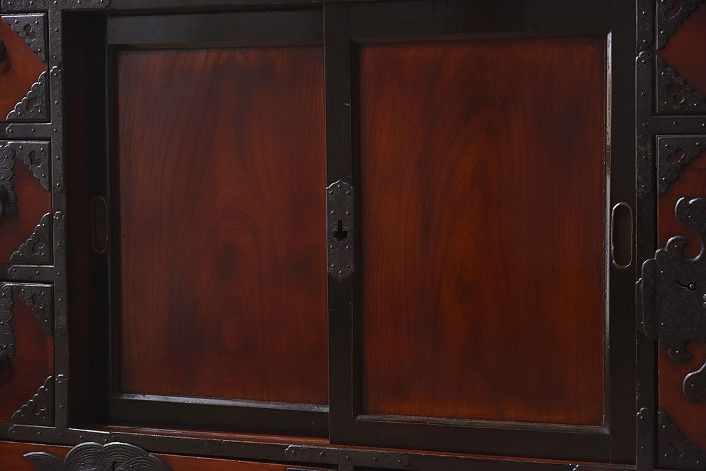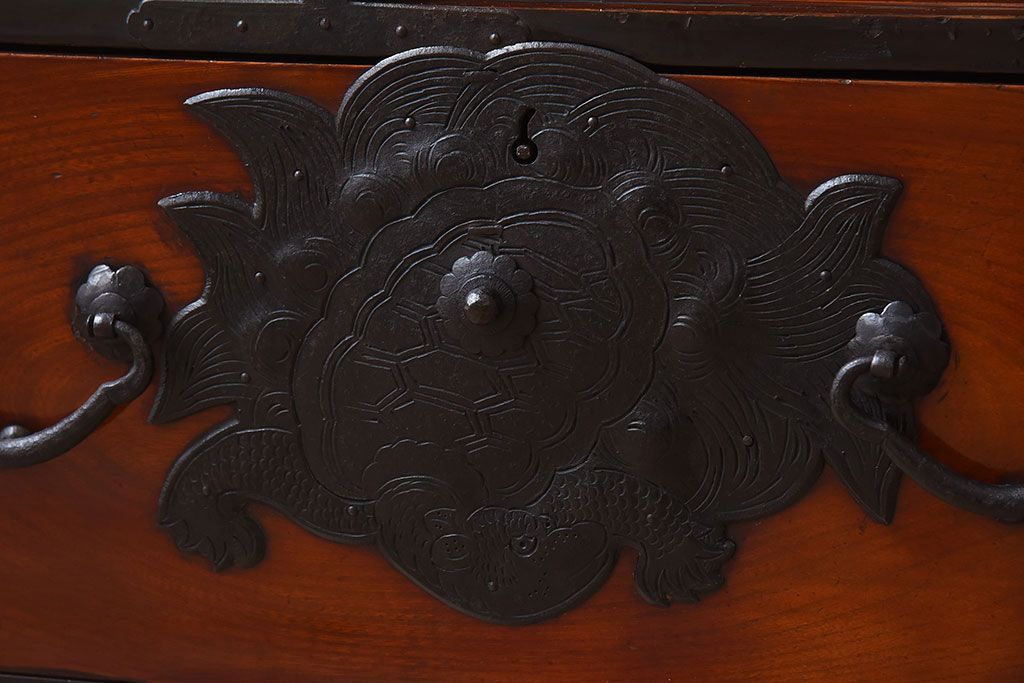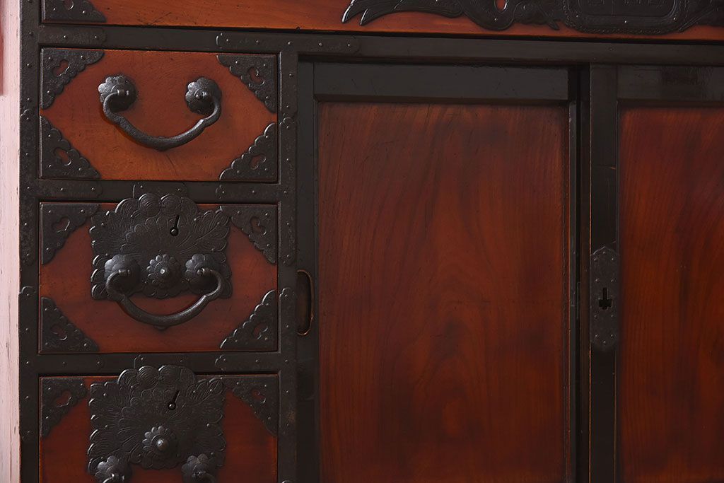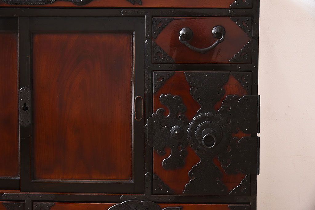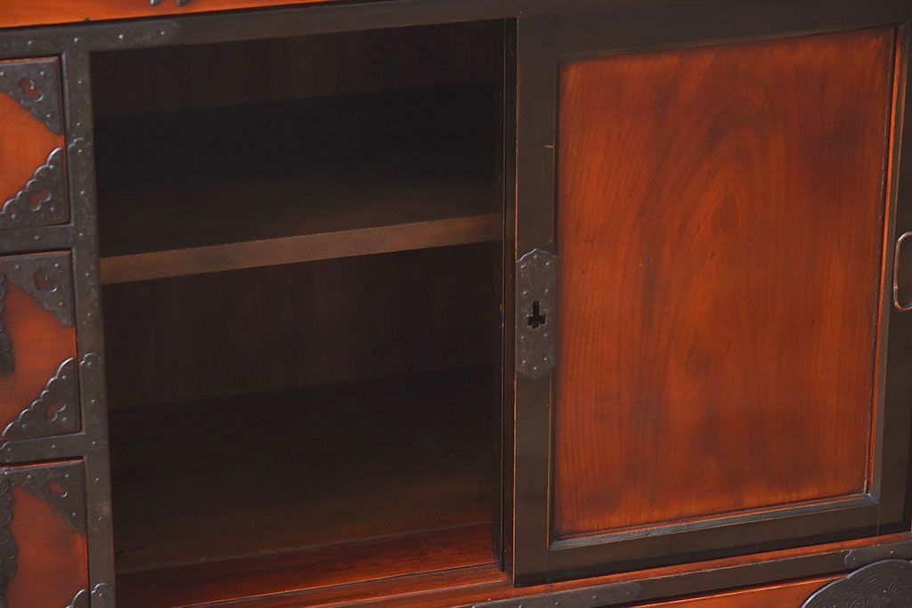 ラフジュ工房> 和箪笥> 船箪笥 > アンティーク家具 珍しい逸品 前面欅材の変わり型アンティーク仙台箪笥(帳場箪笥)