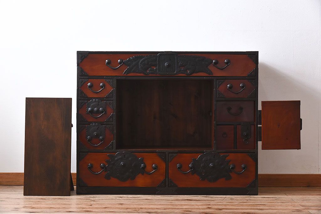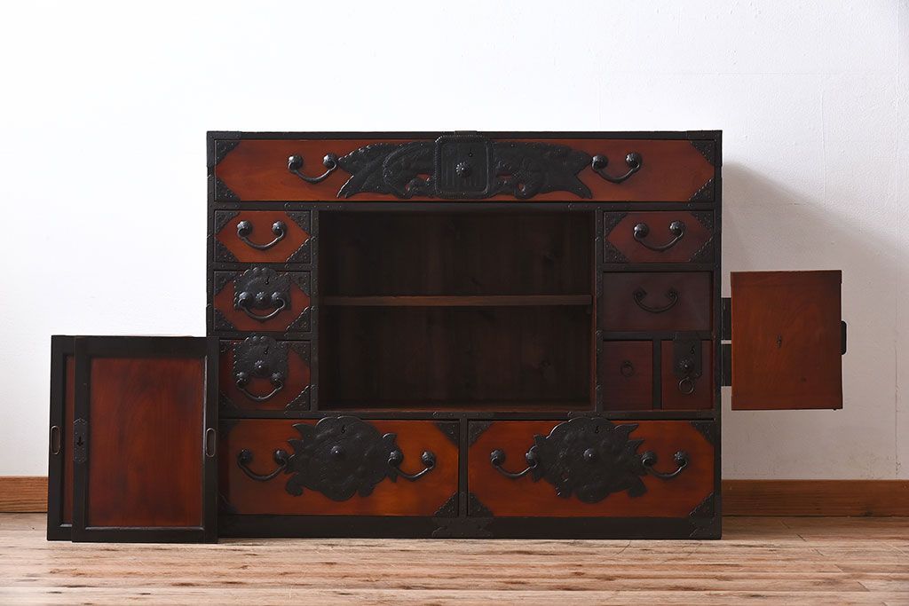 アンティーク家具 珍しい逸品 前面欅材の変わり型アンティーク仙台箪笥(帳場箪笥)