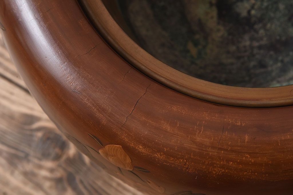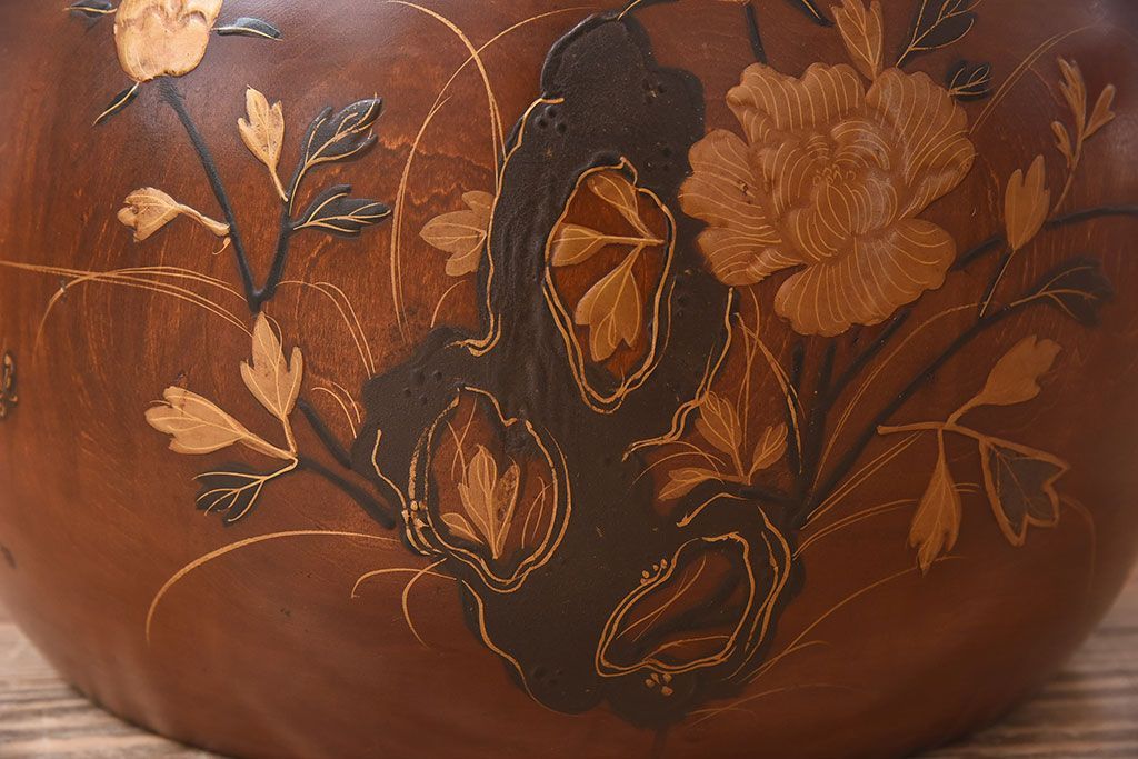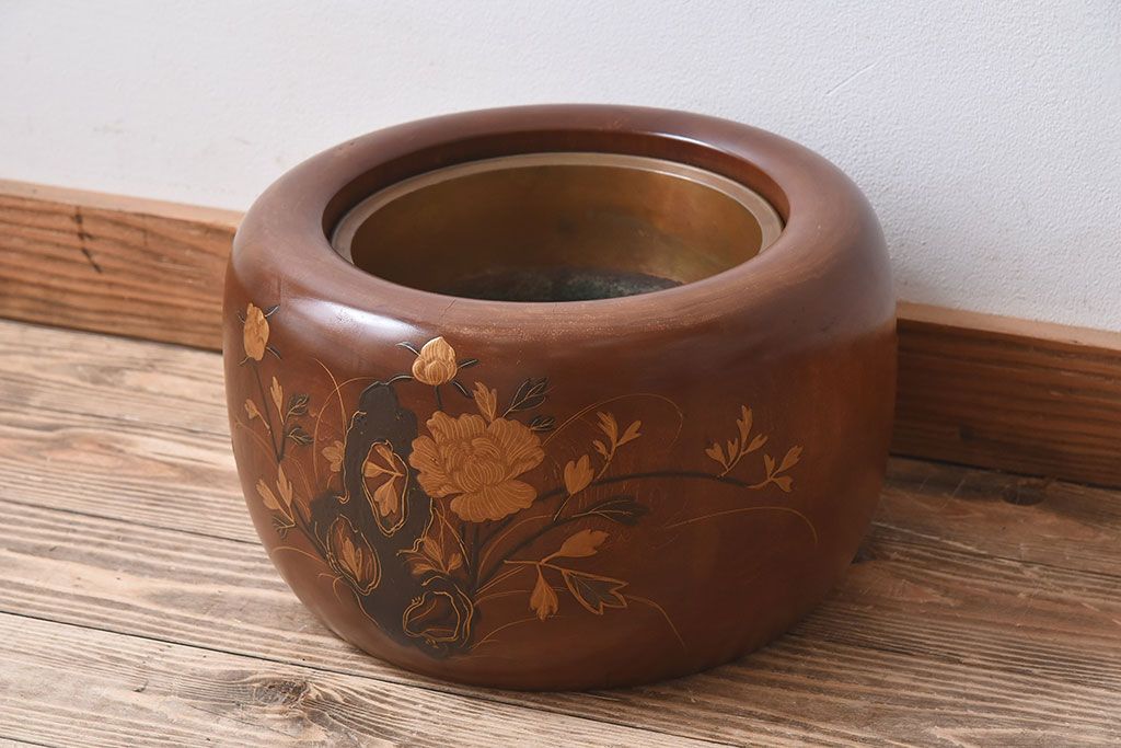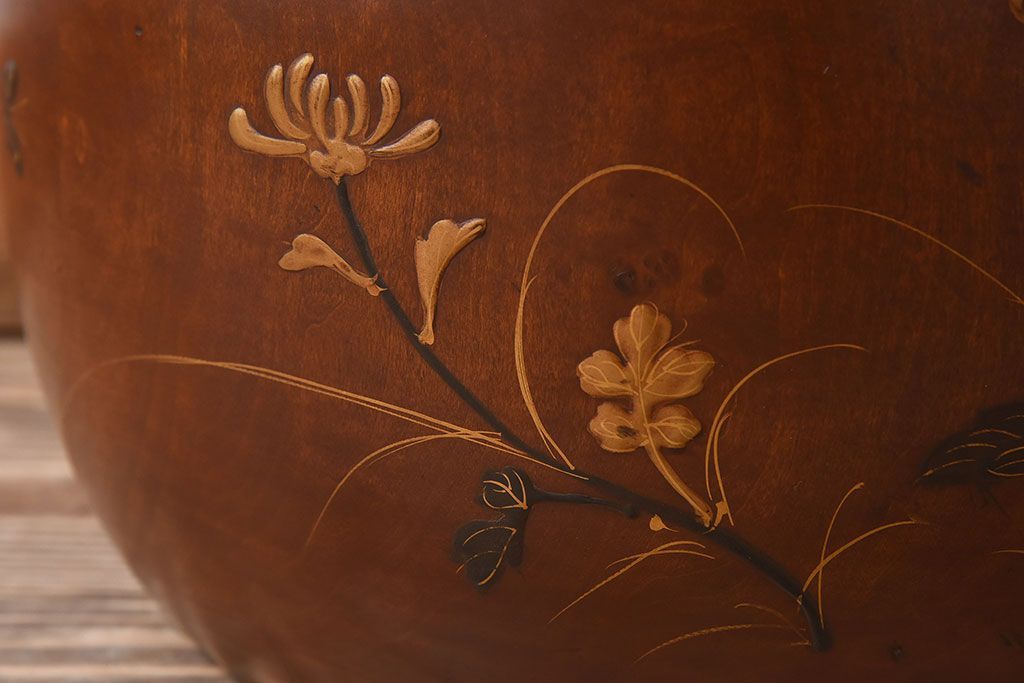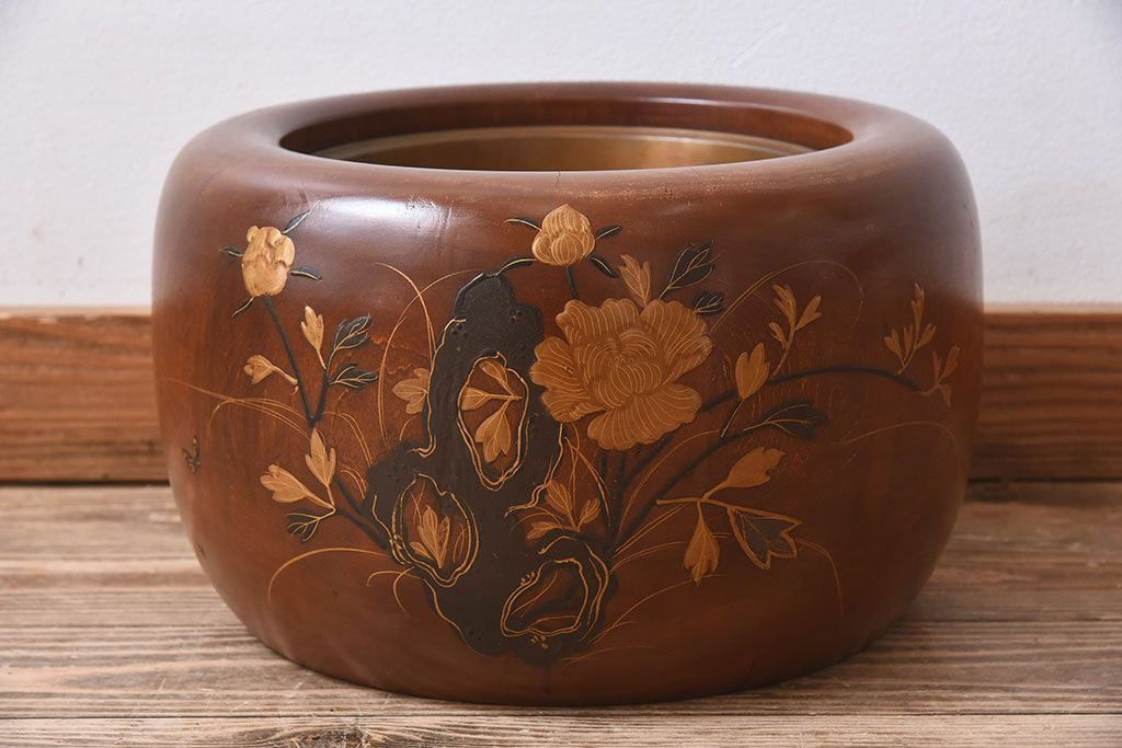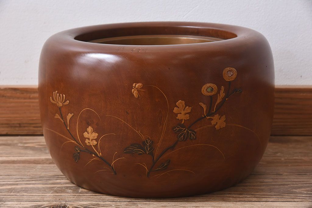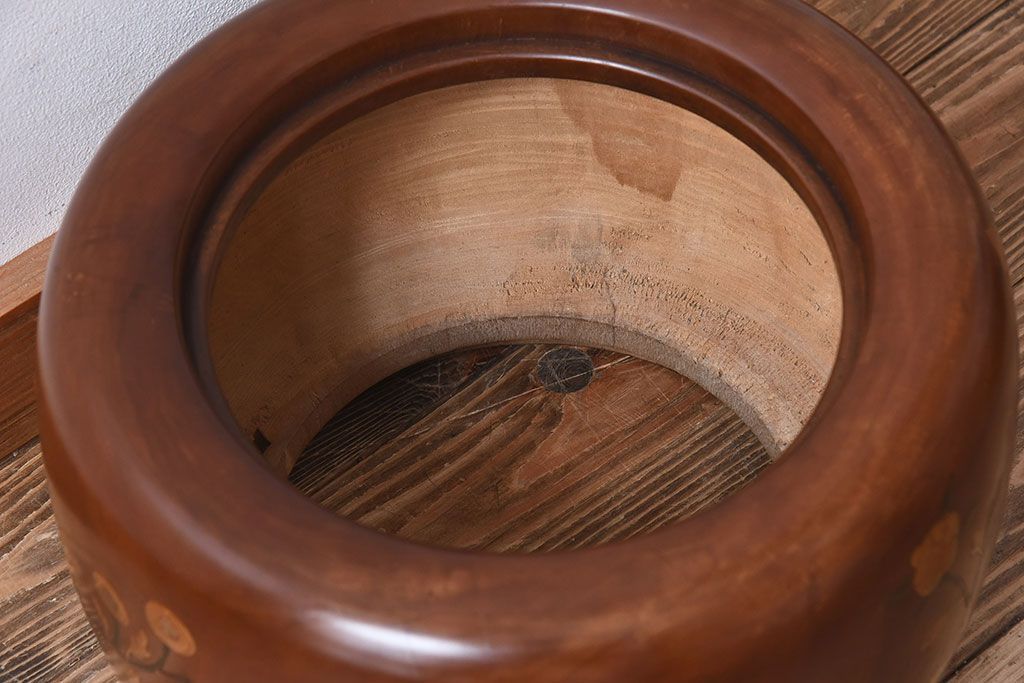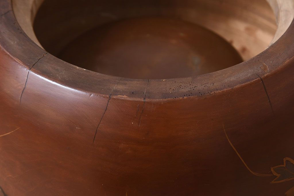 アンティーク雑貨 古民具・骨董 栃の木 木製 蒔絵が美しい刳り貫き火鉢