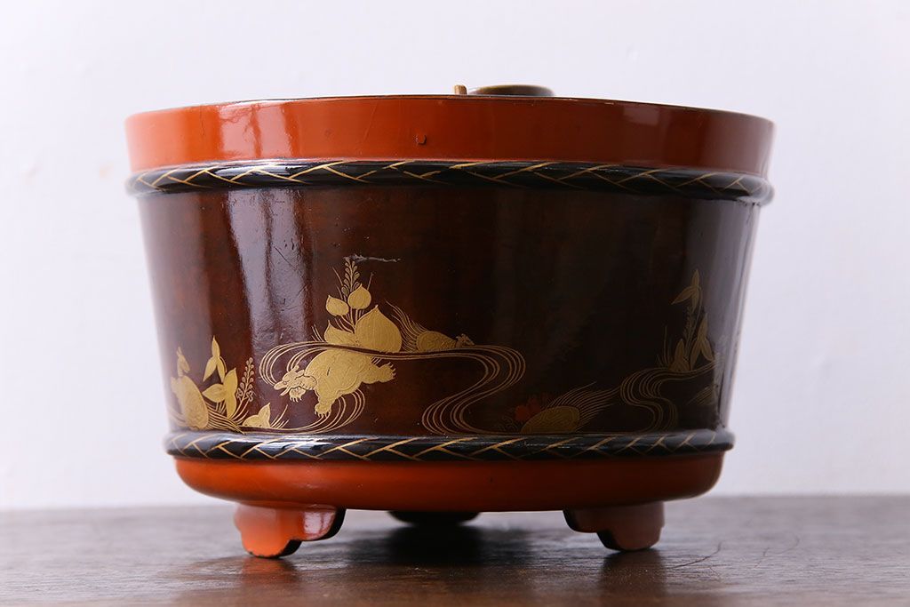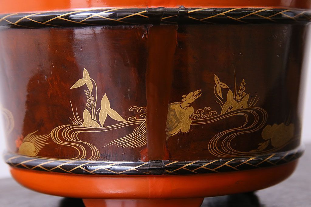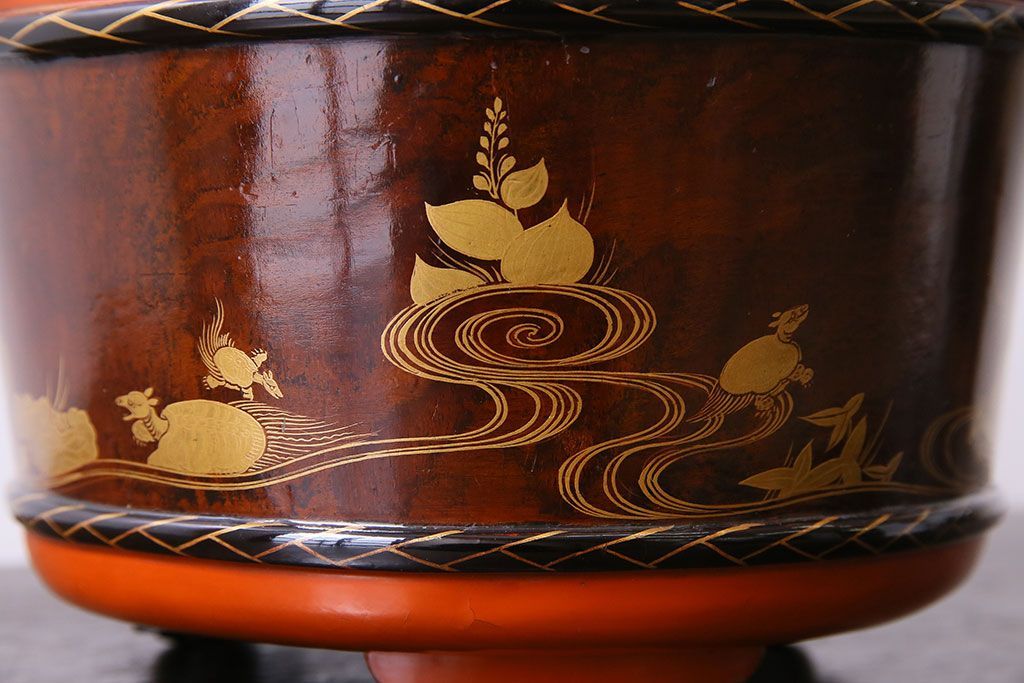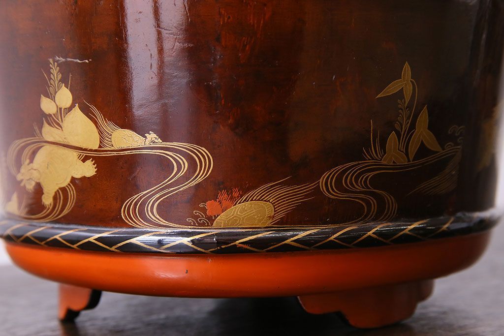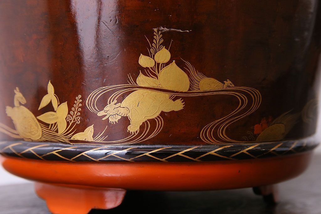 ラフジュ工房> 骨董・美術品 > 古民具・骨董 漆塗り 吉祥画 漆塗りが美しい亀の蒔絵の酒樽(酒入れ・漆器)