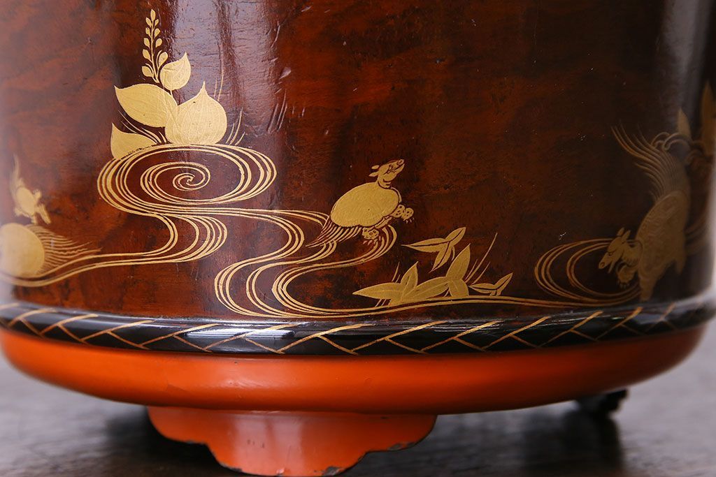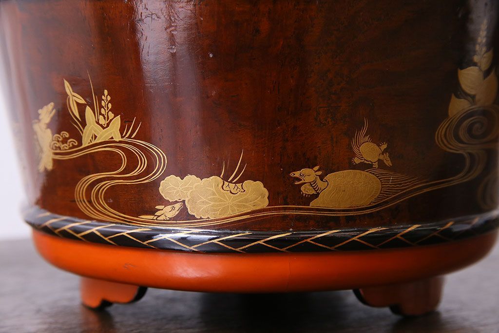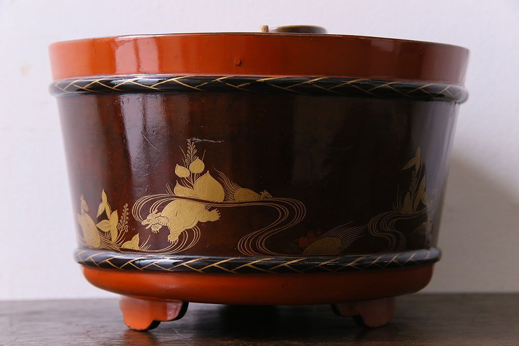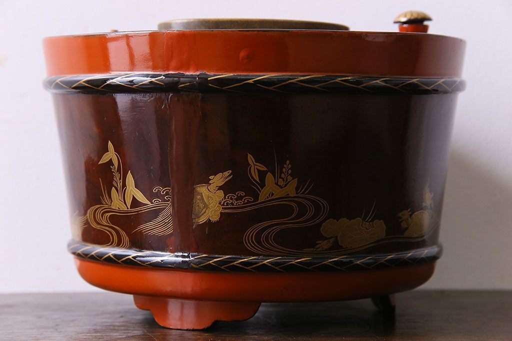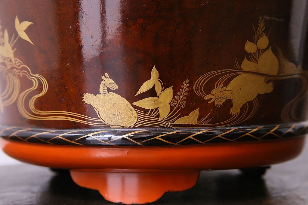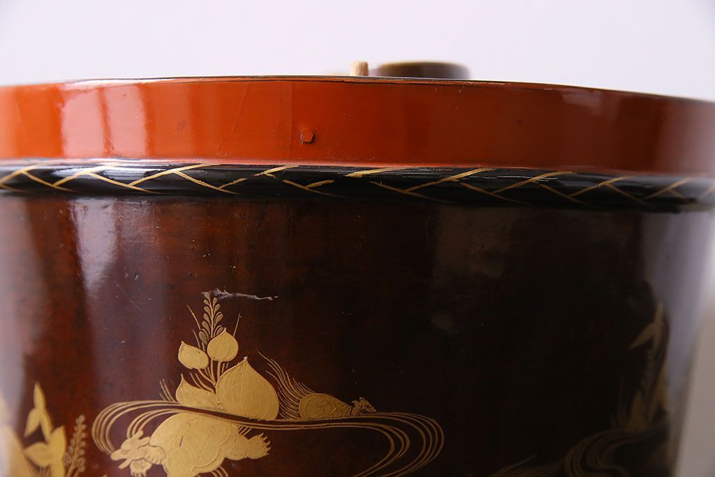 古民具・骨董 漆塗り 吉祥画 漆塗りが美しい亀の蒔絵の酒樽(酒入れ・漆器)