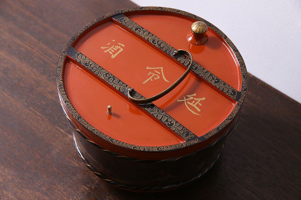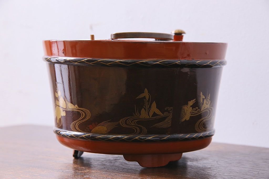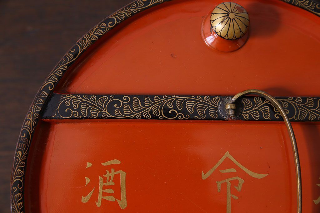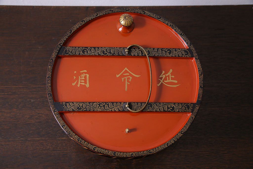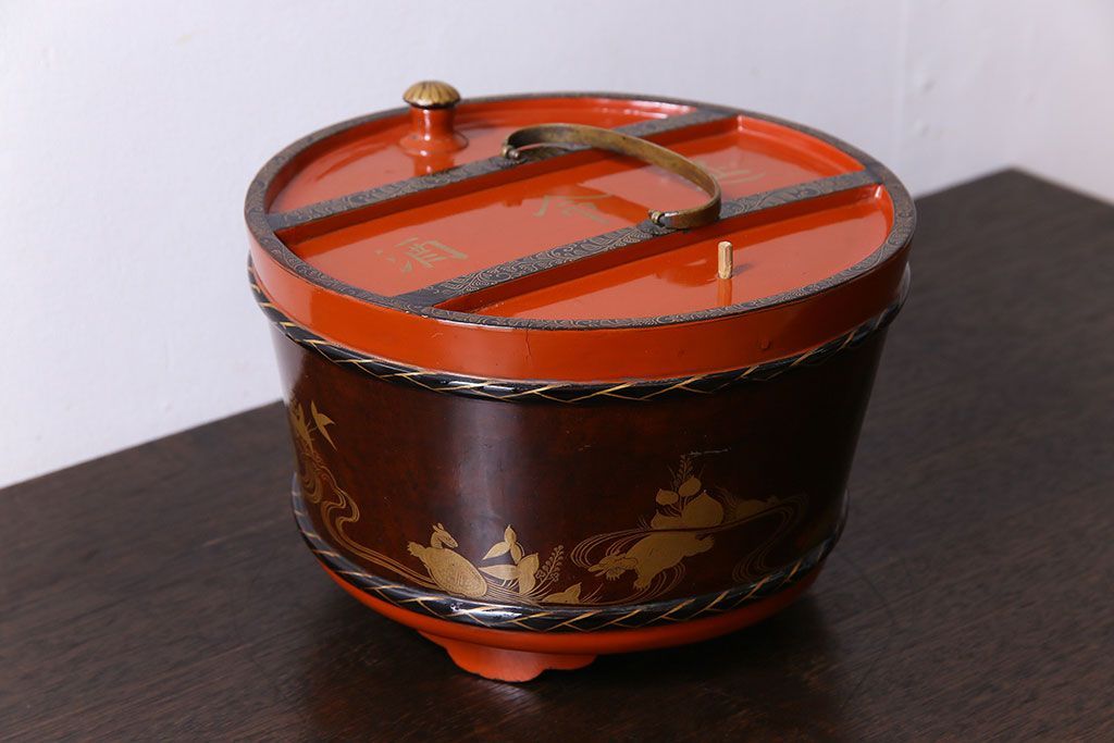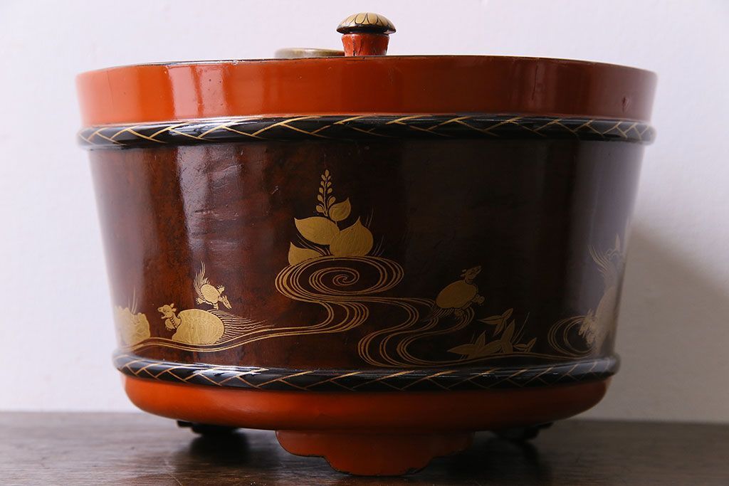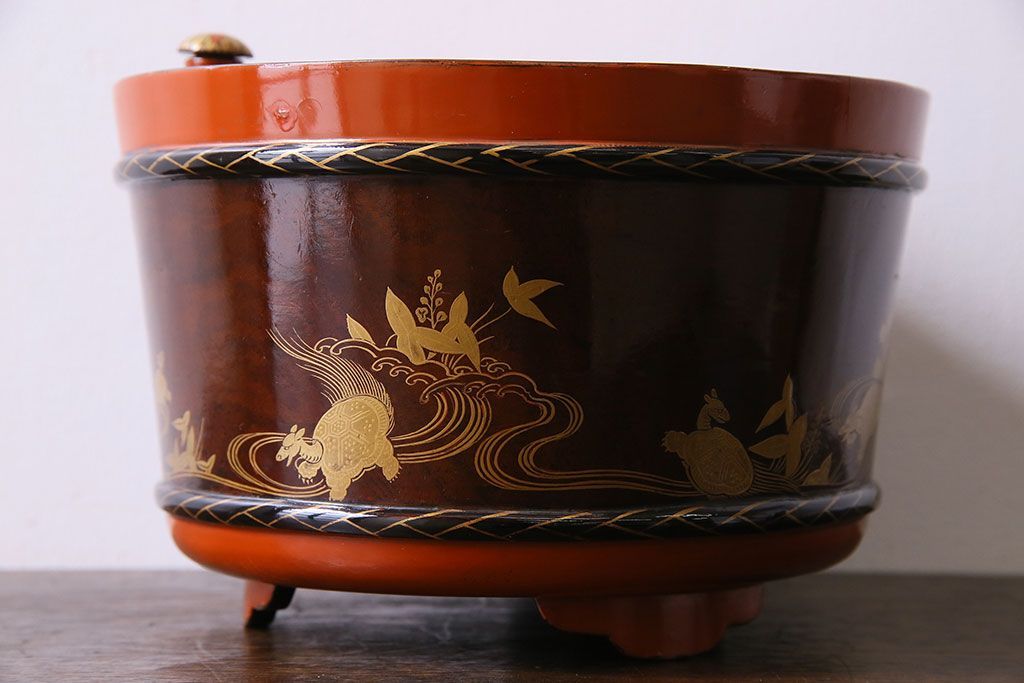 古民具・骨董 漆塗り 吉祥画 漆塗りが美しい亀の蒔絵の酒樽(酒入れ・漆器)