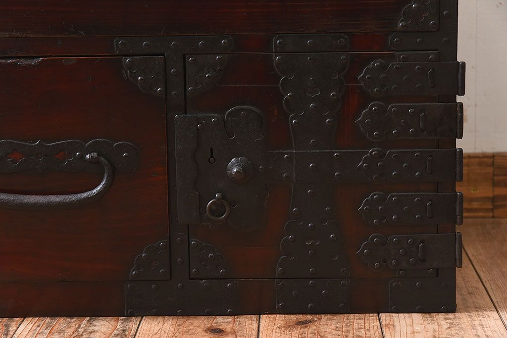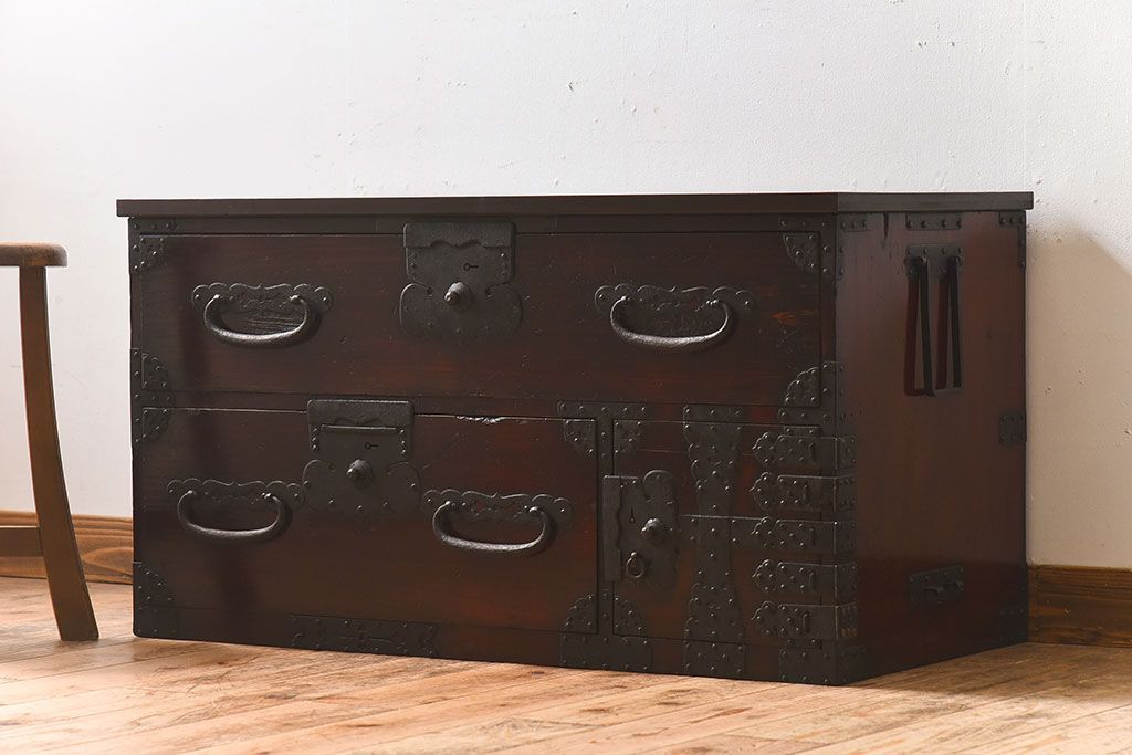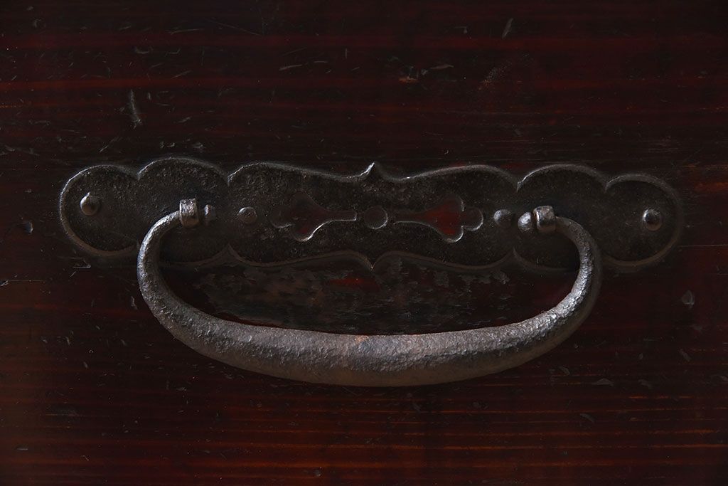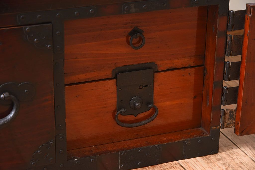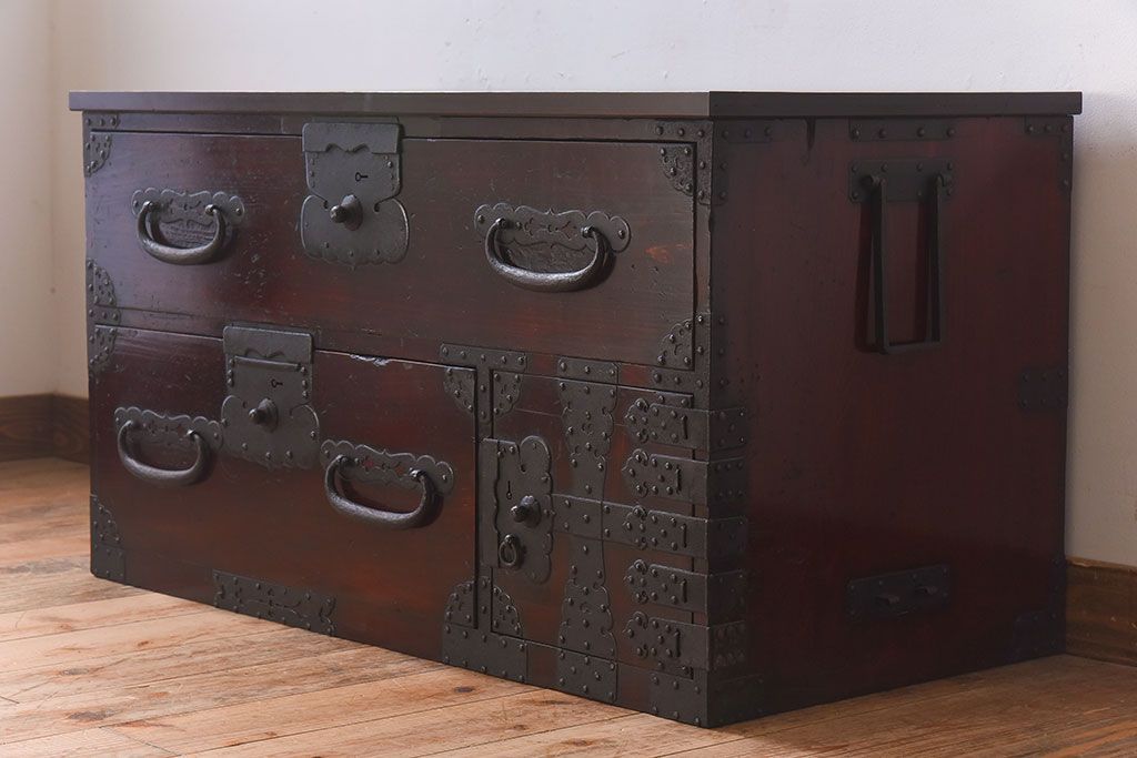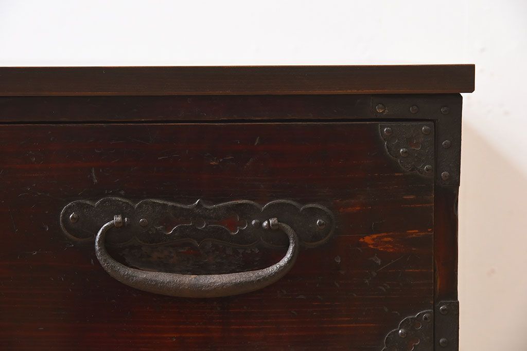 アンティーク家具 明治期 檜材天板 重厚な金具の時代箪笥ローボード(衣装箪笥)