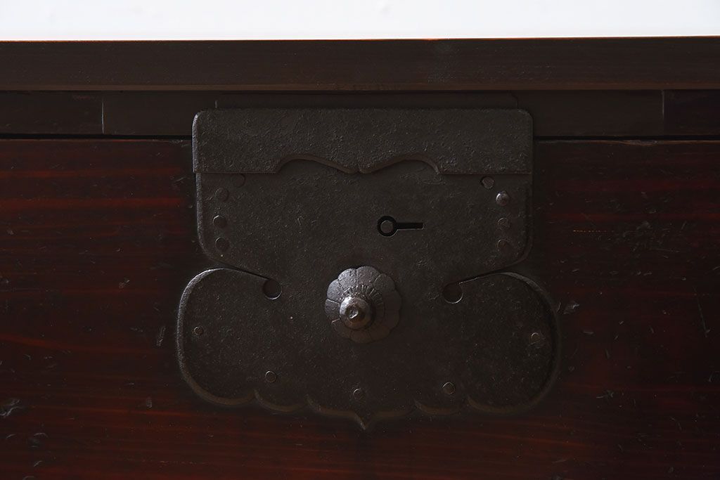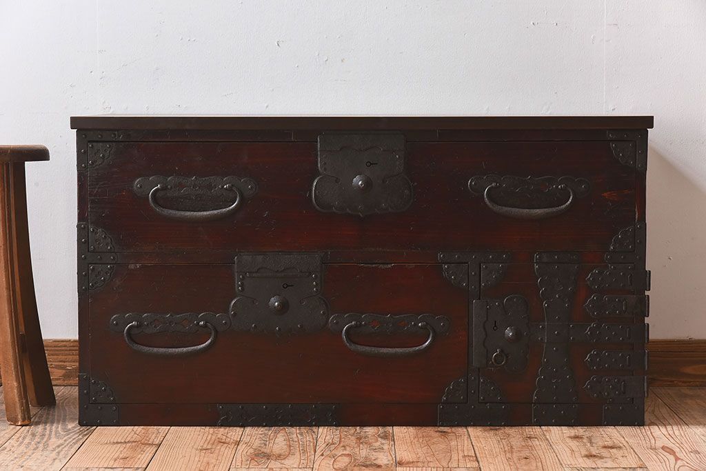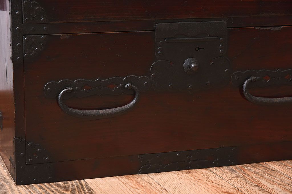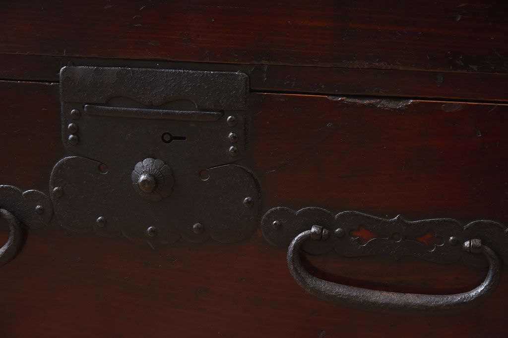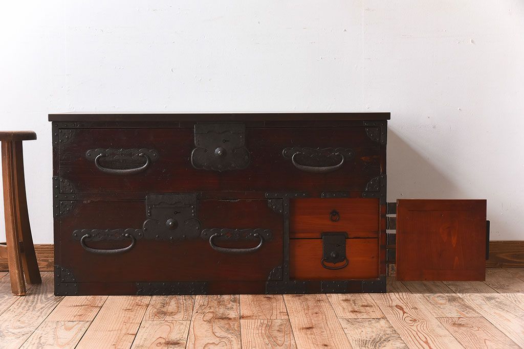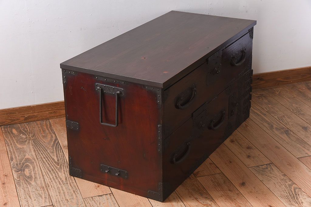 アンティーク家具 明治期 檜材天板 重厚な金具の時代箪笥ローボード(衣装箪笥)
