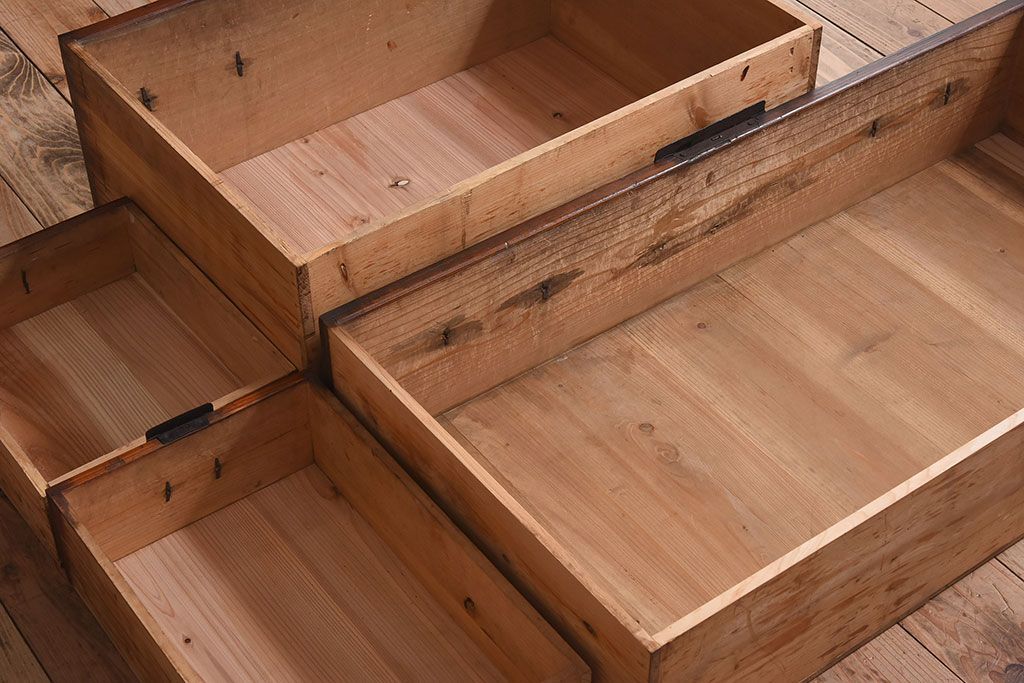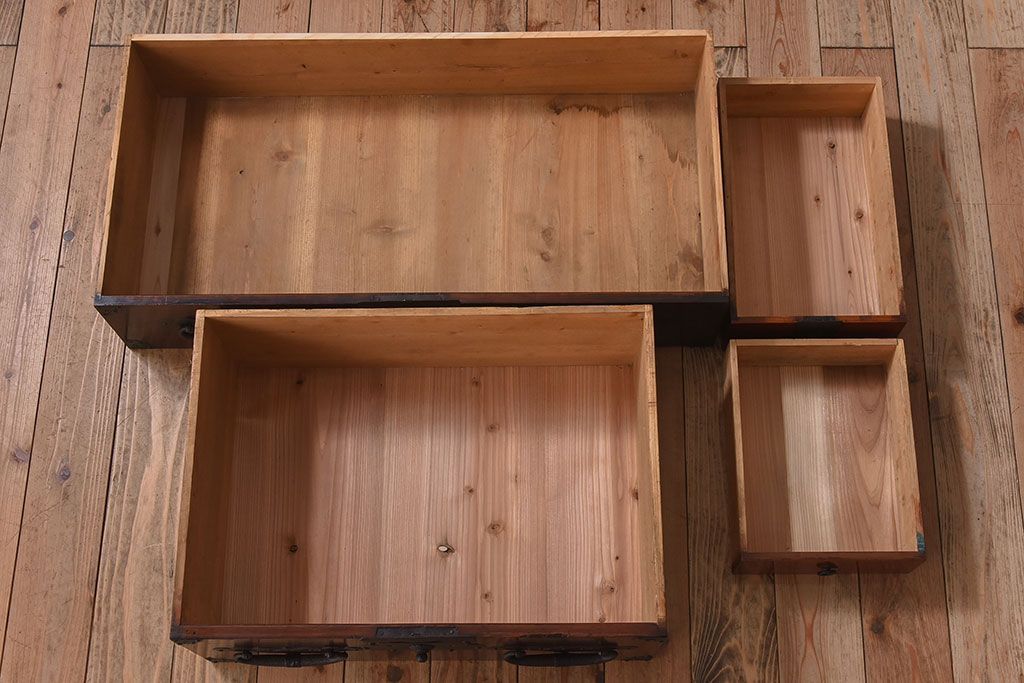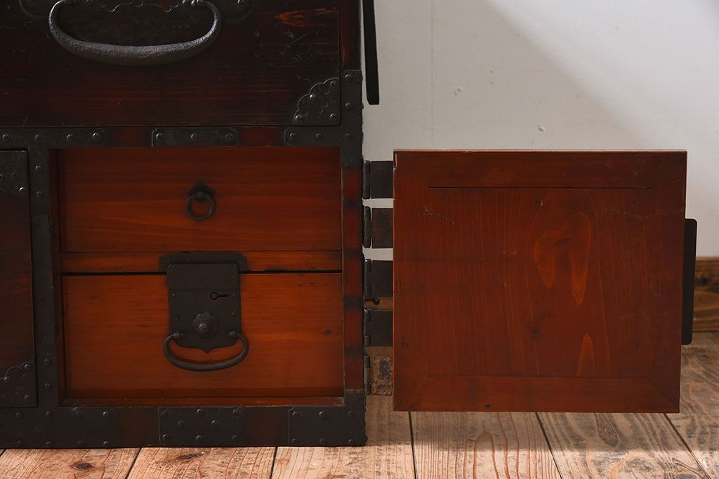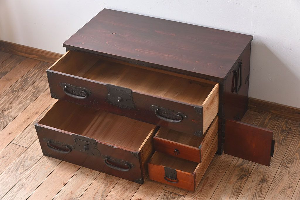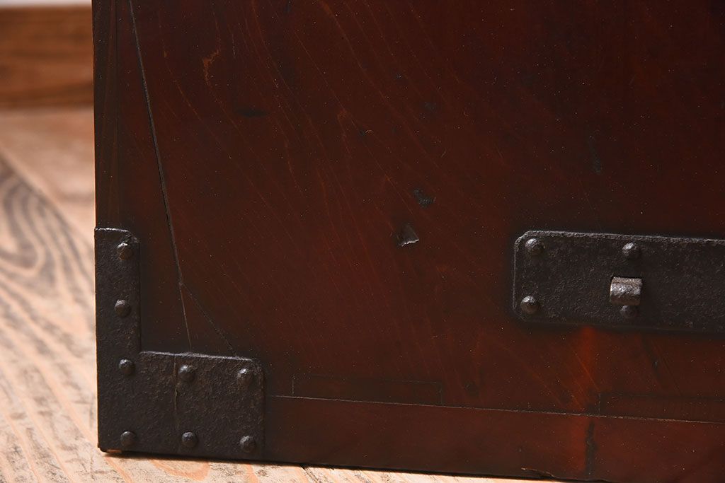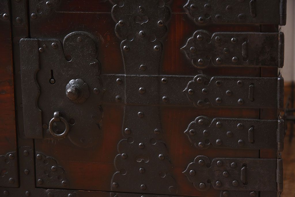 アンティーク家具 明治期 檜材天板 重厚な金具の時代箪笥ローボード(衣装箪笥)