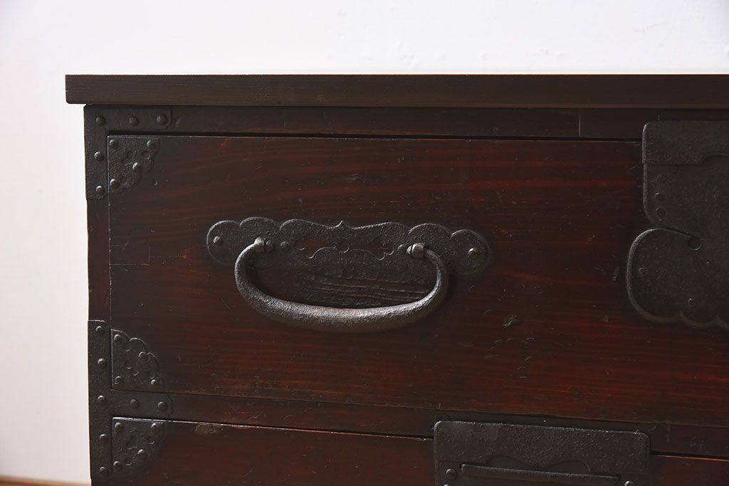 ラフジュ工房> 和箪笥 > アンティーク家具 明治期 檜材天板 重厚な金具の時代箪笥ローボード(衣装箪笥)