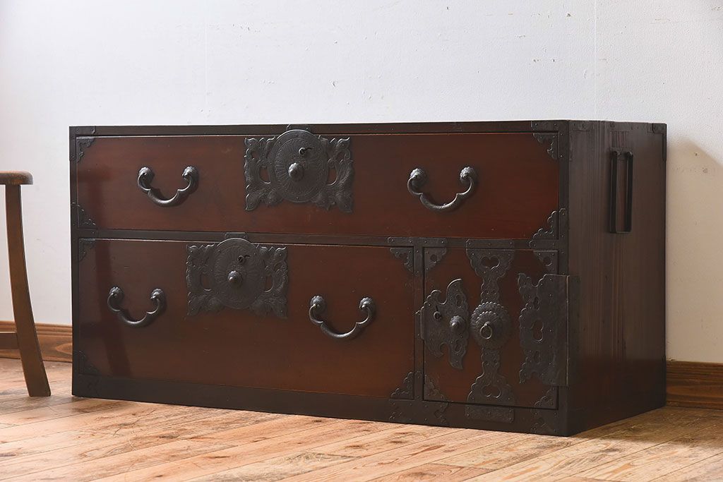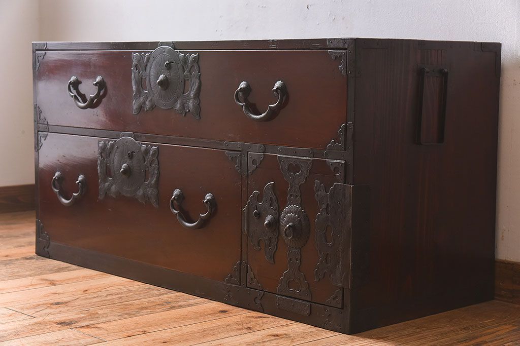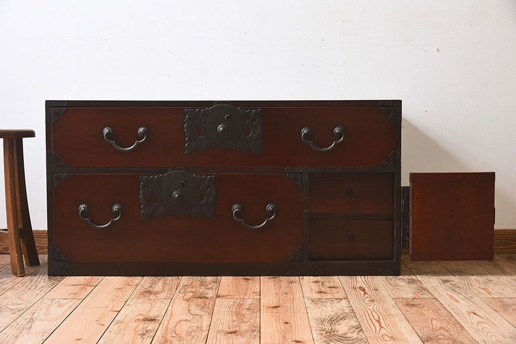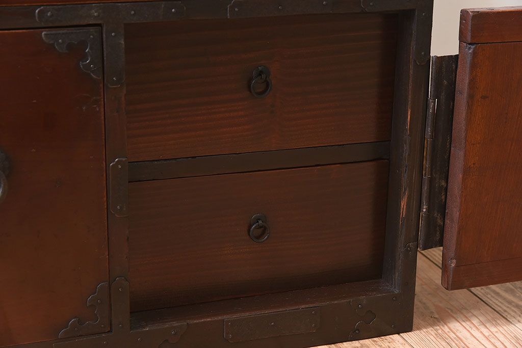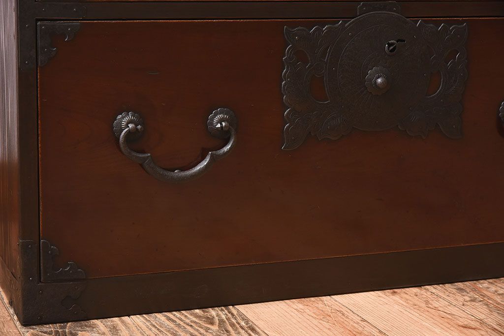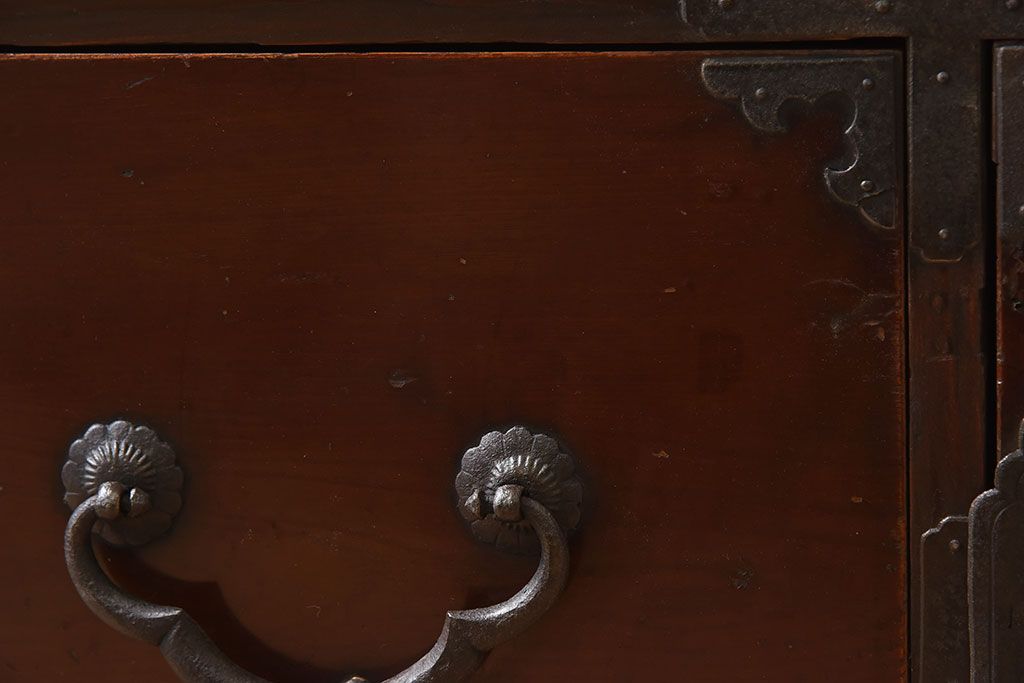 アンティーク家具 和製アンティーク 前面欅材 古い木の味わいが重厚な仙台箪笥ローボード(衣装箪笥)(2)