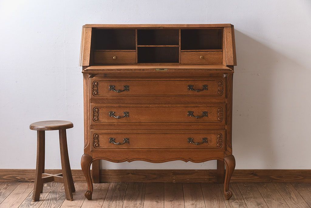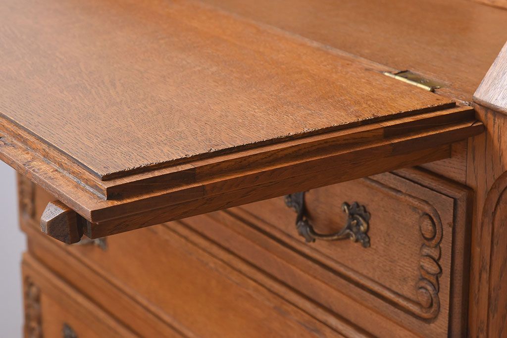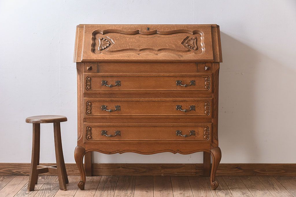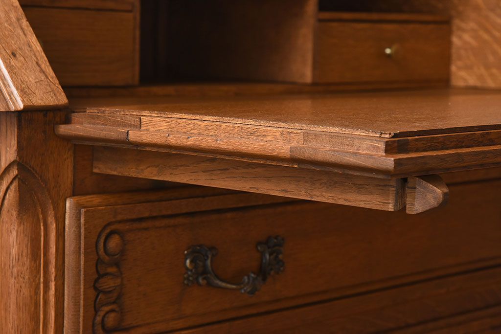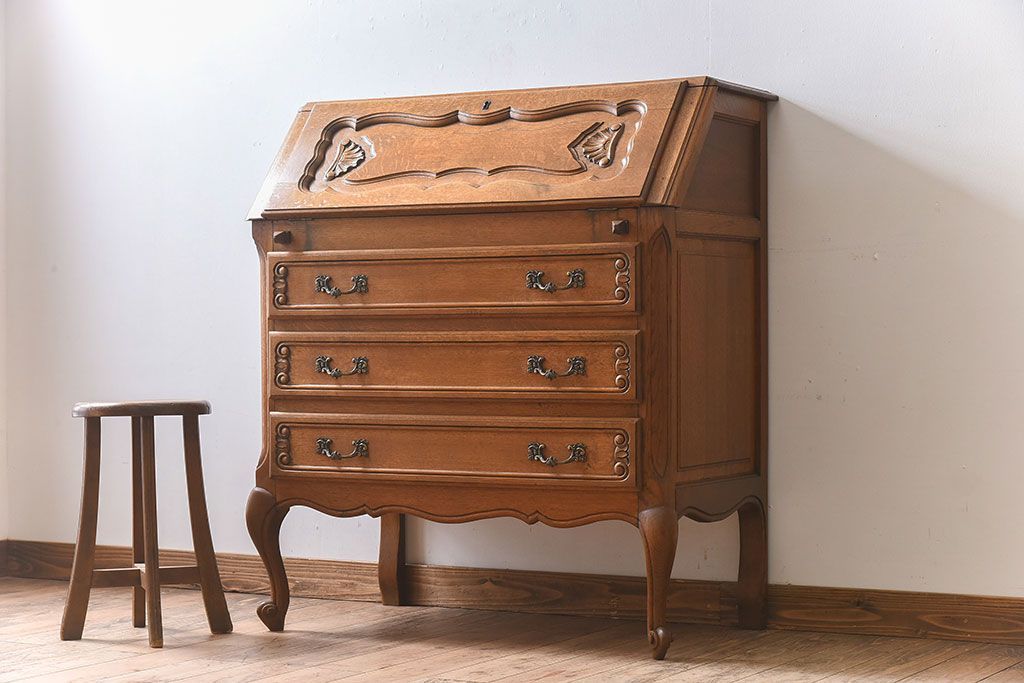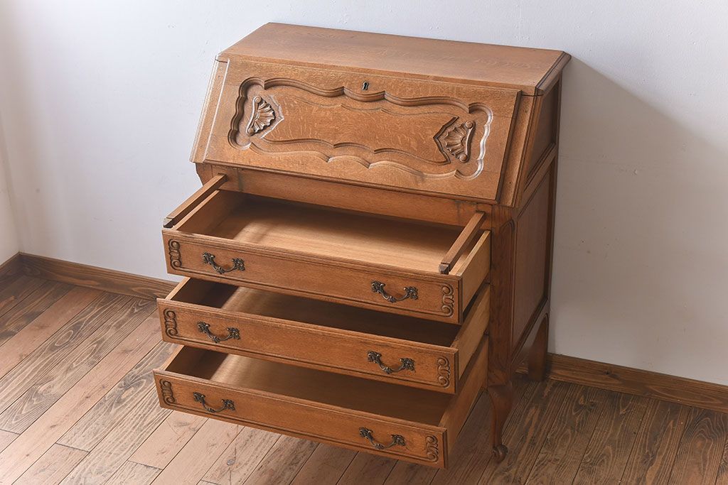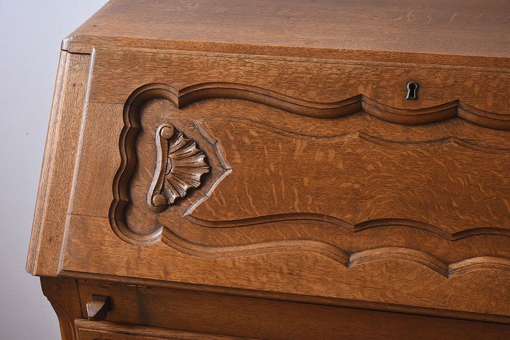 ヴィンテージ家具 フランスビンテージ 美しい彫刻入り!上質なオーク材製のライティングビューロー