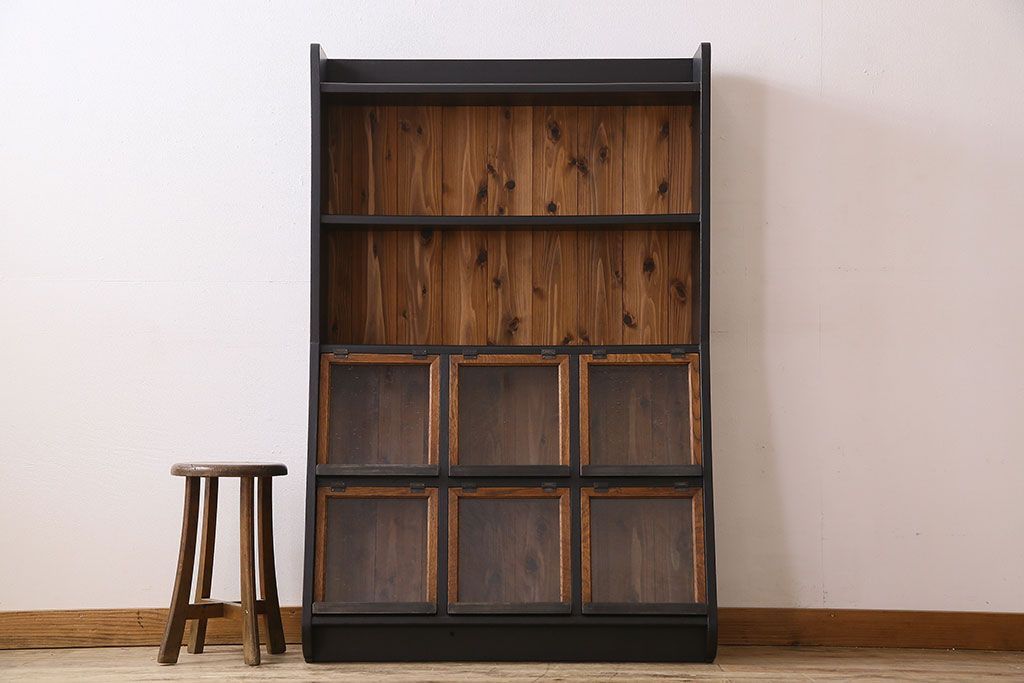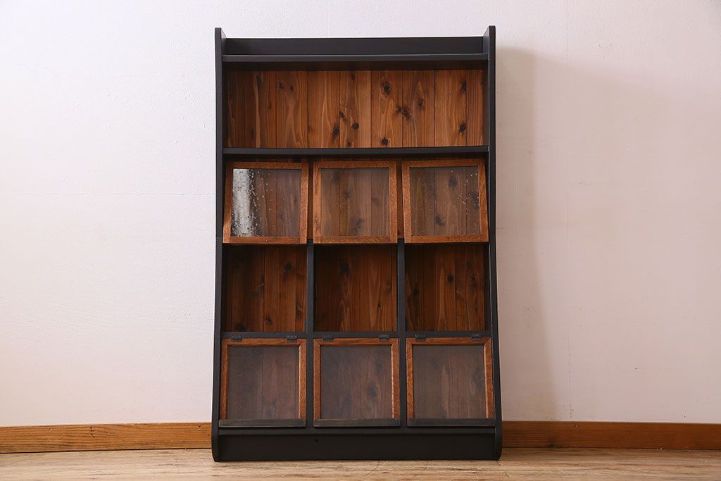 アンティーク パタパタ扉付き!ナラ材製の気泡ガラス入りペイント本棚(マガジンラック)(1)です。