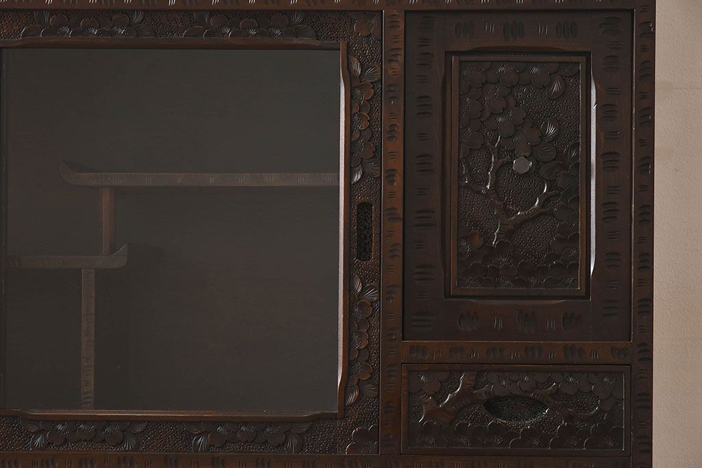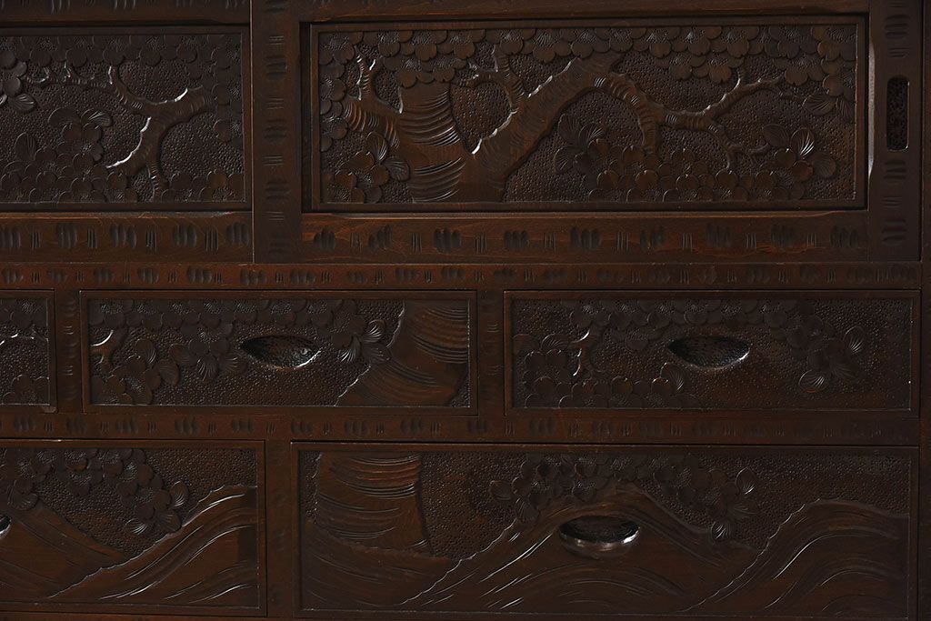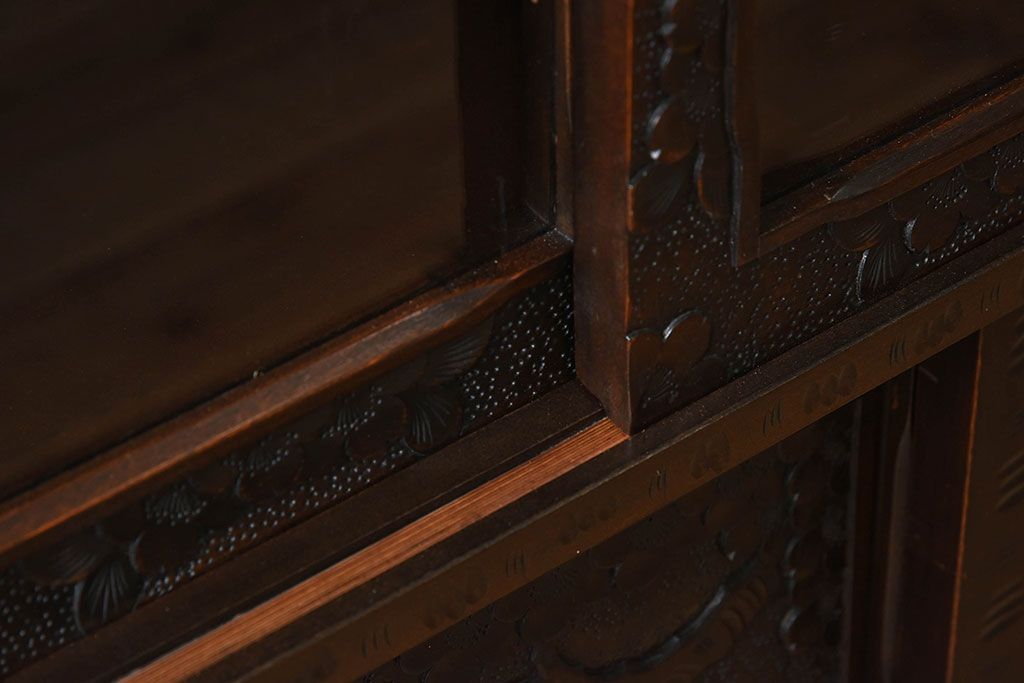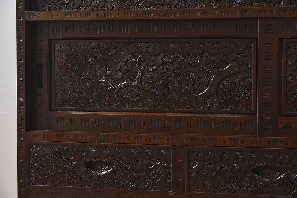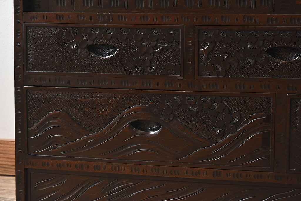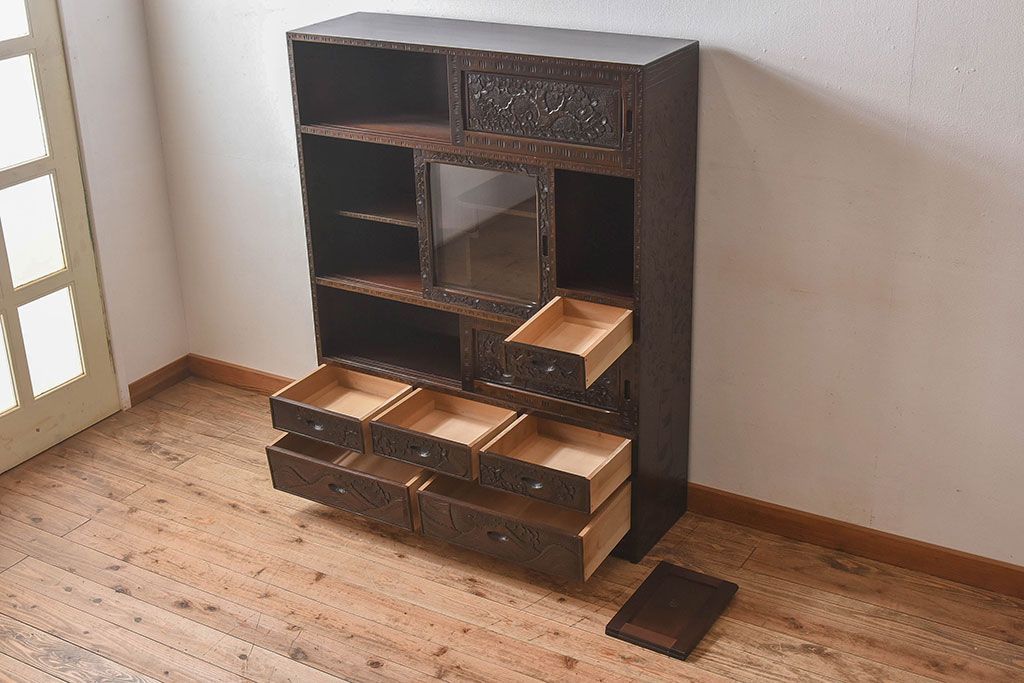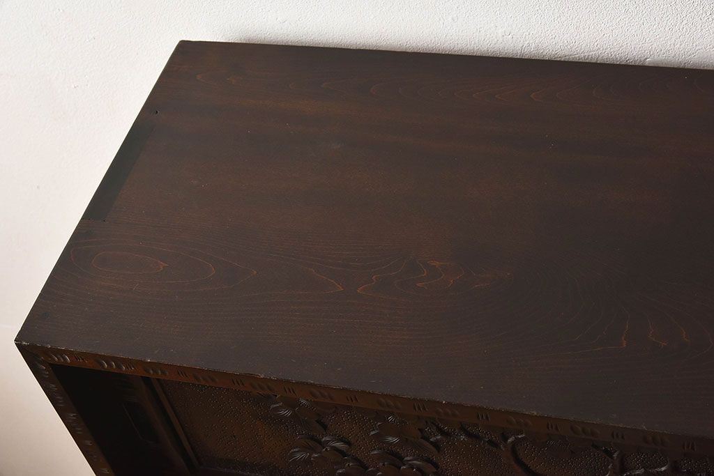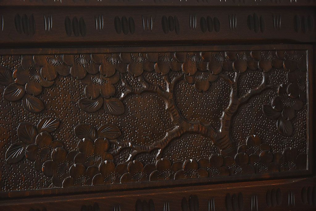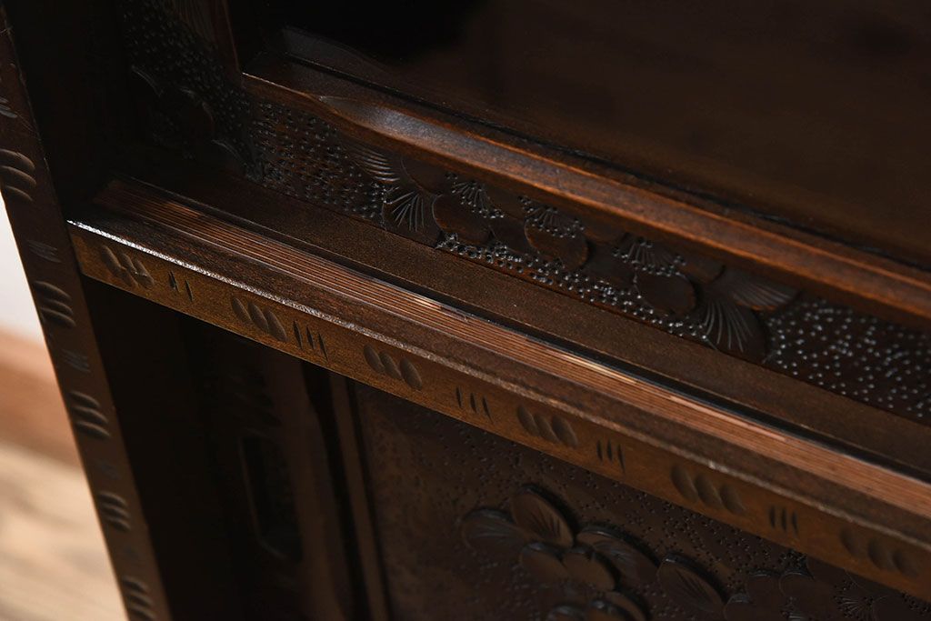 アンティーク家具 高級品 伝統工芸軽井沢彫り 総彫仕上げ 茶箪笥