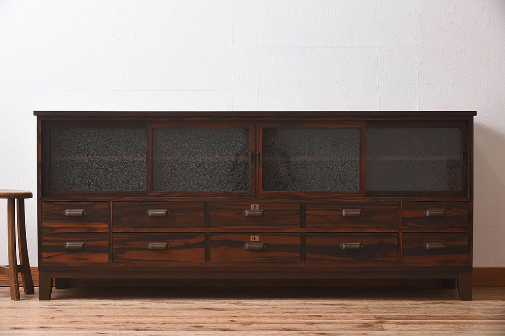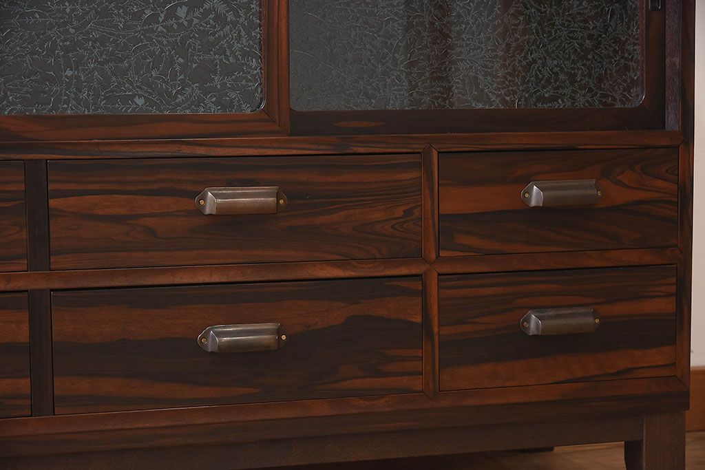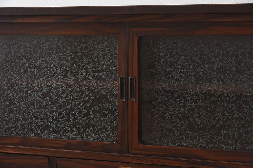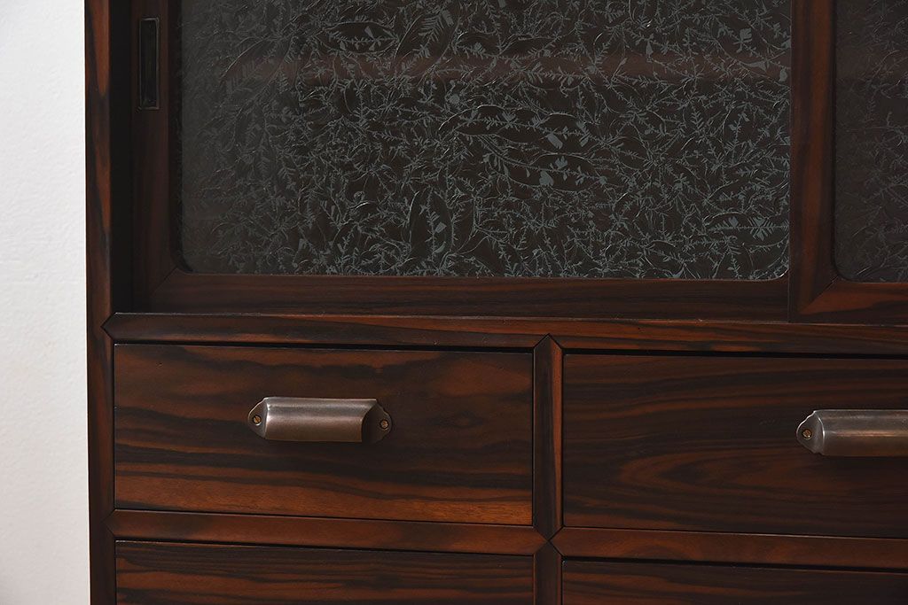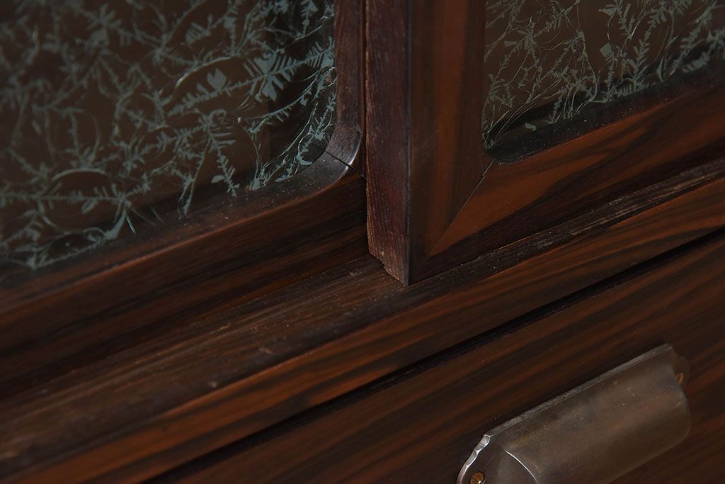 アンティーク家具 前面黒檀材 脚付き 結霜ガラス入り4枚引き戸のアンティークローボード