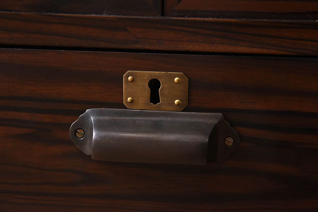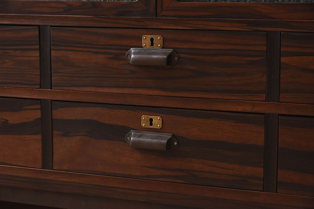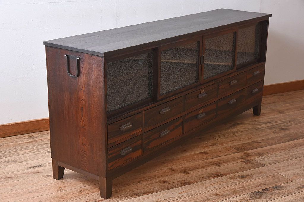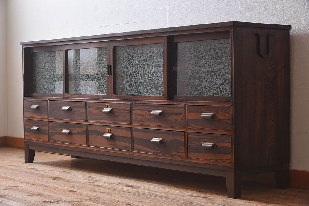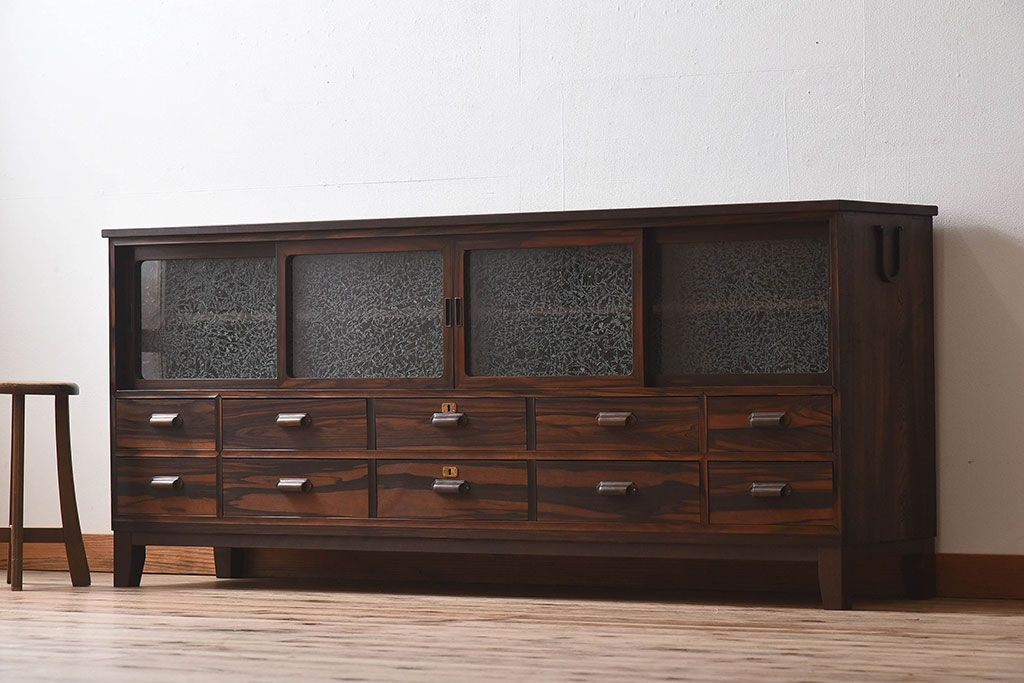 アンティーク家具 前面黒檀材 脚付き 結霜ガラス入り4枚引き戸のアンティークローボード